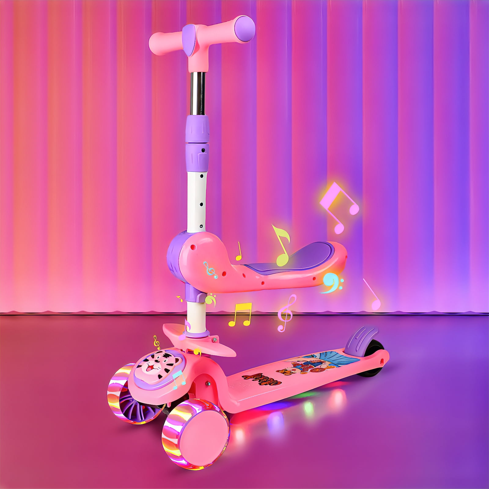 Hot Bee Pink Kids Scooter with Adjustable Seat, Foldable Design, Music and Lights, LED Wheels, Outdoor Activities Toy for Girls/Boys Aged 2 3 4 5 6+, Birthday Gift for Girls 3+