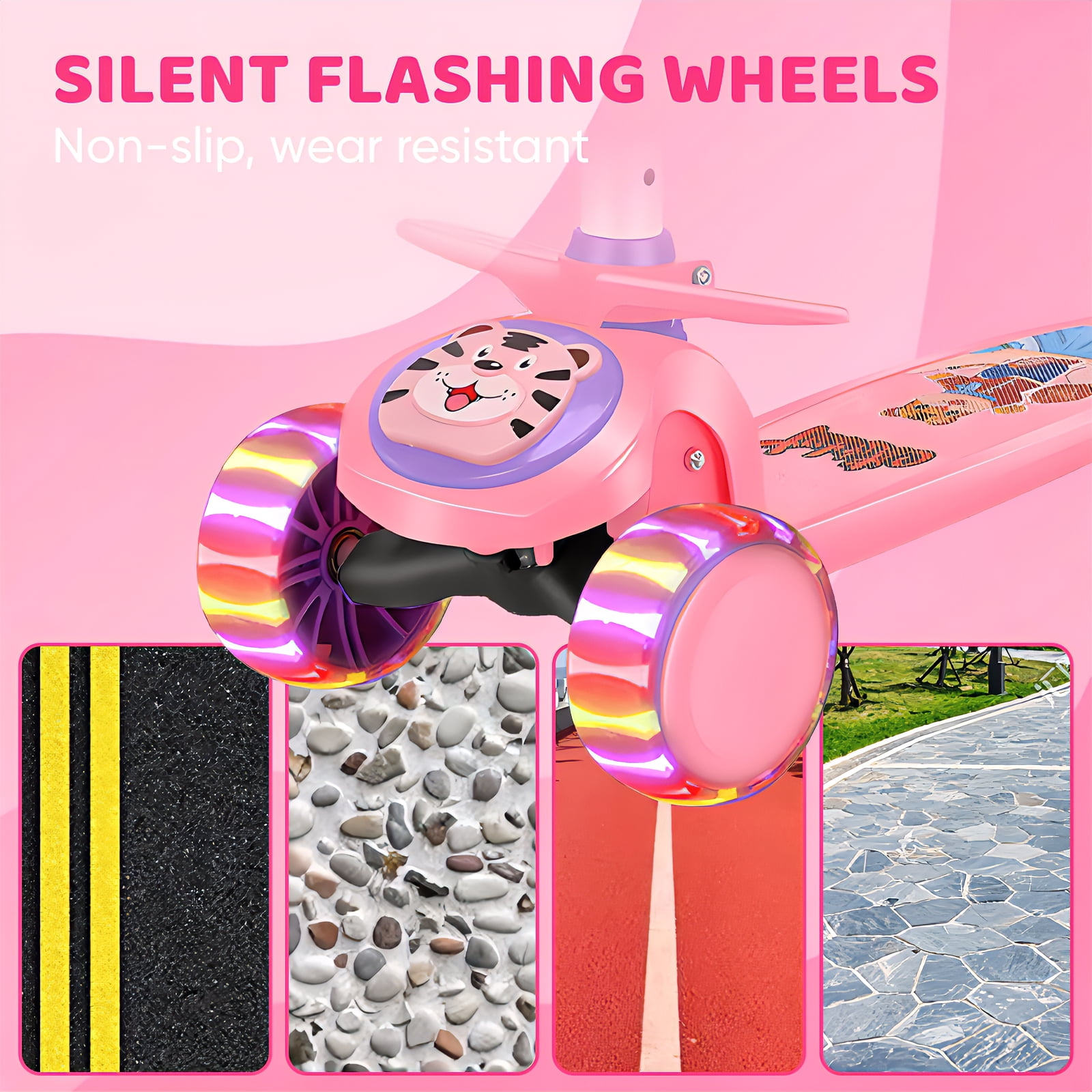 Adjustable Seat and Handlebar: The scooter is designed with an adjustable seat and handlebar, allowing for easy customization to suit your child’s growing height. This ensures a perfect fit as your child gets taller and provides optimal comfort for a smooth and enjoyable riding experience. Sturdy and Stable Construction: Constructed with high carbon steel and PP material, this scooter is incredibly durable, built to withstand the test of time. Its reinforced frame and stable design have been rigorously tested to safely support weights of up to 110lb, providing parents with peace of mind and ensuring long-lasting performance. Rotatable Saddle: The scooter outdoor toy features a rotatable and foldable saddle, offering your child the option to sit or stand while gliding around. This innovative feature adds a delightful element of fun, allowing for a dynamic and versatile riding experience that can be customized to your child’s preferences. Music and Lights: Immerse your child in an exhilarating adventure with the scooter’s vibrant lights and cheerful music. The captivating and colorful lights enhance the excitement, particularly during nighttime rides. The joyful tunes further amplify the overall enjoyment, making the riding experience truly unforgettable for your child. Safety and Comfort: Prioritizing safety and comfort, the scooter offers a sensitive rear foot brake that enables your child to swiftly stop the scooter whenever necessary. Its wide and anti-slip deck ensures stability and confidence, significantly reducing the risk of accidental slips or falls. The slip-resistant handlebar grip guarantees a comfortable and secure hold, empowering your child to ride with ease.