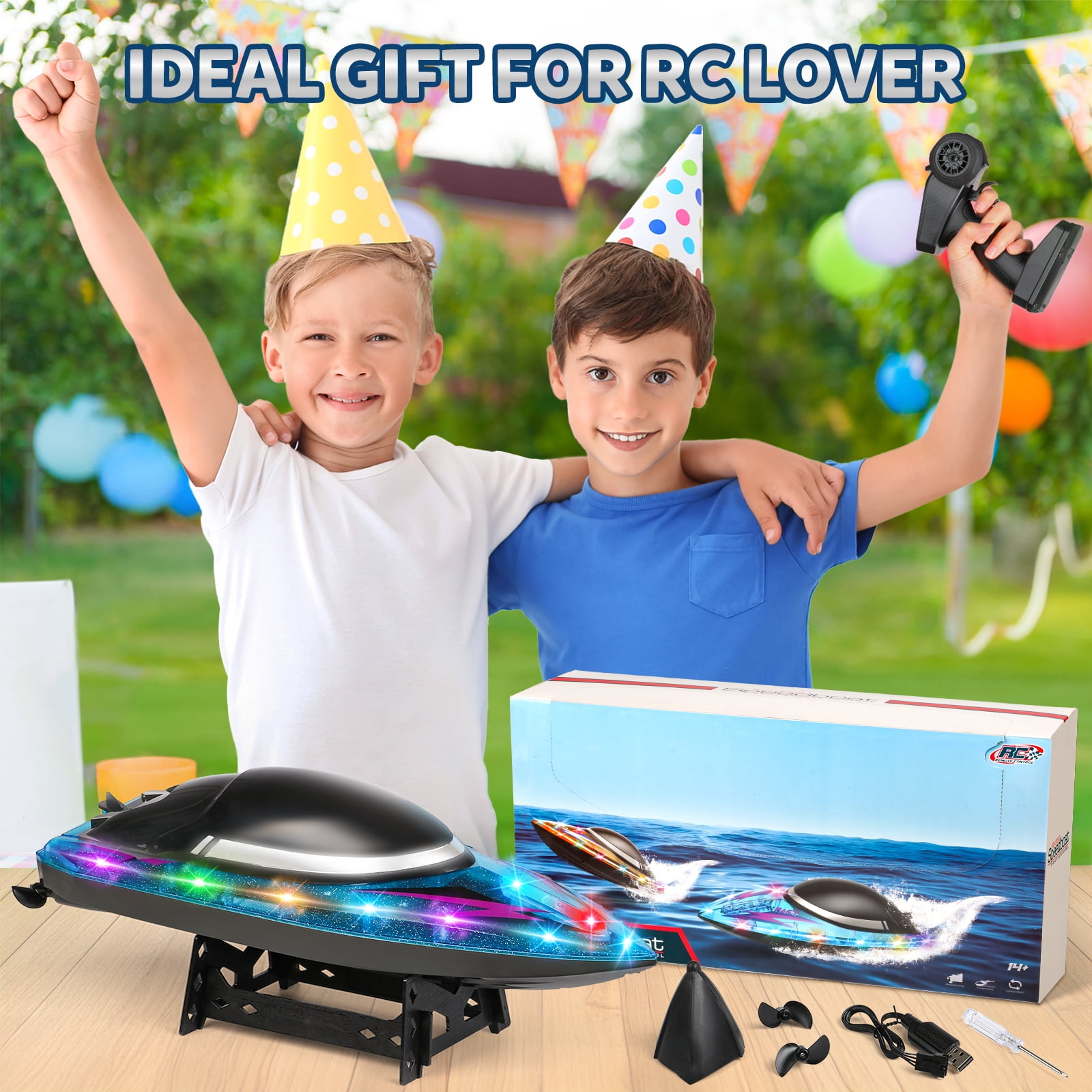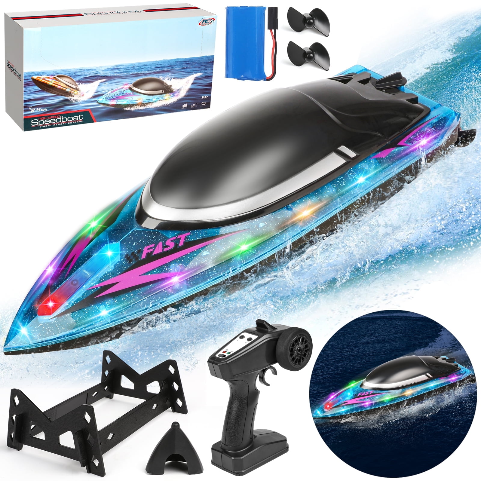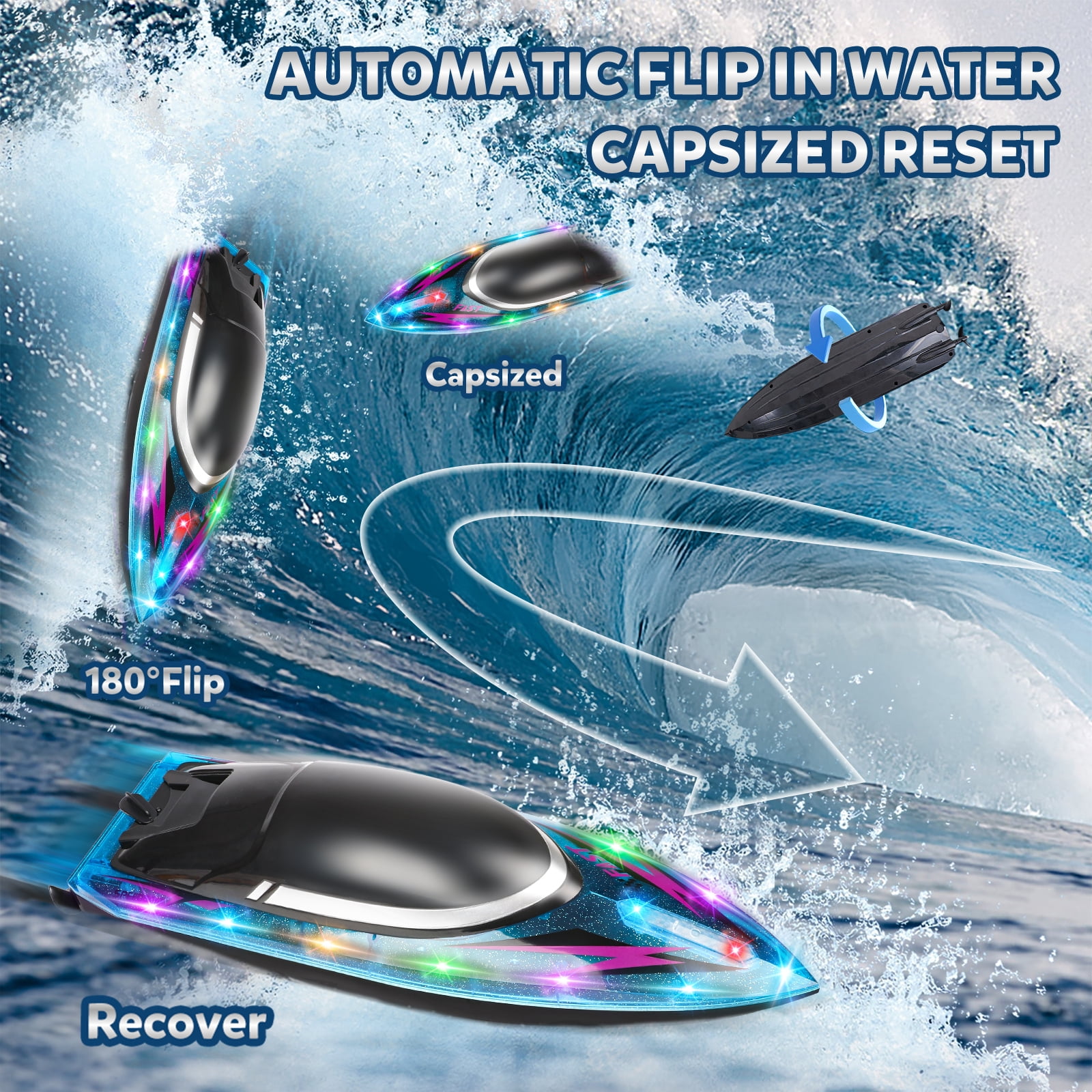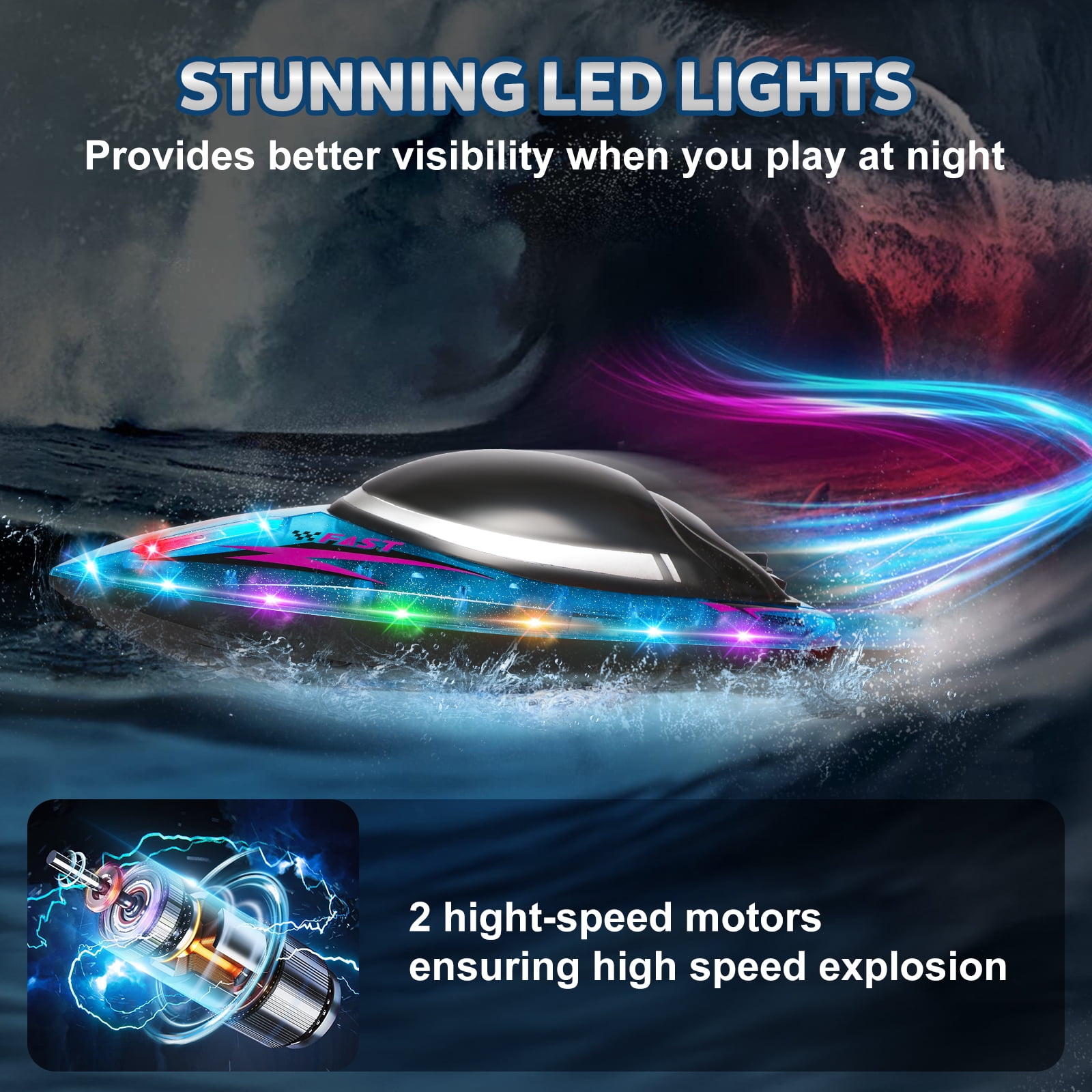 2.4 GHZ High Speed: 2.4 GHZ frequency controller supports multiple rc boats to race synchronously! The max speed up to 18 MPH(30km/h) allow you blow other remote control boats out of the water! Ideal rc racing ship toys for Pool and Outdoor! Capsize Recovery Feature: Self-Righting Hull Design gets the racing boat back to the game quickly while the boat is capsizing, this remote control boat provides all the necessary power and control. Responsive steering and full throttle control allows you to maneuver with ease, making it perfect for racing enthusiasts. Remote Control Toy With LED Light & Low Battery Power Alarm: With the sparkling LED lights in the boat, you can also have the controlling thrill of this rc boat at night. No need to worry about the battery power, the controller will give you a heads up when the boat is running out of power. Built To Last: This completely waterproof racing boat is made with high-quality materials that can withstand rough conditions and extreme racing conditions, ensuring it remains reliable and durable over time. Perfect Gift: Looking for the perfect gift for the RC enthusiast kids&adults in your life? Look no further than this high speed racing RC boat, which is sure to provide hours of entertainment and excitement. It is an awesome outdoor toy gift for you!
