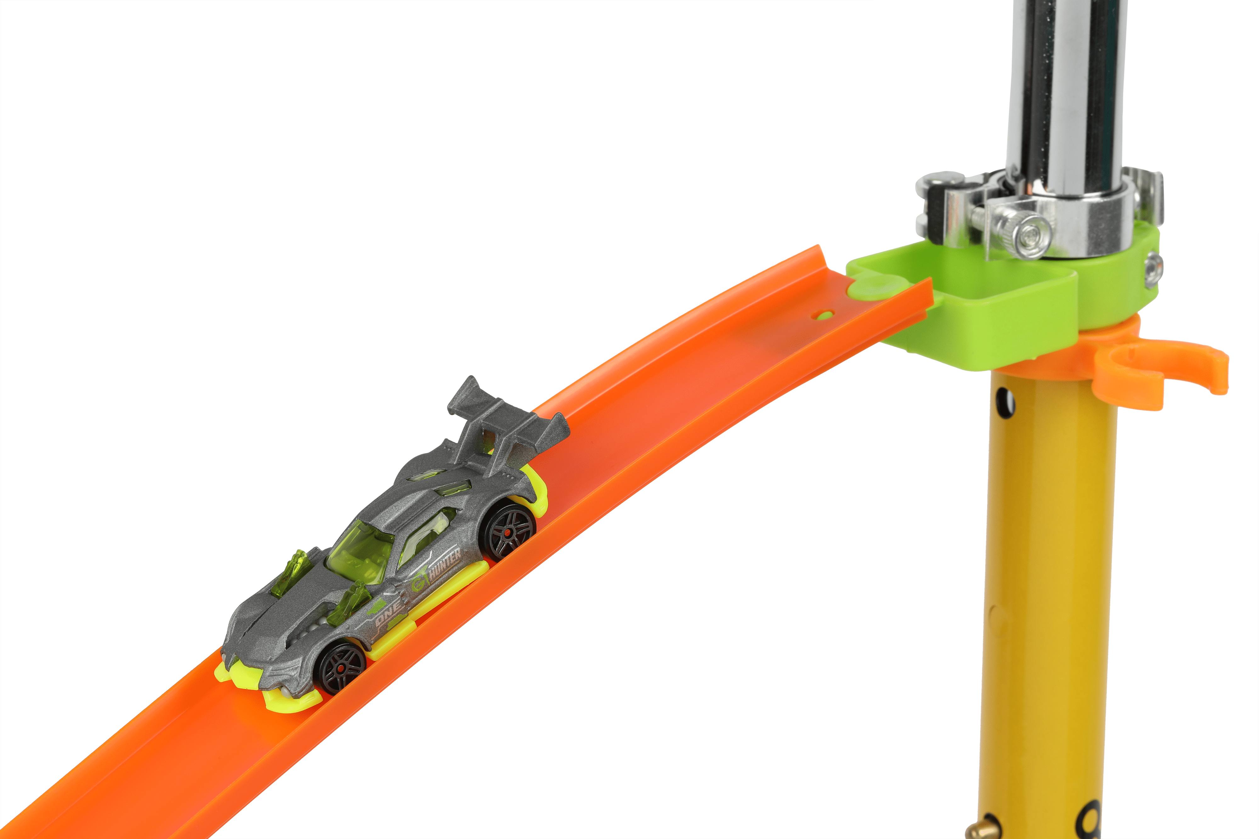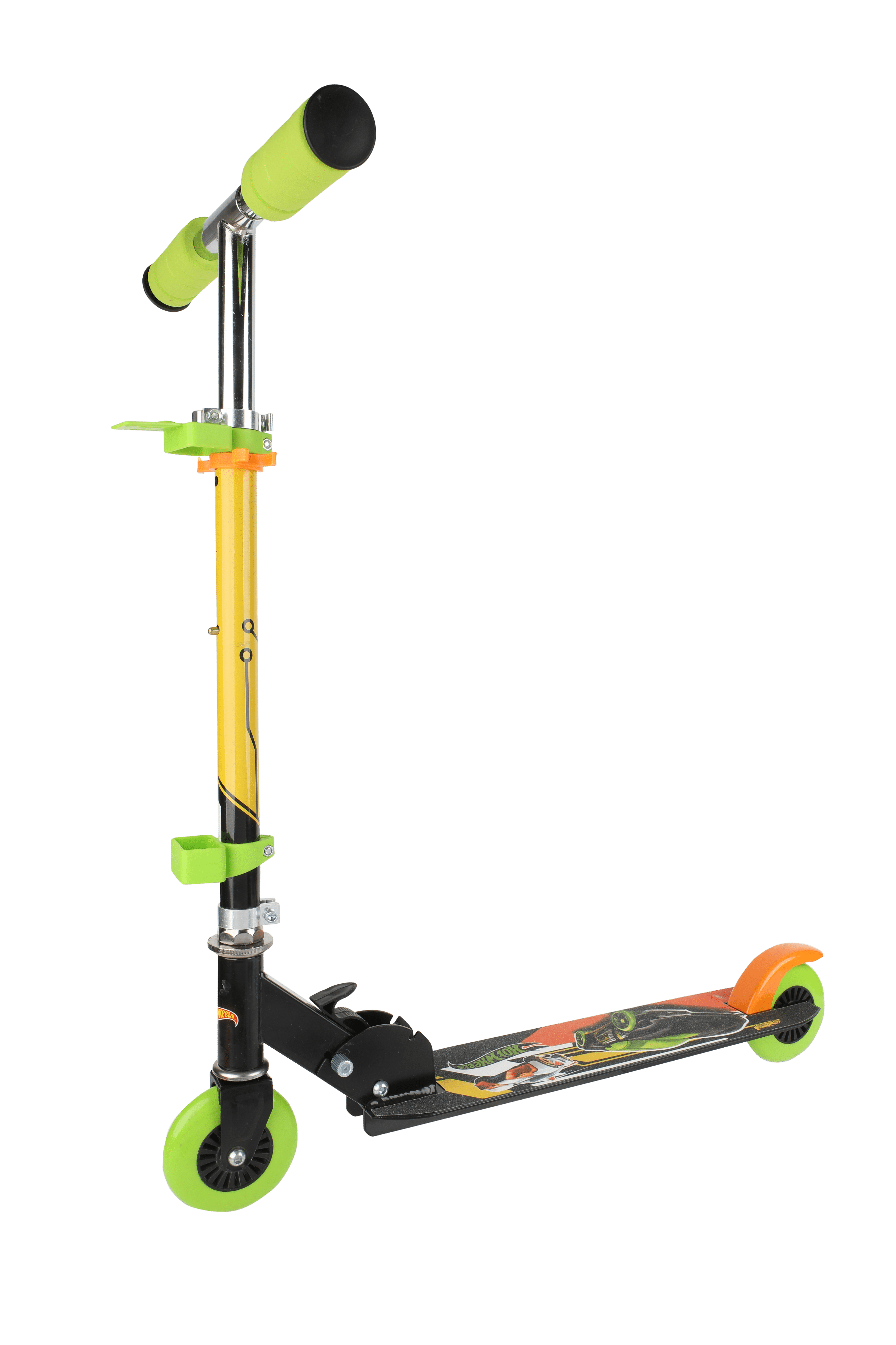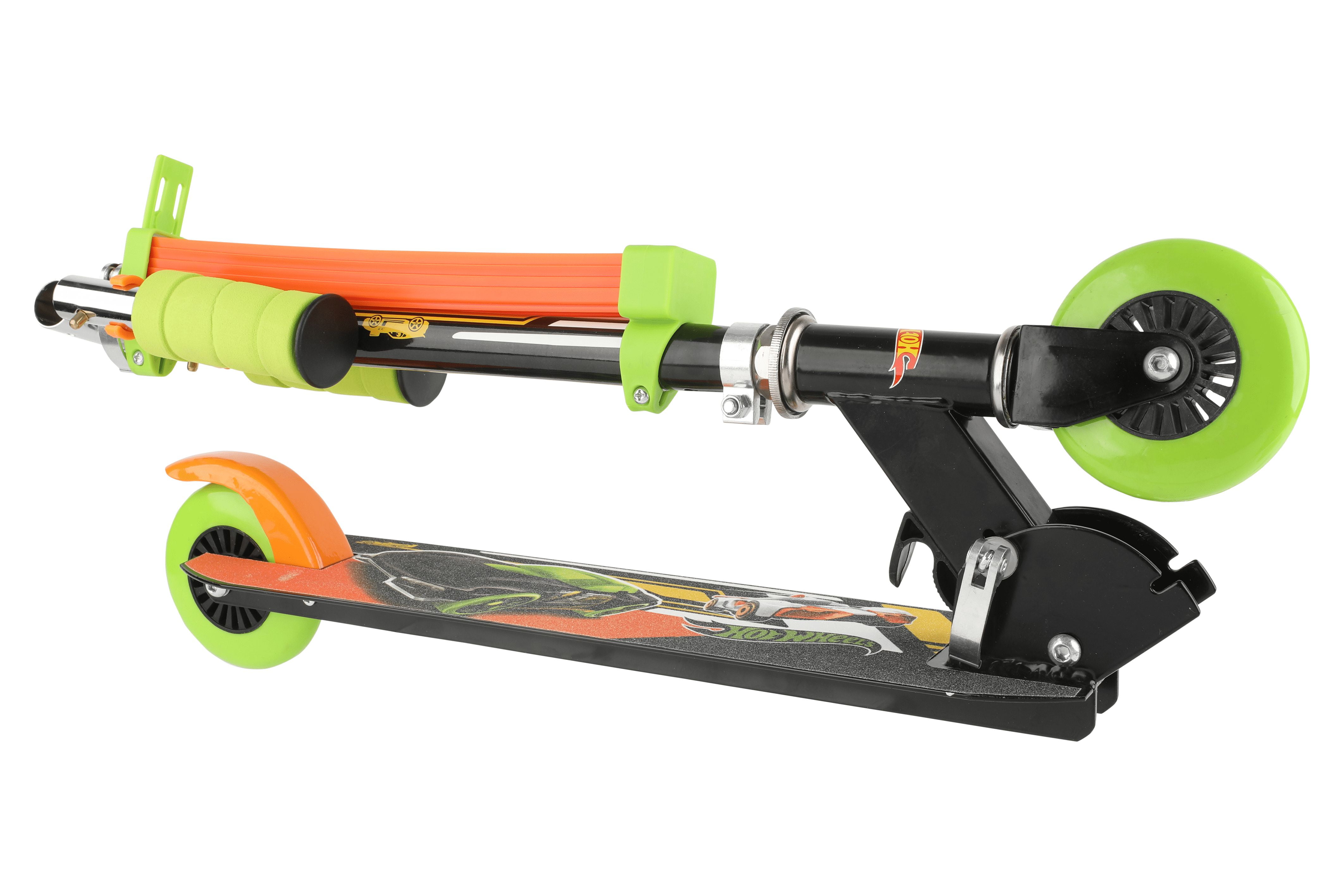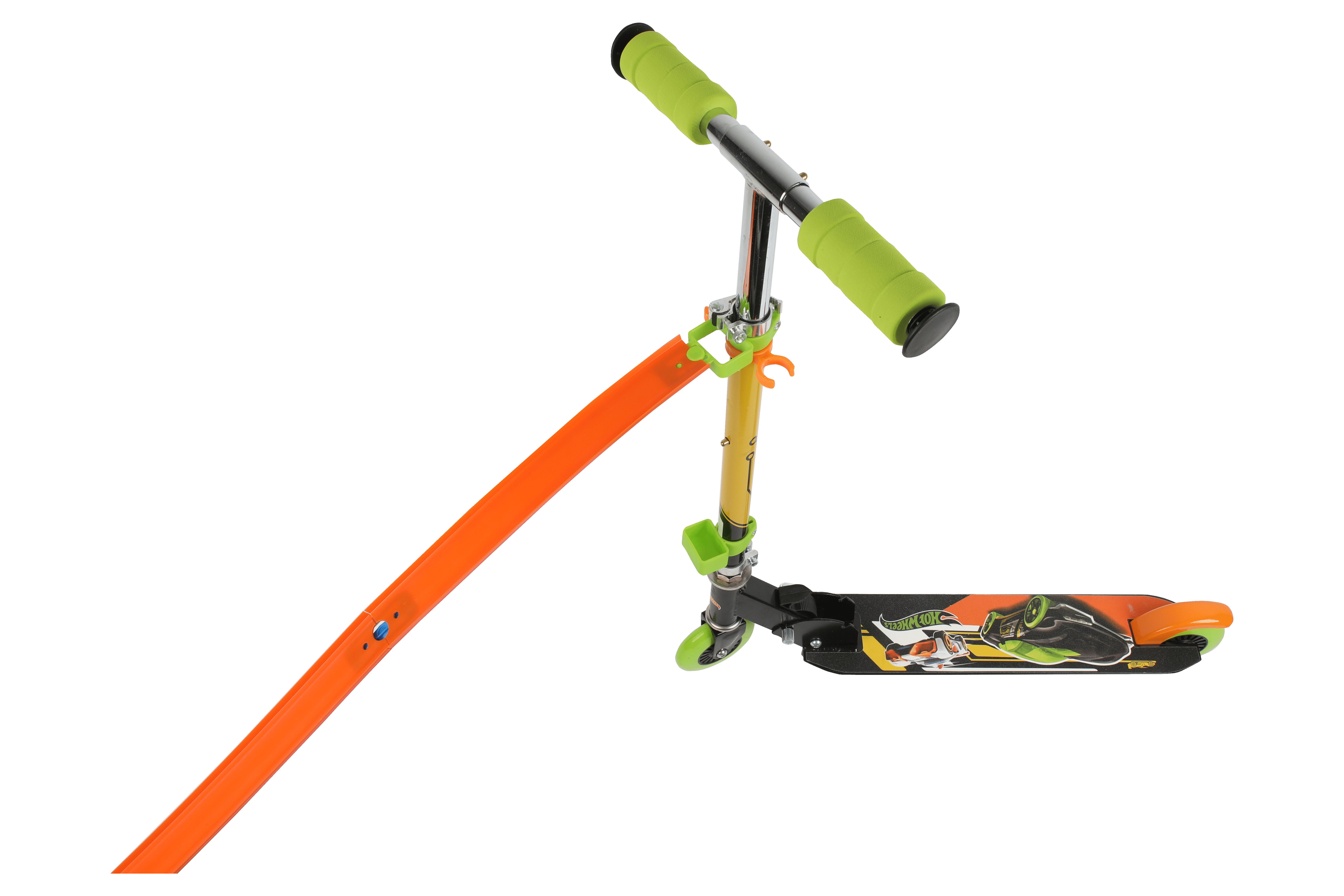 Hot Wheels Ride & Race 2-wheel scooter Comes with 2 Die-cast cars with a built-in track storage! Strong, lightweight metal deck for durability Features a quick stop rear brake as an added layer of safety Easily folds to a compact size that can fit in cars, trucks, or closets Foam grips for a comfortable scooter ride 120mm Front and Back PVC Wheels Great for male beginners and skate veterans alike