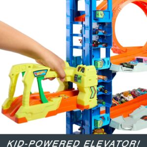 – Take the two-car elevator to the next level where kids can launch the 2 included Hot Wheels cars straight from the elevator into a side-by-side race