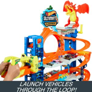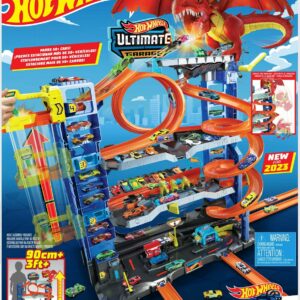 - Race, stunt and do battle with a dragon in the multi-level Hot Wheels City Ultimate Garage