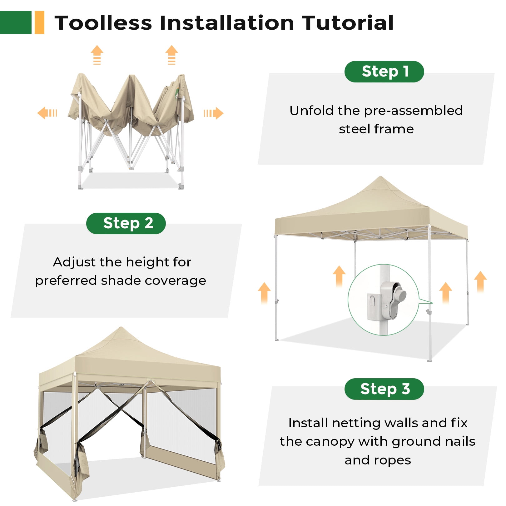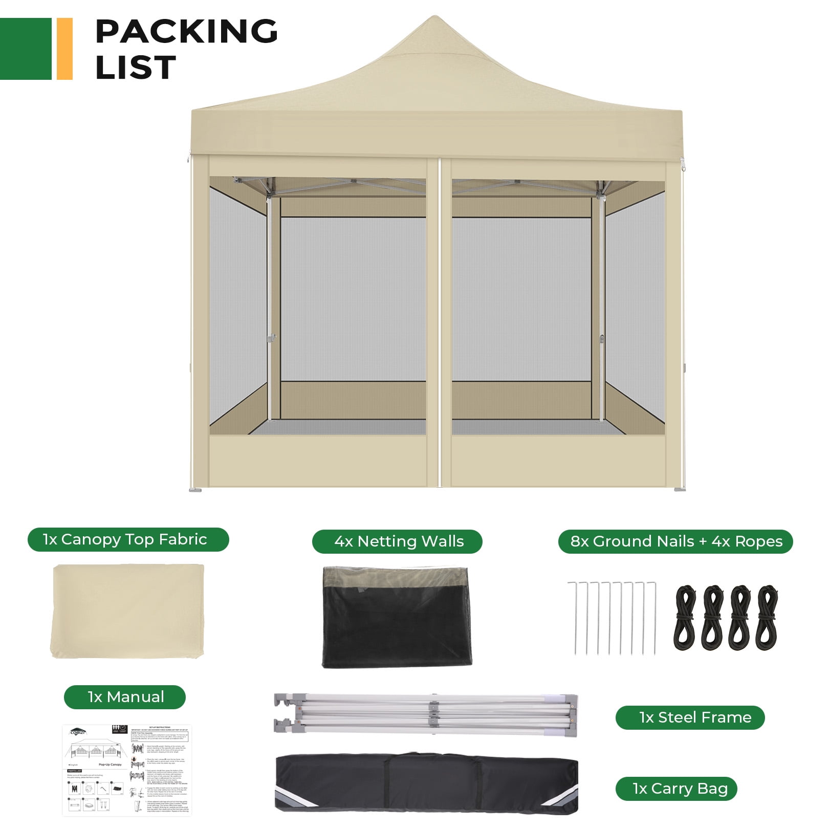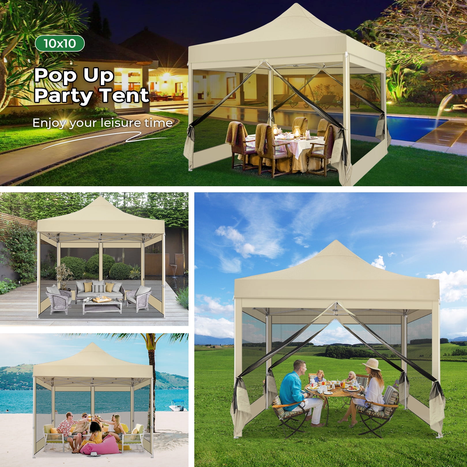 【Multifunctional & Removable Netting Sidewalls】The removable netting sidewalls design of this pop up gazebo allow you to breathe in the fresh air, feel the cool breeze, enjoy the view and fully experience nature while being free from mosquitoes. 10x 10ft canopy can provide 100 square feet of space for 8-10 people,suitable for a variety of occasions such as conducting parties, patio barbecues and exhibition activities. 【Commercial Grade Heavy Duty Frame】The sturdy full truss frame increases the load bearing capacity, stability and durability of outdoor tent for backyard. The tube diameter is 1.26”, while most regular tents are only 0.98” in tube diameter. The surface of the frame has anti-rust spray paint, you don’t need to worry about the rust of the bracket at all. 【Easy up Canopy Tent】This patio gazebo is easy and quick to set up and put down, 2-4 people can quickly set up this outdoor canopy in minutes without tools and fold it up when not in use. 【3 Adjustable Heights】The support poles of this pop up screen tent are designed with height-adjustable finger buttons, you can use it to adjust height (86’’ 90’’ 94’’) according to your needs. The height adjustable design allows you to share the same joy with your taller friends! 【Waterproof & UPF 50+】The top fabric of this screen house is made of 420D PU coated oxford fabric, which not only blocks 99% of UV rays, but also 100% waterproof (waterproof pressure is 2.1psi). The strong and non-tearable fabric can block the sunlight, rain and snow for you, suit all seasons.