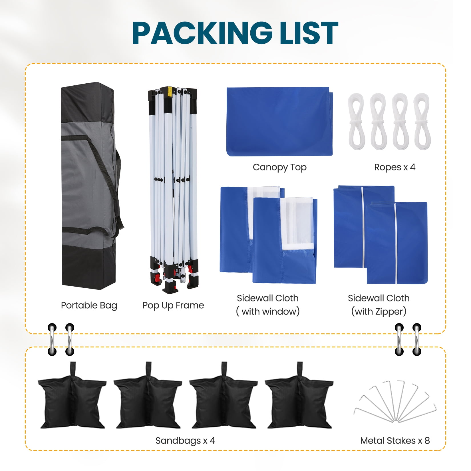 【Superior Quality】: 10×10 Pop up canopy features an oxford cloth top with a silver coating and a durable alloy steel frame. The silver-coated fabric reflects UV rays for sun protection and keeps the interior cooler. It’s tear-resistant and abrasion-resistant for long-term use. 【Water-Resistant Design】:The extended ceiling and high peak design facilitate rainwater runoff, preventing pooling. Ideal for outdoor events like farmers markets and tailgating. 【Easy Setup and Storage】:Adjustable to three heights—114 inches, 118 inches, and 122 inches—10 x 10 pop up canopy tent can be set up by 1-2 people without tools. Detailed installation videos and instructions are provided. Contact us if you encounter any issues during setup. 【Portable and Compact】:Offering 100 square feet of shade, this 10×10 canopy can accommodate up to 10 people. When packed, it measures 45.45″ x 8.66″ x 10.24″, fitting easily in most car trunks. 【Package Includes】:1 straight leg canopy, 4 weight bags, 4 stakes, 4 ropes, and 1 instruction manual. Compact enough for easy transport to tailgates, the beach, the park, or wherever your adventure takes you. Specifications: Brand:Hoteel Tent Type: Pop Up Canopy Tent Material:Alloy Steel Color:Black/Blue/White/Gray/Dark Blue/Khaki Item Weight:42.99 Pounds tem Weight:43 pounds Product Dimensions:45.45″L x 8.66″W x 10.24″H Adjustable Height (Center Height):114″-118″-122″ Ultraviolet Light Protection:Yes Water Resistance Level:Waterproof Package Content: 1 x 10’x10′ Canopy Steel Frame 1 x 10’x10’Canopy Top Cover (100% Waterproof) 1 x straight leg canopy 4 x weight bags 4 x stakes 4 x ropes 1 x instruction manual. (This manual provides more information on accessories and a detailed installation process.) Installation Tips: The ez-up canopy frame needs to be pulled horizontally until it is fully unfolded so that the movable switches at each corner can be easily pushed up and locked. How to stick the active switch in the corner: Hold the vertical leg with one hand and push it up with the other hand to snap it into place. Note: Store the canopy tent in a dry place. Do not use this party tent in heavy stormy weather, to extend its service life.