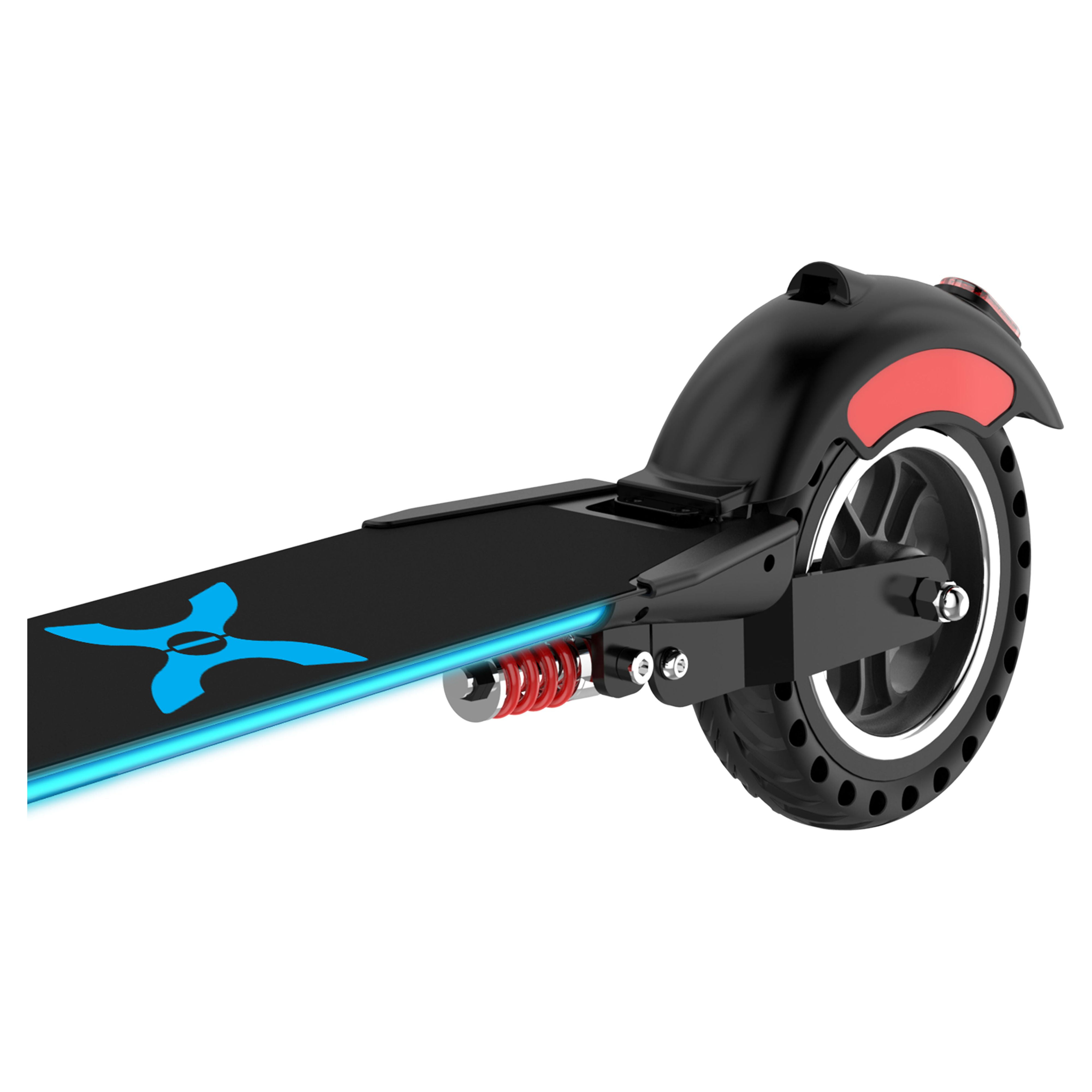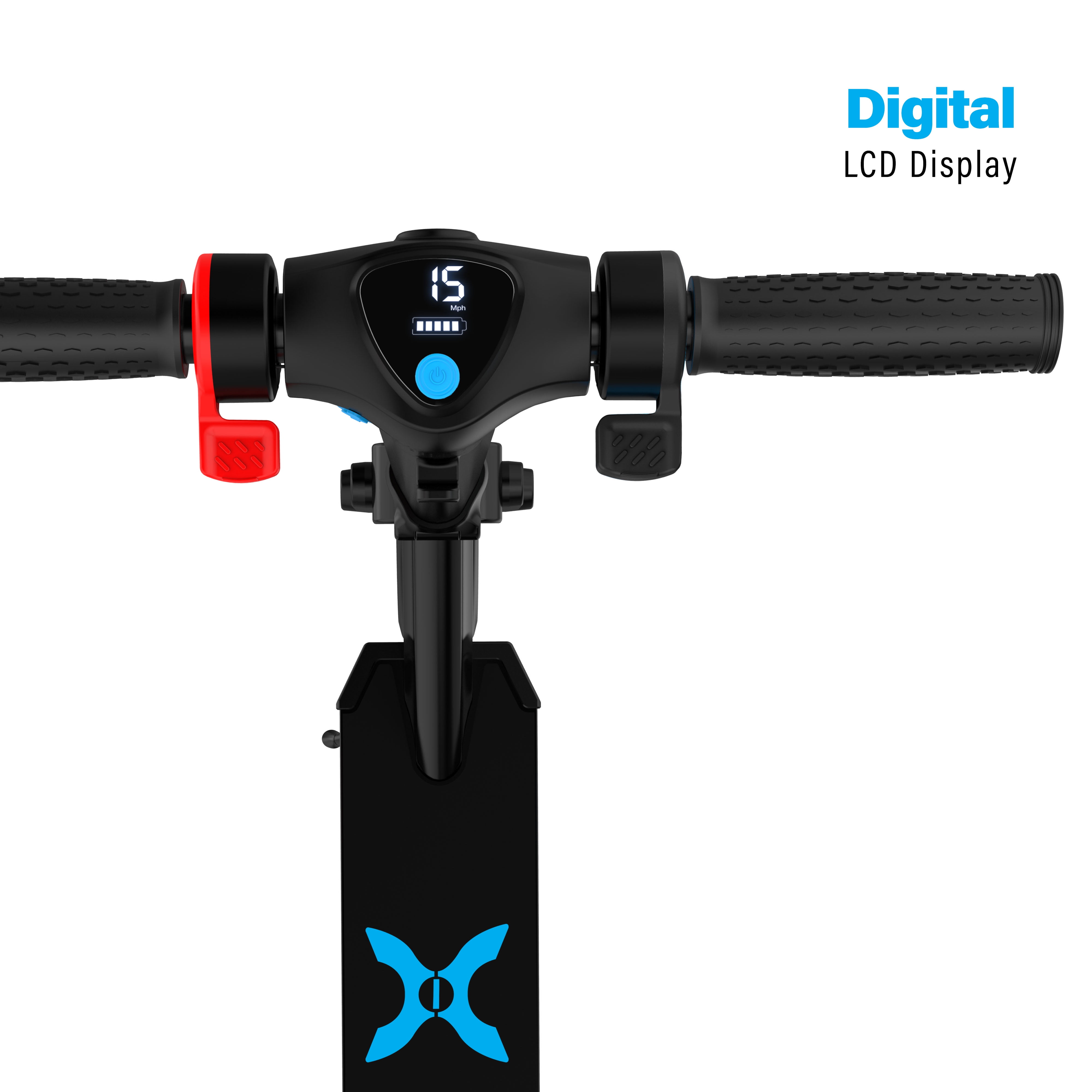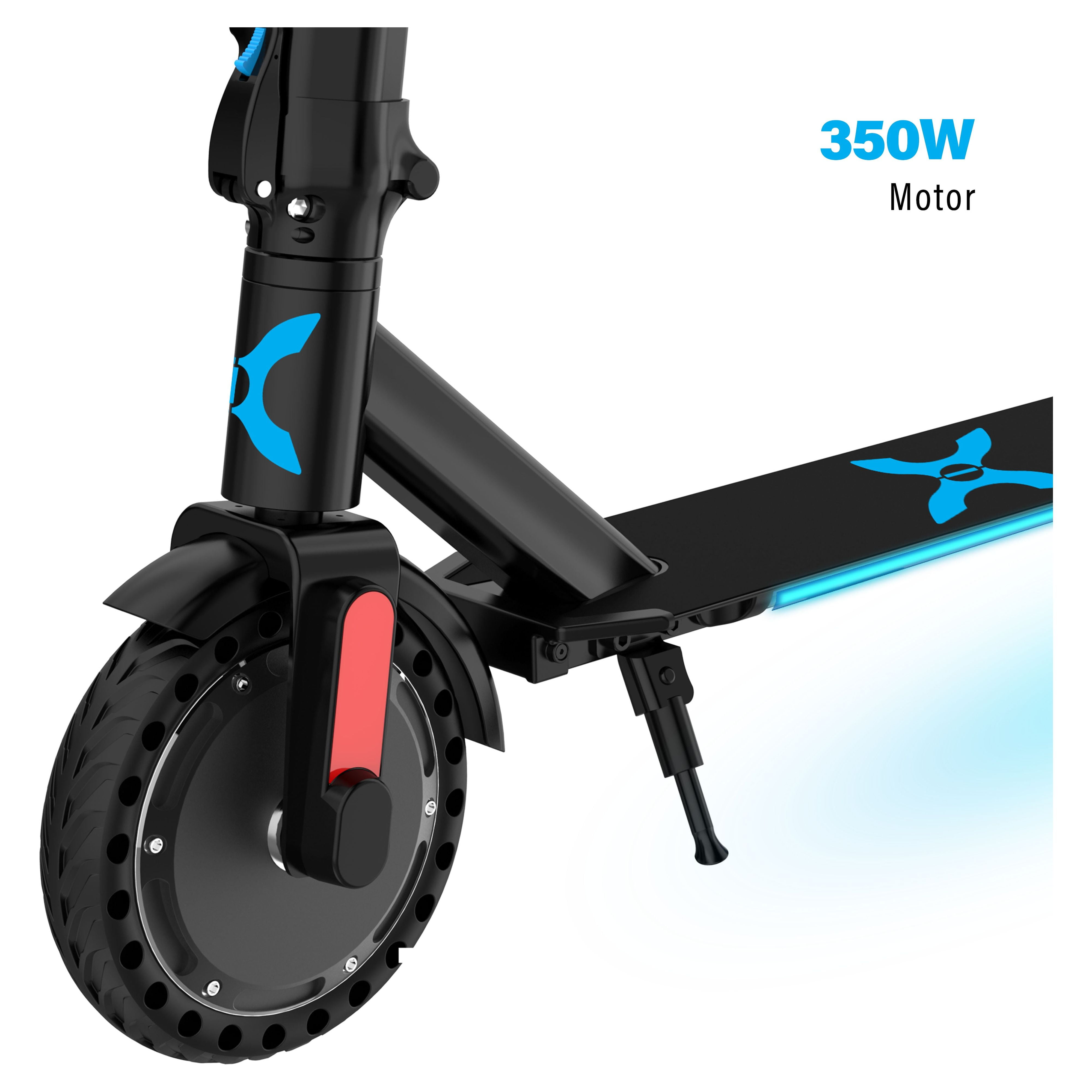 App connectivity with learning modes Built-in rechargeable Lithium-ion battery Electronic throttle and foot brake LED headlight Built-in reflectors Built-in suspension 300w brushless motor 6.5″ tires front and back 7 miles max range 15 mph max speed 264 lb max weight 10° max hill incline