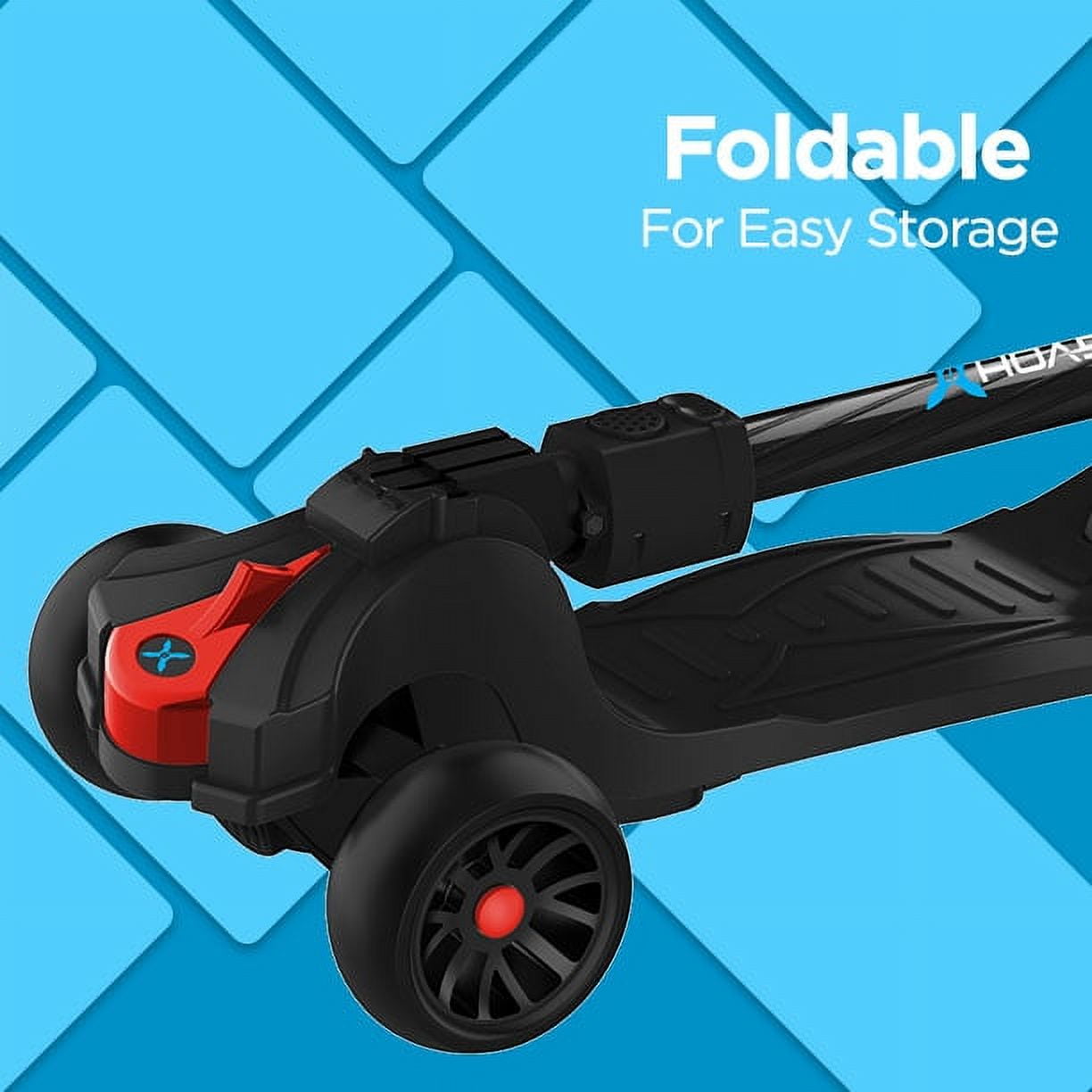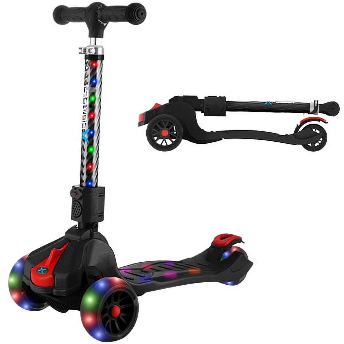 Safe: For Kids Ages 5+ Max Weight: 110 lbs Portable: Folding Design Easy to use: Just Point-to-Turn Cushioned Handles Multi-Color LED Lights Built-in Foot Brake