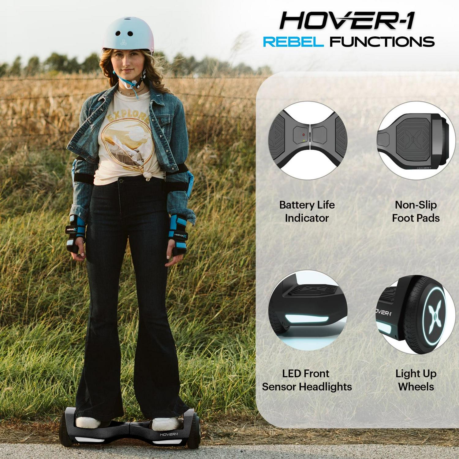 Hover-1 Rebel Hoverboard for Teens, LED Headlights, 6 mph Max Speed, Black