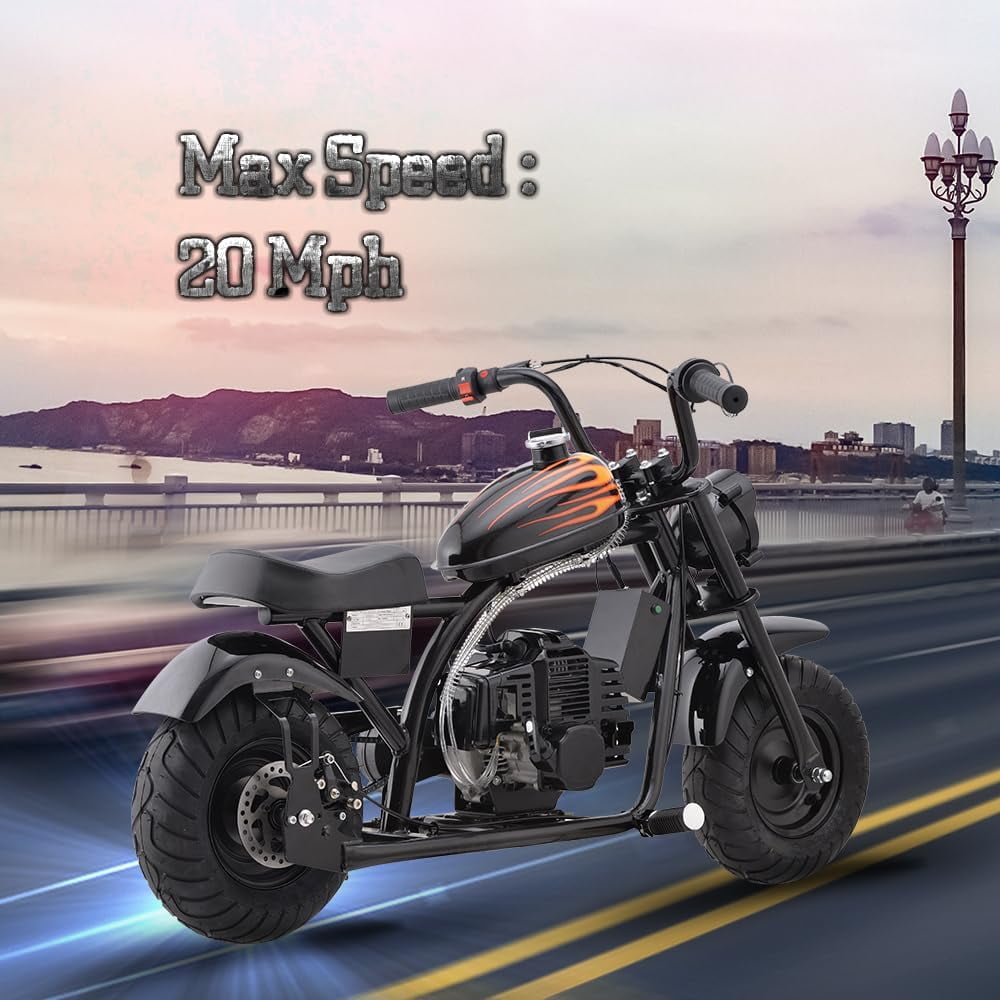 Key information: bike dimensions 46.65 L x 25.2 W x 27.56 H, Net weight 52.91lb, handlebar assembling required, Oil mix required( Read detail in Manual ), Pull Start, Handle throttle, pressure air tires. The fashion chopper bike is different, rear disc brakes and a big tank can more safer and play longer. Riders can experience the speed of it, but safety power with the 49.4 cc 2-stroke engine and fully automatic chain transmission system. Maximum speed will be 20 mph for this dirt bike