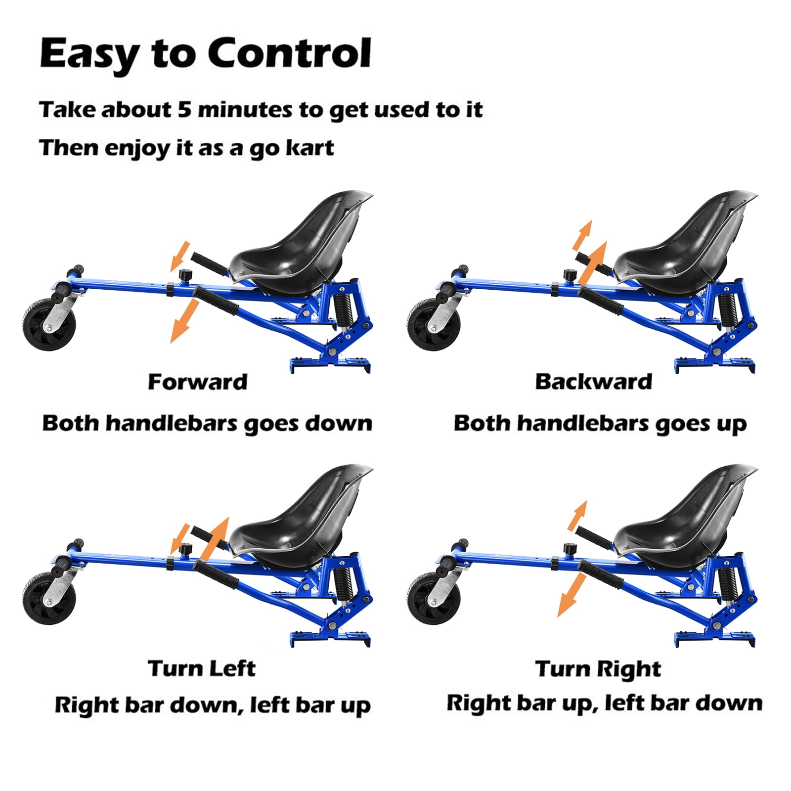 Hoverboard not included UNIVERSAL COMPATIBILITY- This accessory is suitable for popular 6.5″-10″ hoverboards (does not fit the hoverboard with a bar in the middle). The go kart conversion kit will turn your hoverboard into a go cart for children to ride on, adding tons of fun. OFF-ROAD SHOCK ABSORPTION – The shock absorption system reduces lots of discomfort caused by vibrations and offers ultimate comfort, while big off-road tire conquers various uneven roads, improving safety and ensuring long-lasting fun. STURDY & DURABLE- Made of thickened heavy-duty metal, the well-built reinforced frame can hold up to 280lbs, sturdy enough for an adult to sit on. The seat and velcro straps are strengthened either. FUN FOR ALL AGES – Designed both for kids and adults, 7 adjustable length options provide the most suitable length for riders. Simple manual control system ensures free driving, easy for younger kids to operate. SIMPLE INSTALLATION- It’s much easier to assemble than usual hoverboard seat attachments. After only several minutes, you can drive it zooming around hours and hours again. WARRANTY – Love it or we’ll buy them back from you, no question asked. Full Refund Within 30 Days OR Free Go Cart Replacement. Accessories such as seat, Velcro straps, handles, screws, wheels, we will send new one with ZERO freight charge. If any parts missing or any accessories request, please feel free to contact us.