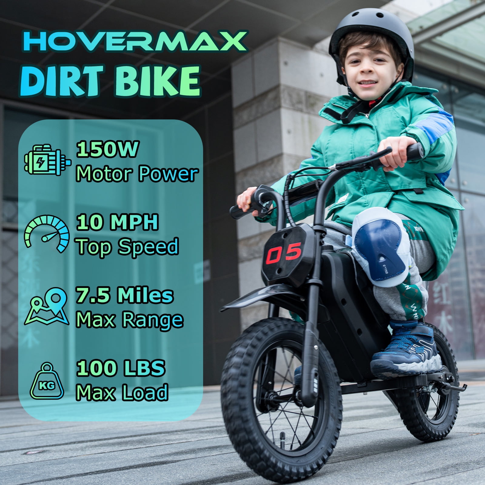 HOVERMAX H13M Electric Dirt Bike for Kids is an exhilarating ride designed for little adventurers aged 3-9, offering a perfect blend of power, safety, and comfort for budding off-road enthusiasts. Equipped with a robust 150W motor, this dirt bike can support up to 100 pounds and reach a top speed of 10 MPH, making it suitable for a range of young riders. The 12V 4AH battery provides a generous range of up to 6 miles on a single charge, allowing for extended play sessions. ,The 12″ wear-resistant rubber wheels offer excellent traction, while the comfortable, non-slip seat ensures a pleasant ride for your little one. Give your kids the gift of adventure with the HOVERMAX H13M Electric Dirt Bike, and let them experience the thrill of a comfortable off-road ride that they’ll love!