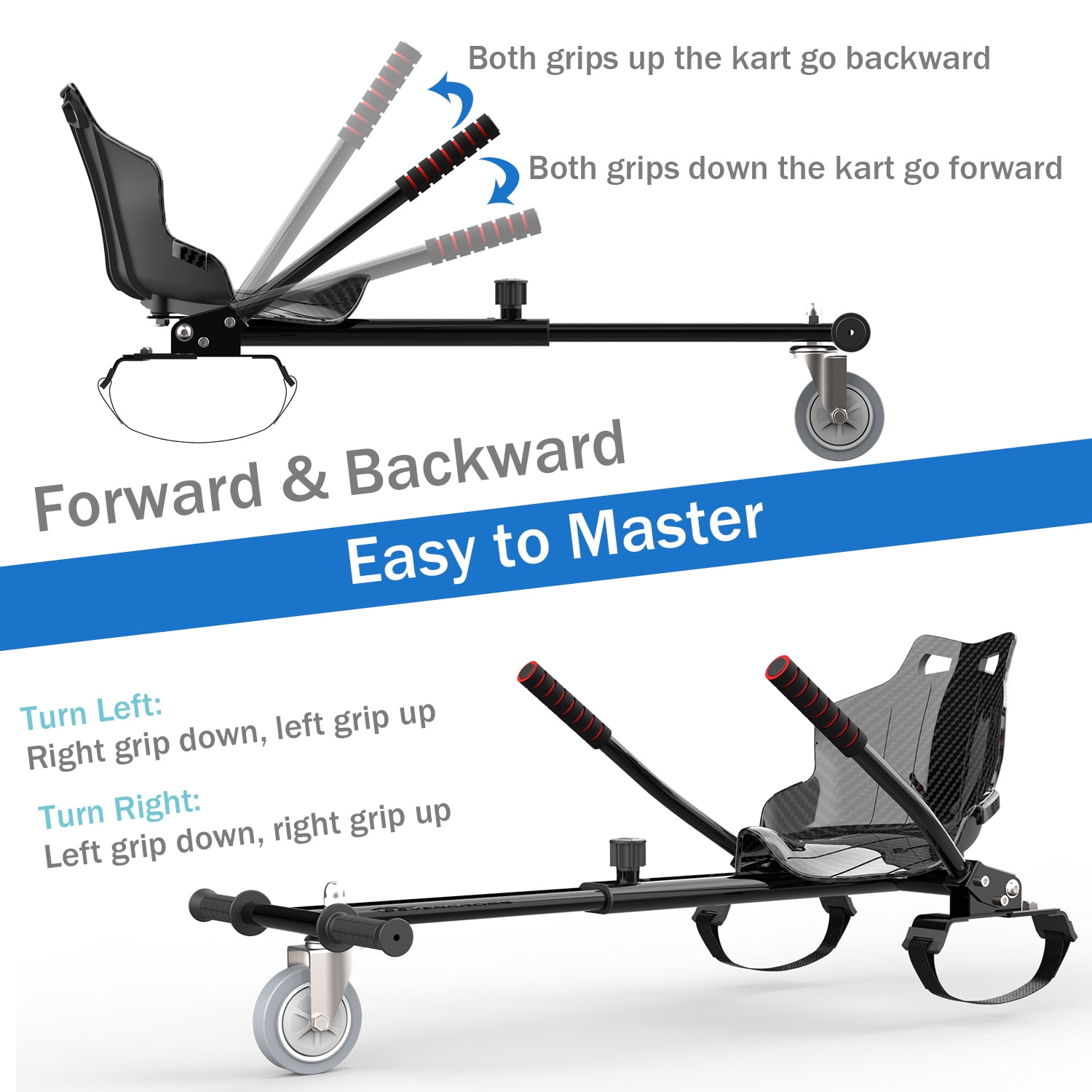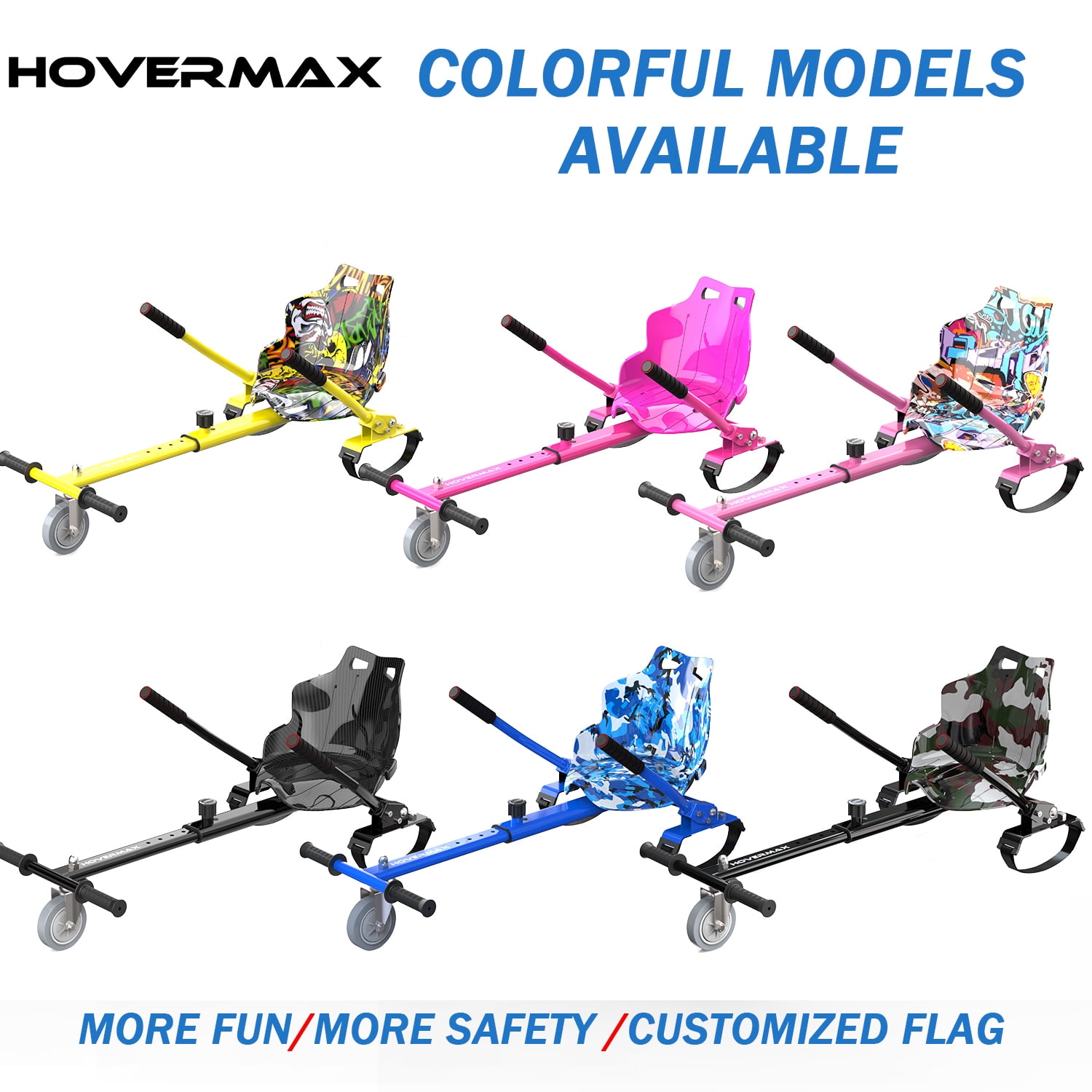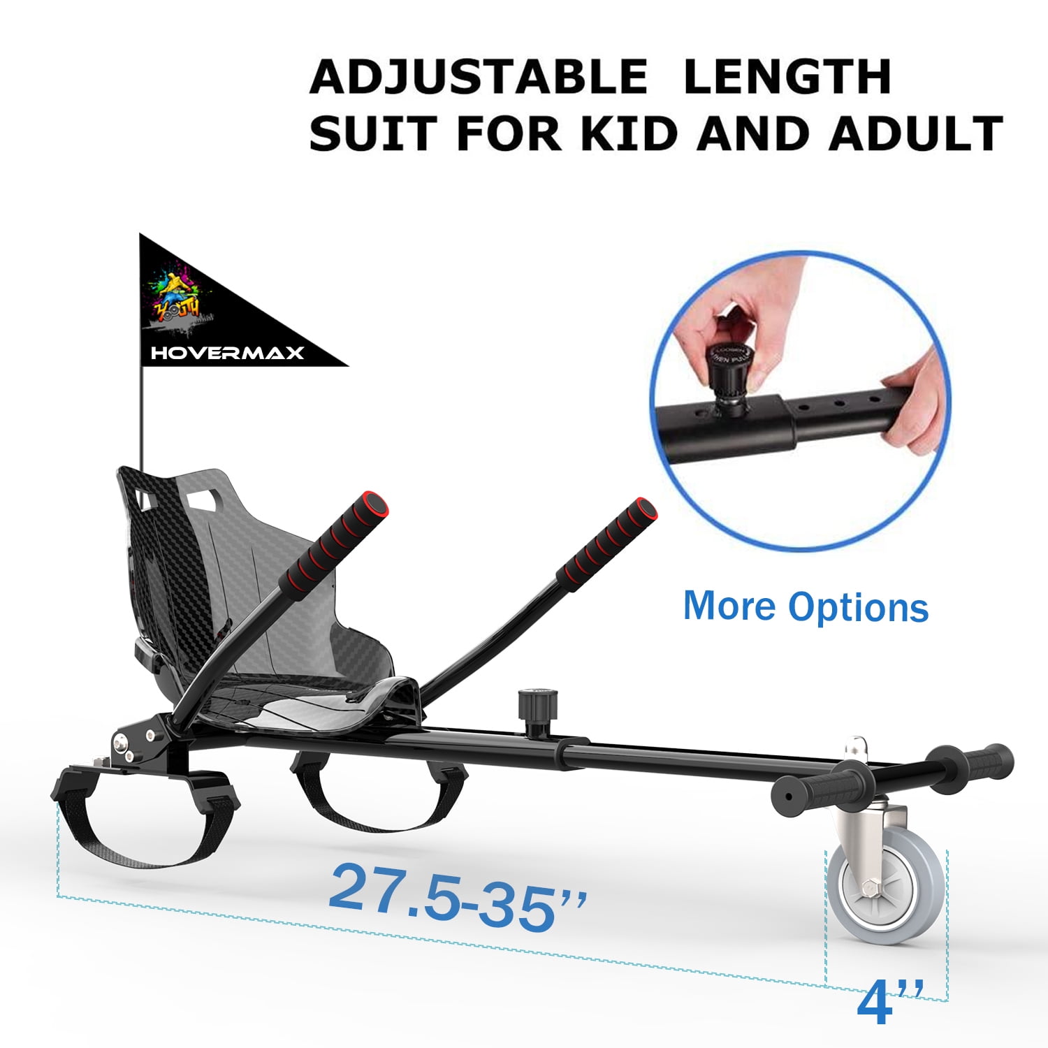 ★ HOVERMAX Bring You A Wonderful Enjoyment- Transform your hoverboard into an all new exciting hoverkart!! – Do you want to have fun riding hoverboard kart? – Or maybe you want to make amazing gift for your kids? All the details of HOVERMAX hoverboard karts are designed for you to have a fun & fresh, safer & more comfortable driving experience. ▶ FUN & SAFETY HOVERBOARD ATTACHMENTS: Compatible for 6.5” 8” 8.5” 10” hoverboard, which is safer for kids because they sit on the hoverboard seat instead of standing on hoverboard, there is less injury risk of falling down at high speed. ▶ HOVERBOARD ACCESSORIES & ADJUSTABLE FRAME: Our seat for hoverboard is suitable to various ages and height, there are several gear positions to adjust the length from 31” to 44.5” to meet your needs. ▶ EXTRA STRAPS & SIMPLE ASSEMBLE: We offer extra straps and simple assembly instructions and all necessary tools with this hoverboard seat attachment so that you can assemble and attach this hoverboard cart to your hoverboard in minutes. ▶ IDEAL GIFT & WARRANTY: A great gift with professional after sales service, 30 days return service, 1-year warranty against mechanical defect and life-time free technical support. ✔ The unique hoverBoard Kart Model with SAFETY FLAG POST for riding outdoors!! ★ EASY TO MASTER HOVERBOARD SEAT ATTACHMENT ★ ◆ Forward/accelerate, operate the steering bars simultaneously downwards. ◆ Backward/brake, operate the steering bars simultaneously upwards. ◆ Turn right, operate the right grip up and the left grip down. ◆ Turn left, operate the right grip down and the left grip up. ✅Hoverboard with Seat Combo Recommendations XP10 click here EV2 click here