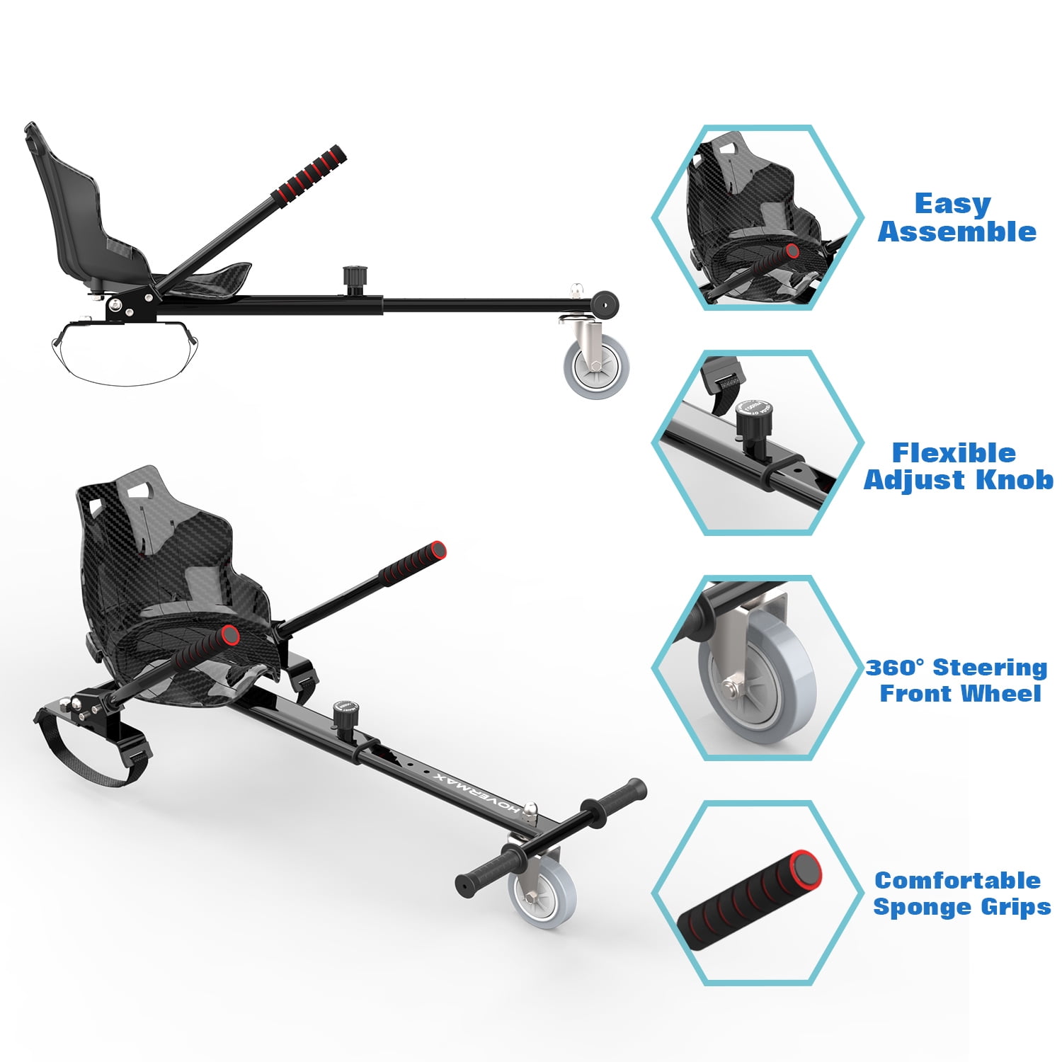 HOVERMAX Hoverboard Go Kart, Hoverboard Seat Attachment with Adjustable Frame Length for 6.5″ 8″ 10″ Hoverboard, Suitable for Kids & Adults, Black