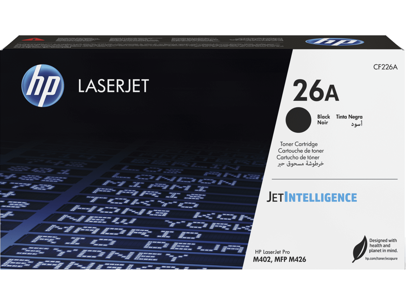 Page yield of HP 26A: approx. 3,100 pages black What’s in the box (CF226A): One HP 26A black LaserJet toner cartridge Print documents with crisp black text and sharp grayscale graphics using Original HP 26A toner (HP CF226A) cartridges. Use Original HP toner for the quality you expect. Original HP toner cartridges produce an average of 71% more usable pages than non-HP cartridges. HP 26A toner cartridges work with: HP LaserJet Pro M402, M426