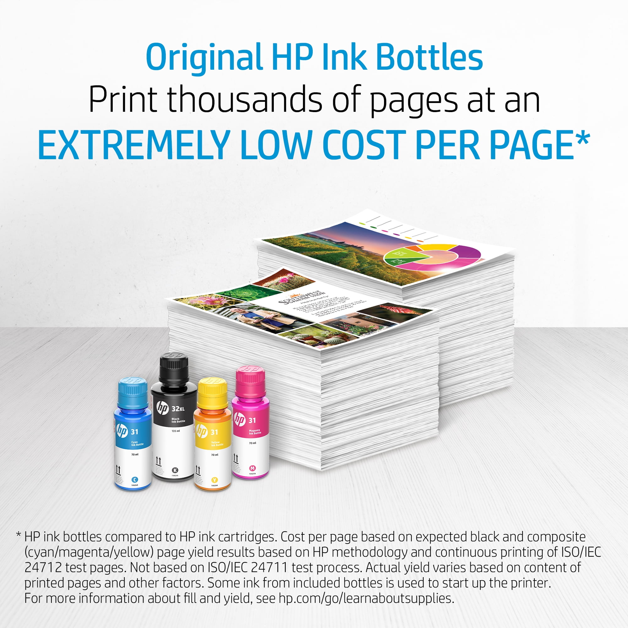 Free and easy recycling to help reduce waste. Print with confidence—Original HP Ink Bottles designed with the planet in mind for easy recycling and less waste. Print all you want without worrying about the cost of ink. You’ll get an extremely low cost per page using high-yield Original HP ink bottles and a high-capacity ink tank system. Print thousands of pages with one set of high-yield Original HP ink bottles—the perfect match for high-volume printing. Print dark, crisp text and photos that last for decades.