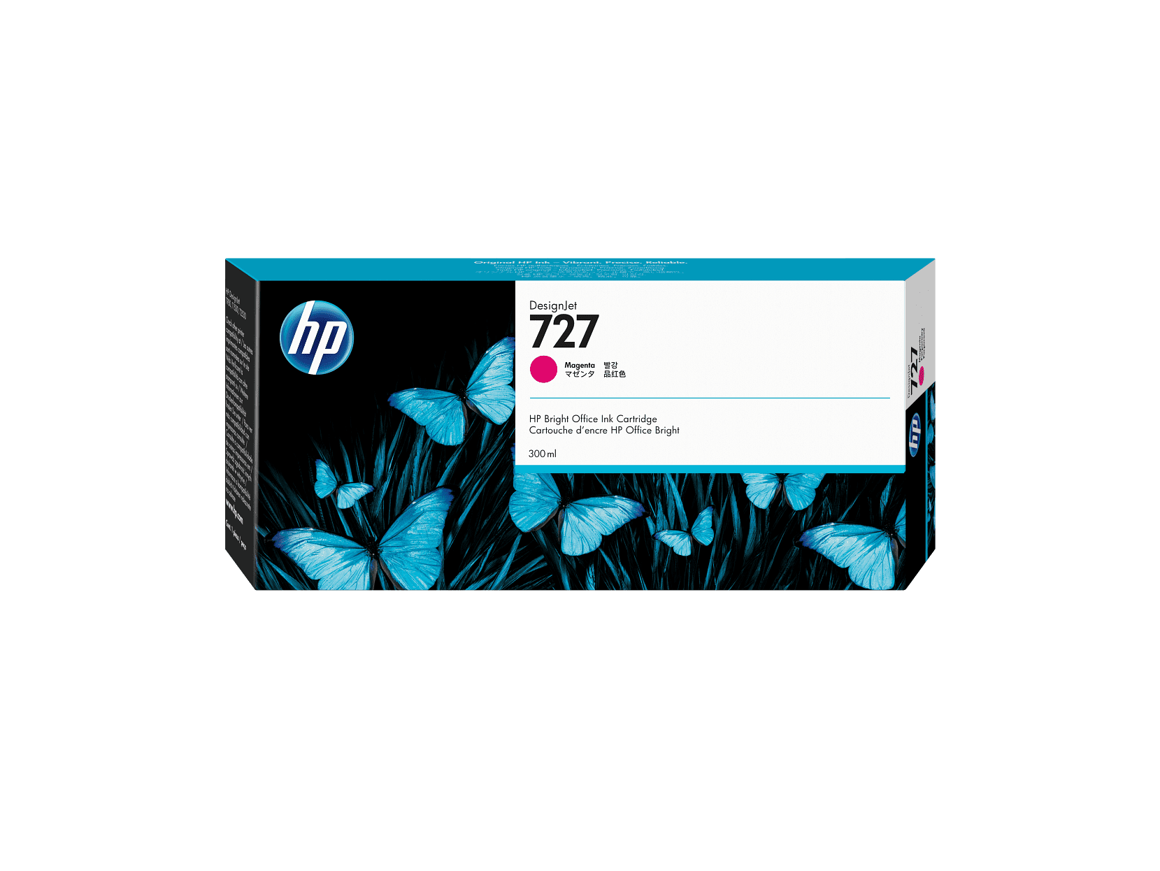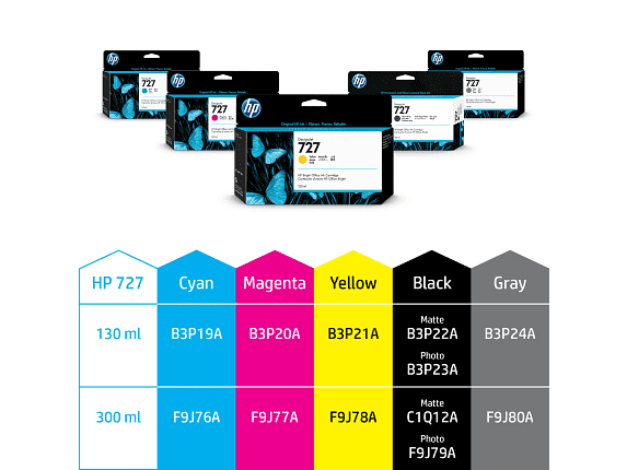 Overview It’s easy to get crisp, clear results. Designed together with your HP DesignJet printer as an optimized printing system, Original HP inks can help reduce downtime and improve productivity. Fast-drying, smudge-resistant prints help you keep pace. Ideal for design and engineering teams producing high-quality, professional drawings. It’s easy to get crisp, clear results. Designed together with your HP DesignJet printer as an optimized printing system, Original HP inks can help reduce downtime and improve productivity. Fast-drying, smudge-resistant prints help you keep pace. Features Produce high-quality, professional drawings Present your professional best with the accurate, professional prints produced by Original HP inks. Help reduce downtime and improve productivity See accurate, professional results, print after print, cartridge after cartridge with Original HP inks. Easy-to-use cartridges fit the way you work High-capacity 300-ml ink cartridges enable more unattended printing. Disclaimers Comparing 300-ml HP 727 DesignJet Ink Cartridges to 130-ml HP 727 DesignJet Ink Cartridges. Visit to see how to participate and for HP Planet Partners program availability; program may not be available in your area. Where this program is not available, consult the Material Safety Data Sheet (MSDS) available at to determine appropriate disposal. True neutral grays produced by printers compatible with the HP Three-black ink set.