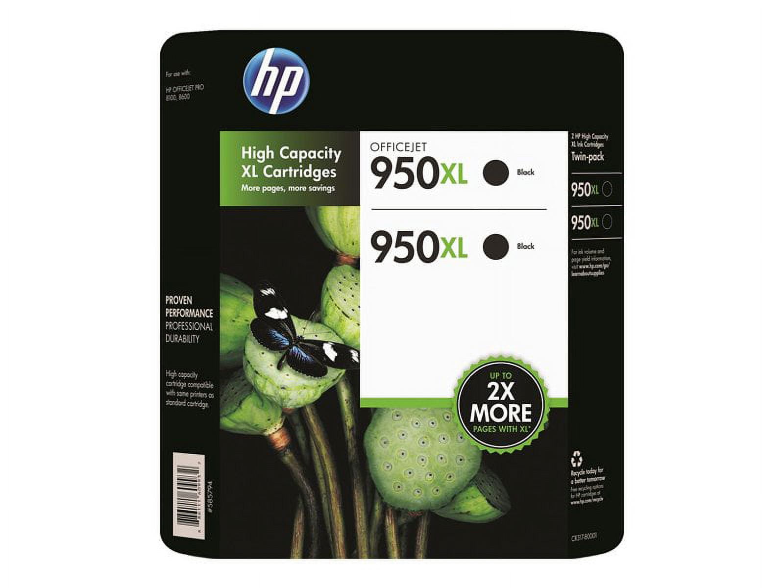 Take advantage of the proven performance and professional durability of the HP 950XL black ink: Genuine HP XL OEM Product Black Twin Pack in Retail Packaging XL Ink Cartridge-2,300 Page Yield For use with HP OfficeJet Pro 8100, 8600
