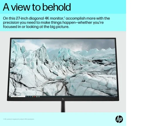 OverviewUniquely designed to deliver incredible visuals and extended flexibility, the HP E27k G5 4K USB-C Monitor redefines precision, so there’s nothing between you and your best. Stylishly crafted with your comfort and the planet in mind, this 4K display is a powerhouse of productivity. On-screen controls; Single Power ON; Anti-glare; Height Adjust/Tilt/Swivel/Pivot; HP Eye Ease; Ambient light sensorWhat’s in the box? Monitor; Warranty card; Quick Setup Poster; 1 USB Type-C® to Type-C cable; AC power cordDisclaimers 4K content required to view in 4K resolution. Single Power On only compatible with HP PCs with Windows 10 or higher. Ergonomic Setup Guide is available through HP Display Center. Host PC requires Windows 10 or higher. HP Display Center is available on the Microsoft store. Recycled/Renewable materials made up of 85% ITE, 4.5 % Ocean Bound Plastics, and 0.5 % coffee grounds. Recycled plastic content percentage is based on the definition set in the IEEE 1680.1 -2018 EPEAT® standard. HP defines renewable according to the Global Reporting Initiative Sustainability Reporting Standards. Consists of 25% recycled metals. Recycled metal is expressed as a percentage of the total weight of the metal according to ISO 14021 definitions for metal parts over 25 grams. Extended ecosystem sold separately.