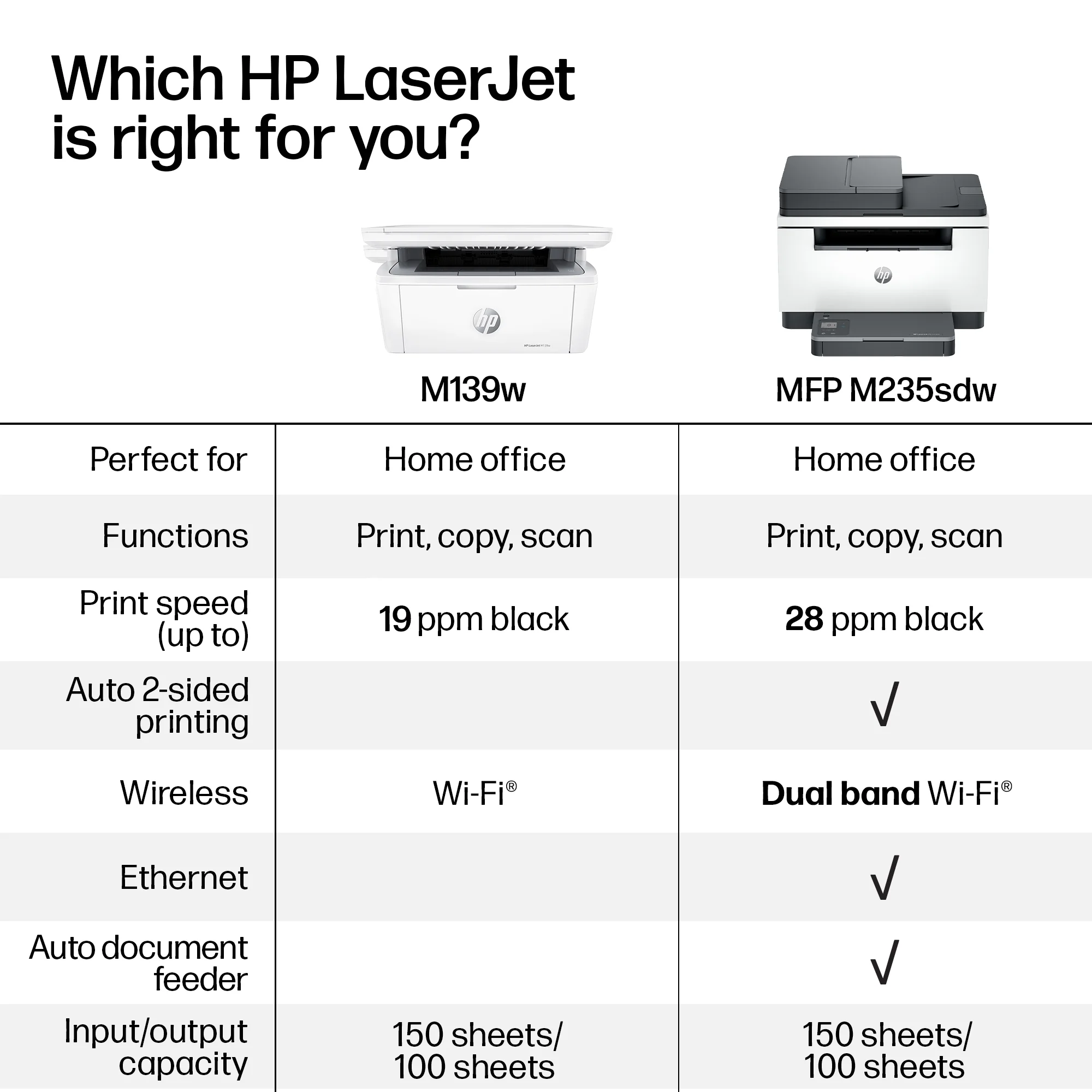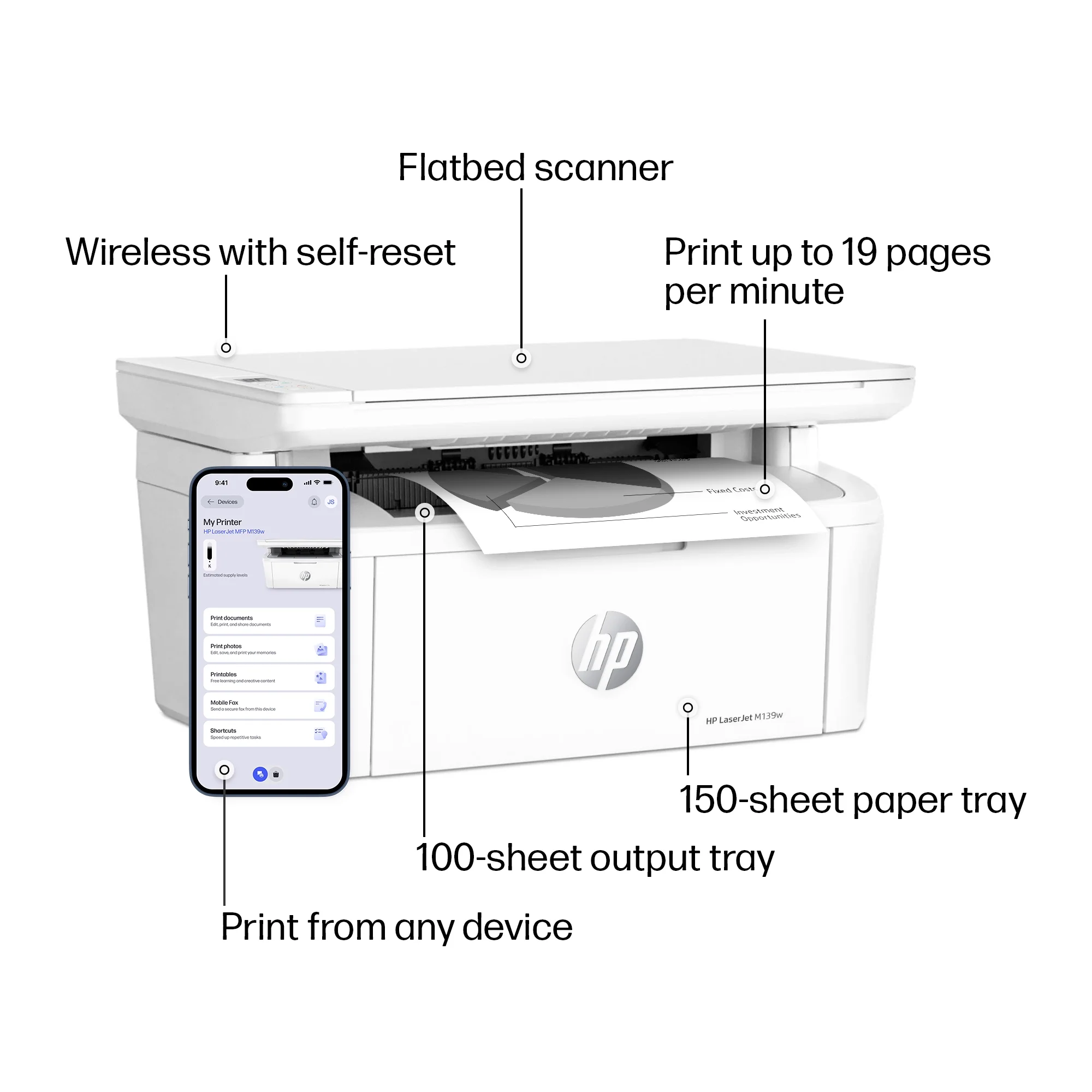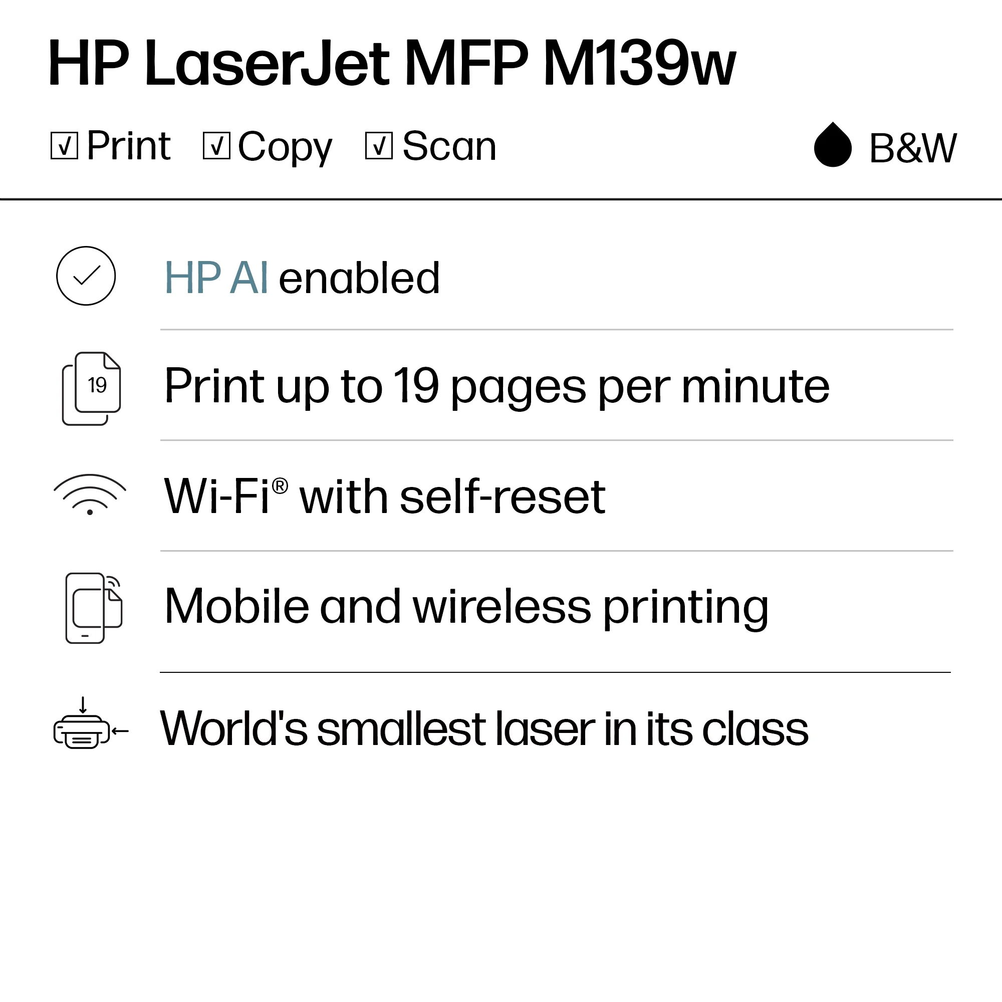 From America’s most trusted printer brand – Perfect for home offices and small teams printing, scanning and copying professional-quality black & white documents and reports. Perfect for 1-3 people. World’s smallest laser in its class – Precision monochrome laser printing, scanning, and copying that fits anywhere. Fast print speeds – Up to 19 black-and-white pages per minute single-sided. Wireless printing – Stay connected using Wi-Fi® with self-reset, which automatically detects and resolves connection issues. Print from any device – Wireless printing from any mobile device, PC or tablet. Works with Microsoft, Mac, AirPrint, Android, Chromebook and more. HP app – Print, scan, copy or fax from your smartphone with the easiest-to-use print app. Plus, eliminate steps in repetitive tasks. Dynamic security – This printer is intended to work only with cartridges with original HP chips or circuitry and will block cartridges using non-HP chips or circuitry. Periodic firmware updates will maintain the effectiveness of these measures. More at . What’s in the box – HP LaserJet MFP M139w Original HP 141A Black Toner Cartridge Setup poster Reference guide Power cord