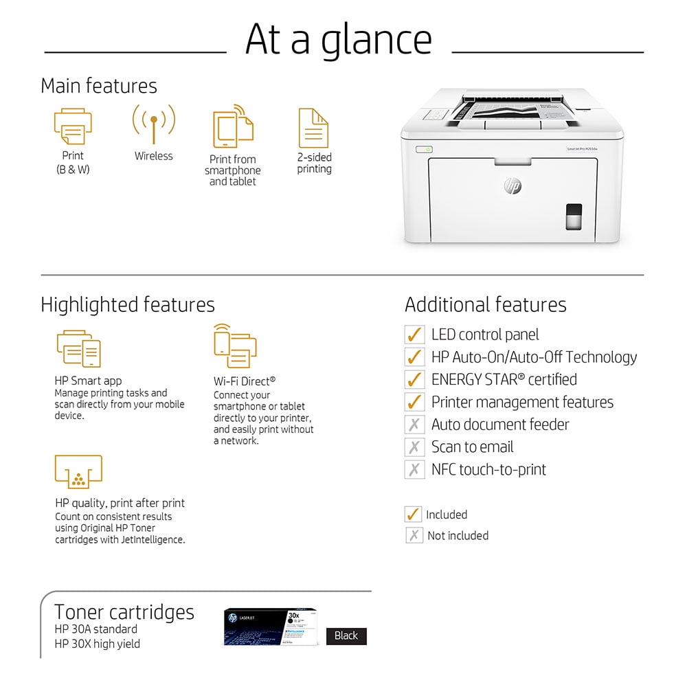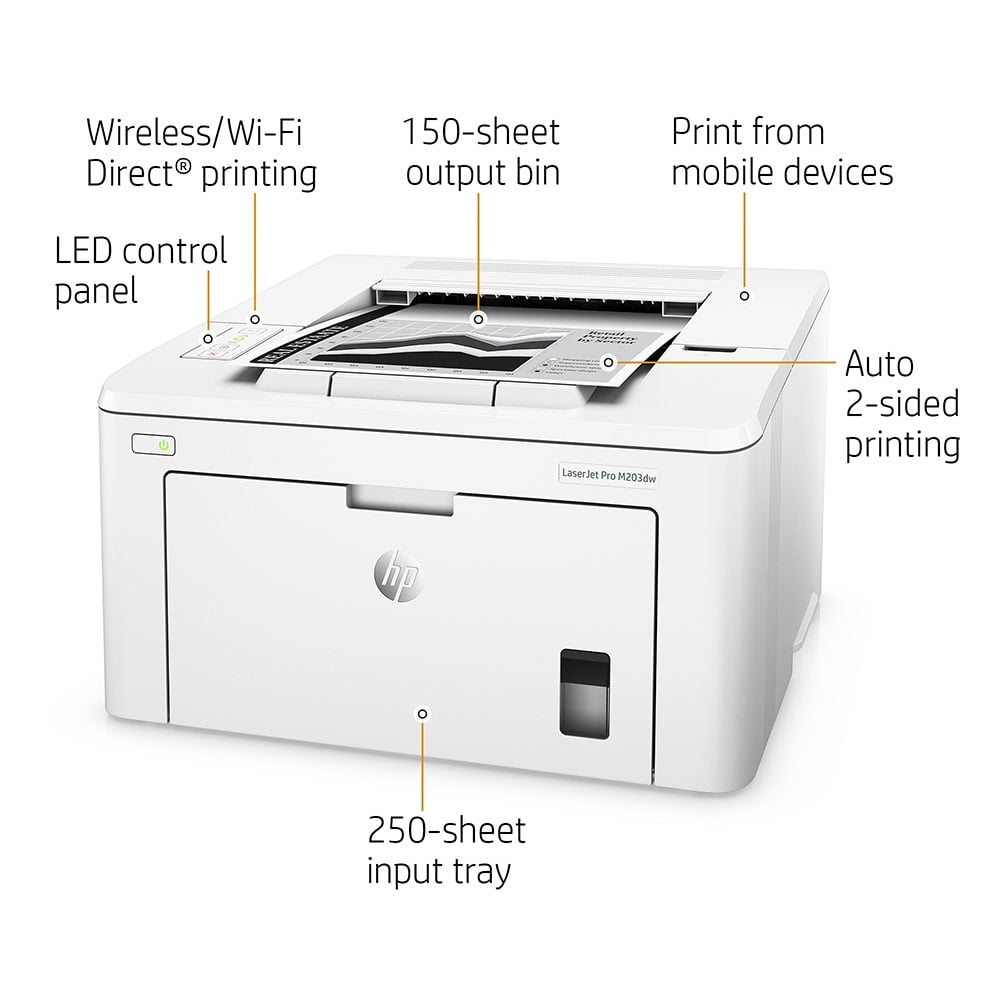 About HP LaserJet Pro M203dw Printer Compact, fast printing – Get print speeds up to 30 ppm, automatic two-sided printing, and a 250-sheet input tray Mobile printing made simple – Print, scan, and share documents anytime, anywhere with the HP Smart app Energy-efficient – Save energy in the office with this HP printer’s Auto-on/Auto-Off technology Manage company-wide printing with confidence – Centralize control of your printing environment using HP Web JetAdmin HP quality print after print – JetIntelligence toner cartridges deliver sharp text and crisp graphics for all your prints What’s in the box: HP LaserJet Pro M203dw Printer HP Black Introductory LaserJet Toner Cartridge HP LaserJet Imaging Drum Setup Poster Getting Started Guide Printer Documentation and Software CD USB Cable Power Cord