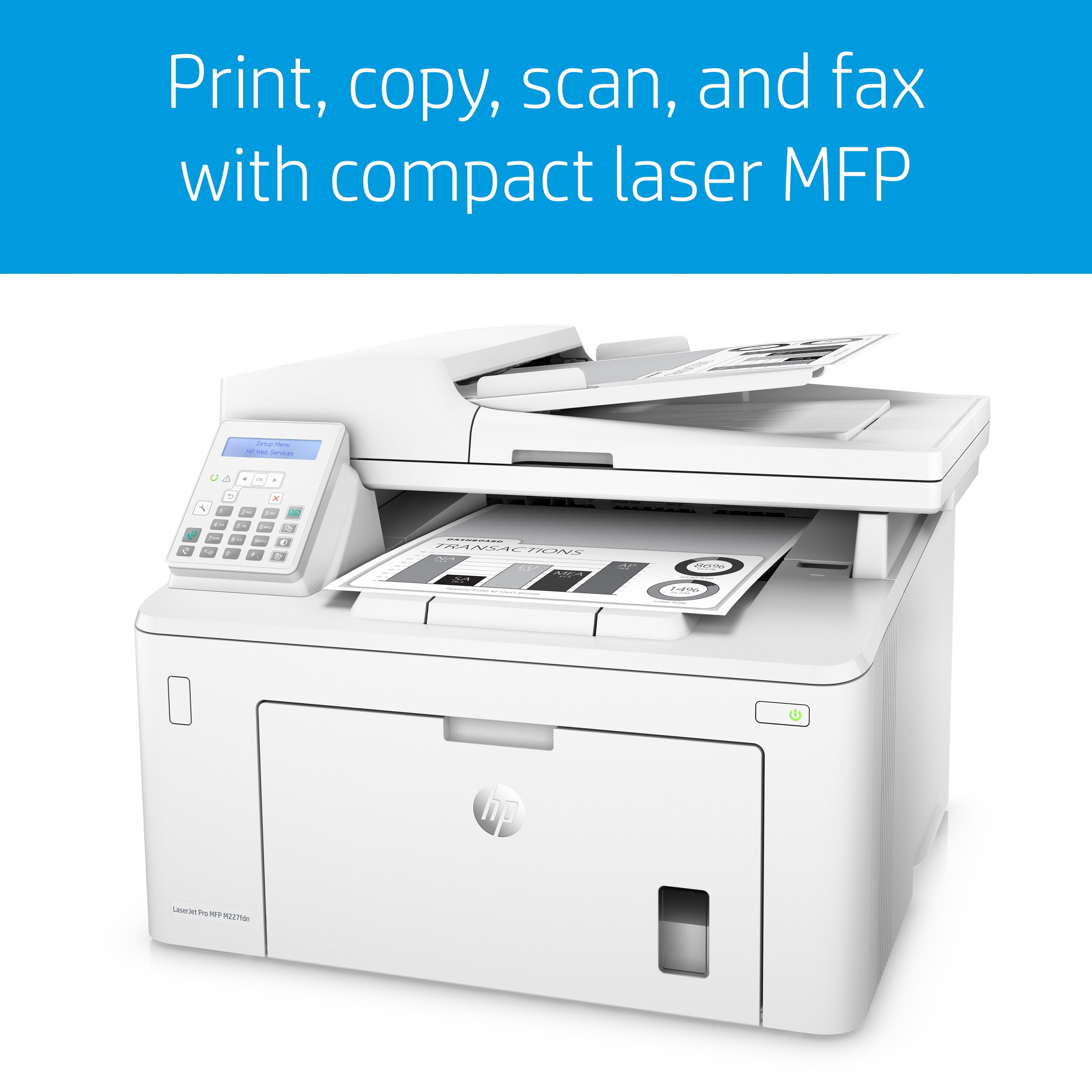 HP LaserJet Pro MFP M227fdn printers are designed for individuals or small workteams who need affordable, reliable multifunction performance in a compact and easy-to-use desktop device. They Produce sharp text, bold blacks, and crisp graphics with precision black toner. The HP LaserJet Pro MFP M227fdn will help you get more pages than ever before and track remaining pages to help ensure you get what you paid for by printing two-sided documents, plus scan, copy, fax to help maximize efficiency.