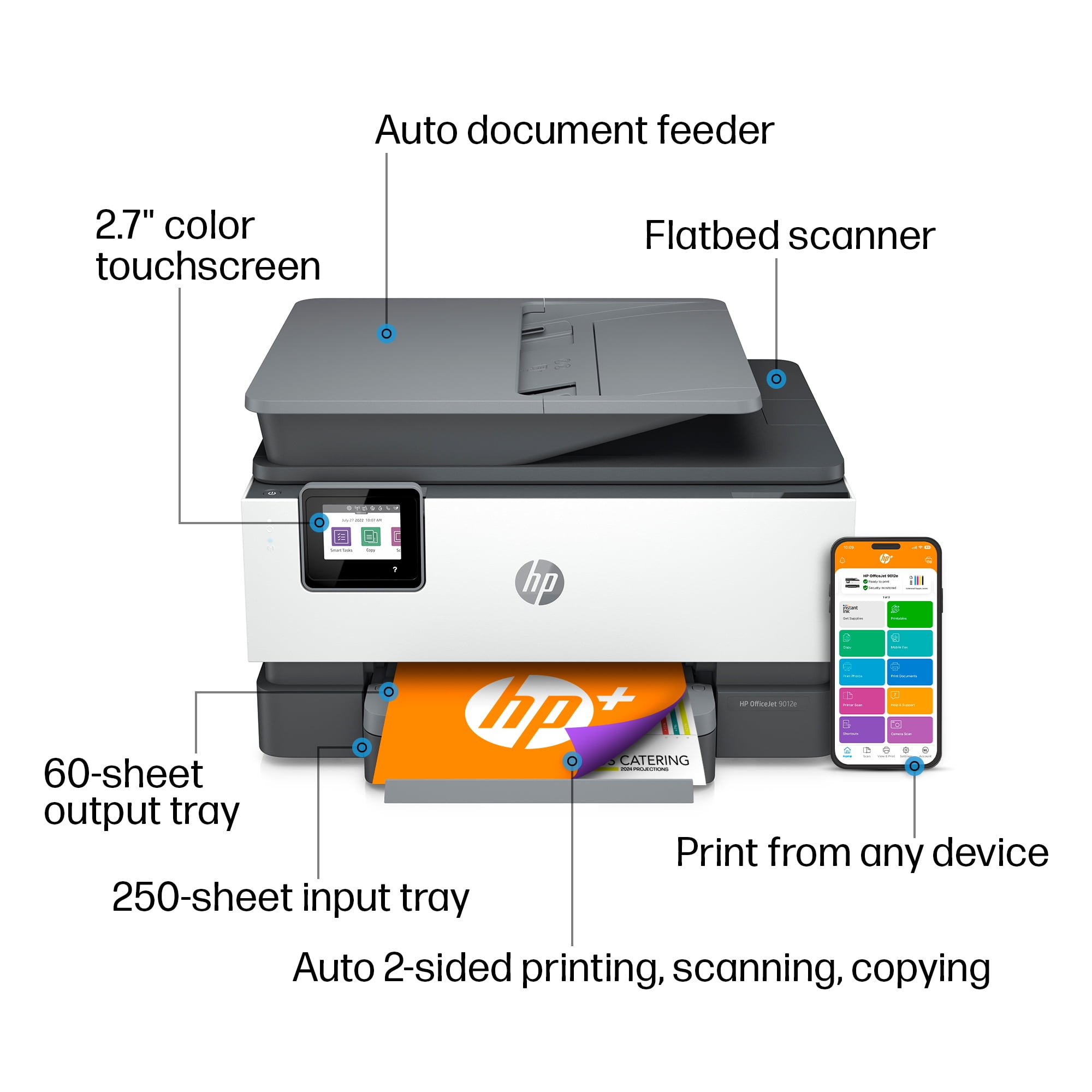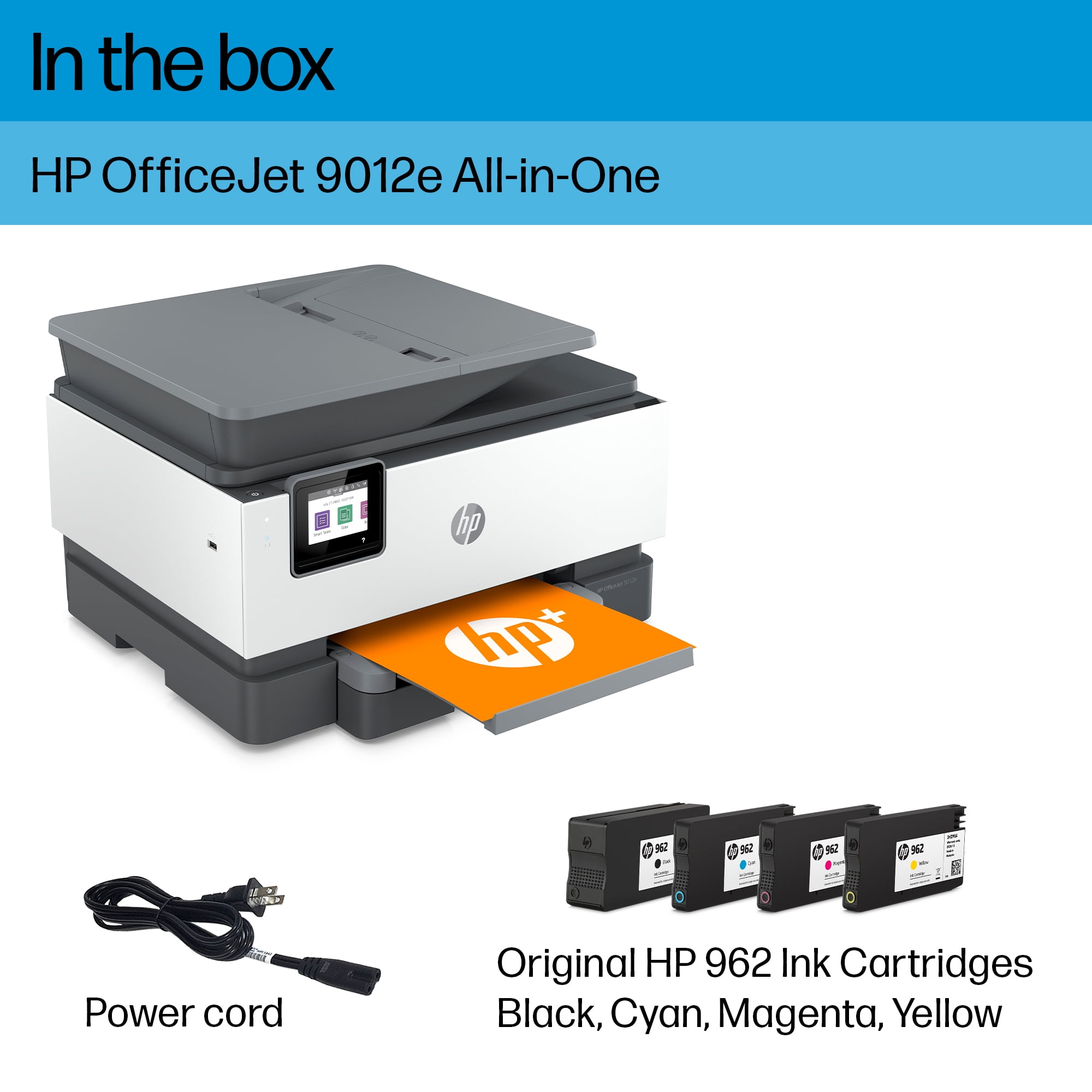 About HP OfficeJet 9012e All-in-One Wireless Color Inkjet Printer Best for small businesses and home offices – Print professional-quality color documents like presentations and sales collateral with optional borderless printing. Stay productive with a large 250-sheet paper tray and faster print speeds of up to 20 pages per minute in black and 16 pages per minute in color. Upgraded features – Faster color print, copy, scan, and fax plus 2-sided printing, copying and scanning. Easily print from mobile, wireless, Ethernet, USB drive,or voice-activated printing with helpful color touchscreen control panel. Work fast and hands-free with the 35-page auto document feeder. Upgraded scanning with easy slide off glass and dual pass, 2 sided scanning via auto document feeder. Dual band Wi-Fi – Intelligent self-healing Wi-Fi automatically detects and resolves connection issues. Security essentials – Protect sensitive data with basic encryption, password protection, Wi-Fi security and document protection. HP+ eligible – Choose HP+ at printer setup to activate benefits such as 6 months of free Instant Ink, a 2-year extended HP warranty, advanced HP Smart app features, and forest friendly printing. Once HP+ is activated, your printer must be connected to the internet and requires Original HP Ink Cartridges to operate for the life of the printer. Get ink your way, every day – Buy Original HP 962 ink or get HP Instant Ink Delivery Service: ink ordered by your printer, delivered to your door for as low as $0.99 per month, including ink cartridge, shipping and recycling. No annual fee; credit card required. You can change or cancel at anytime. Includes 6 months free trial when you choose HP+ at printer setup (subscription required). HP Smart app – Print, scan and copy from your phone—from anywhere. Eliminate steps in repetitive tasks using Shortcuts. Scan documents to the cloud from your phone straight to Dropbox, Google Drive and more. With HP+, you get advanced features in the Smart app including enhanced security features and advanced scanning features such as multi-item recognition. What’s in the box: HP OfficeJet 9012e All-in-One Printer Original HP 962 Black Cartridge Original HP 962 Cyan, Magenta, Yellow Cartridges Instant Ink flyer Regulatory flyer Power cord Setup poster Reference guide