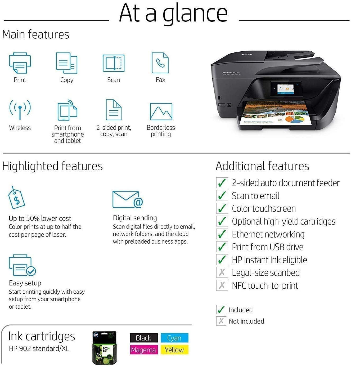 Main functions of this HP color inkjet photo printer: copy, scan, fax, wireless printing, two-sided duplex printing and scanning, color touchscreen, automatic document feeder, Instant Ink ready so you’ll never run out of ink, and more. Easily print when and where you need to from your smartphone, tablet, or notebook PC; get convenient mobile printing options and mobile setup; connect the way you want to with Ethernet and wireless networking.