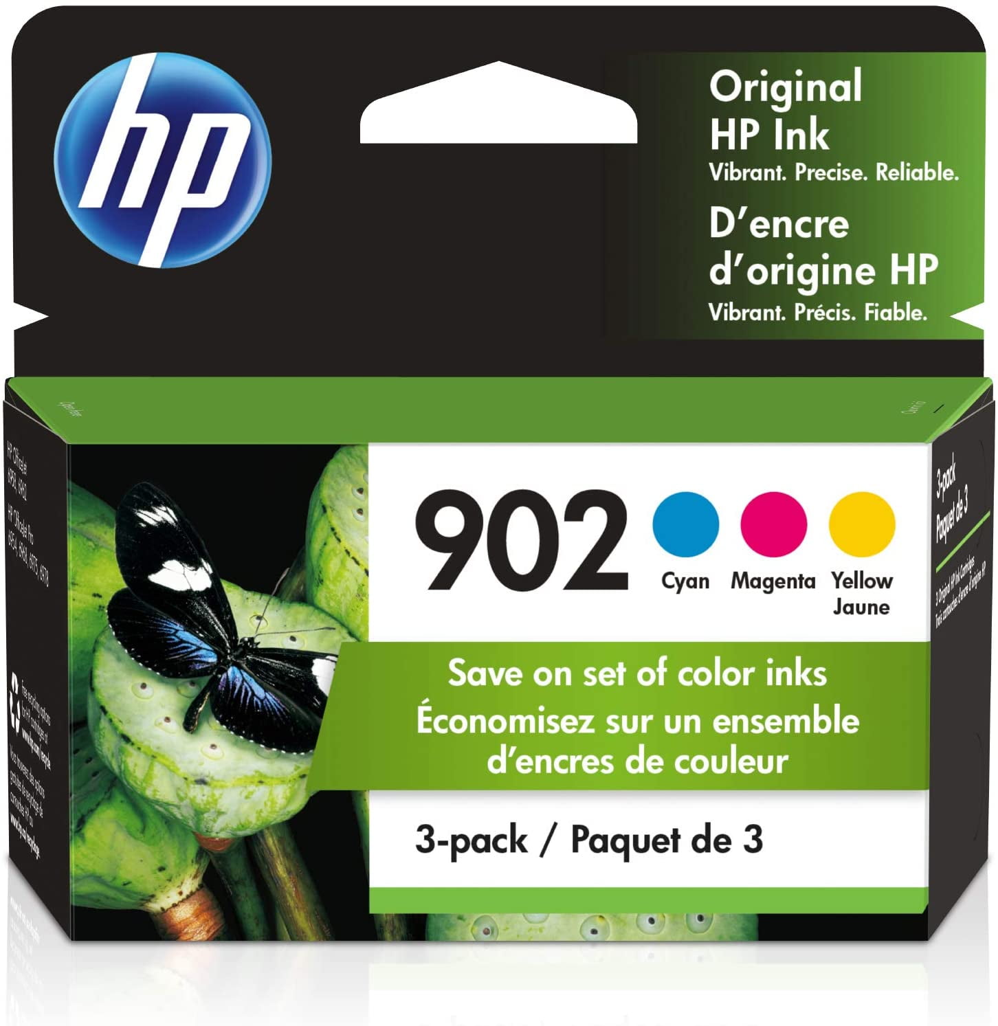 HP 902 ink cartridges work with: HP OfficeJet 6951, 6954, 6958, 6962. Get up to 2x the pages with Original HP XL ink cartridges compared to standard cartridges. Original HP ink cartridges: genuine ink for your HP printer. Page yield of HP 902: approx. 825 pages black, 315 pages cyan, 315 pages magenta, 315 pages yellow Colors: Black, cyan, magenta, yellow. What’s in the box: One HP 902XL black high-yield ink cartridge (T6M14AN), and 1 each 902 cyan, magenta & yellow ink cartridges (T0A38AN)