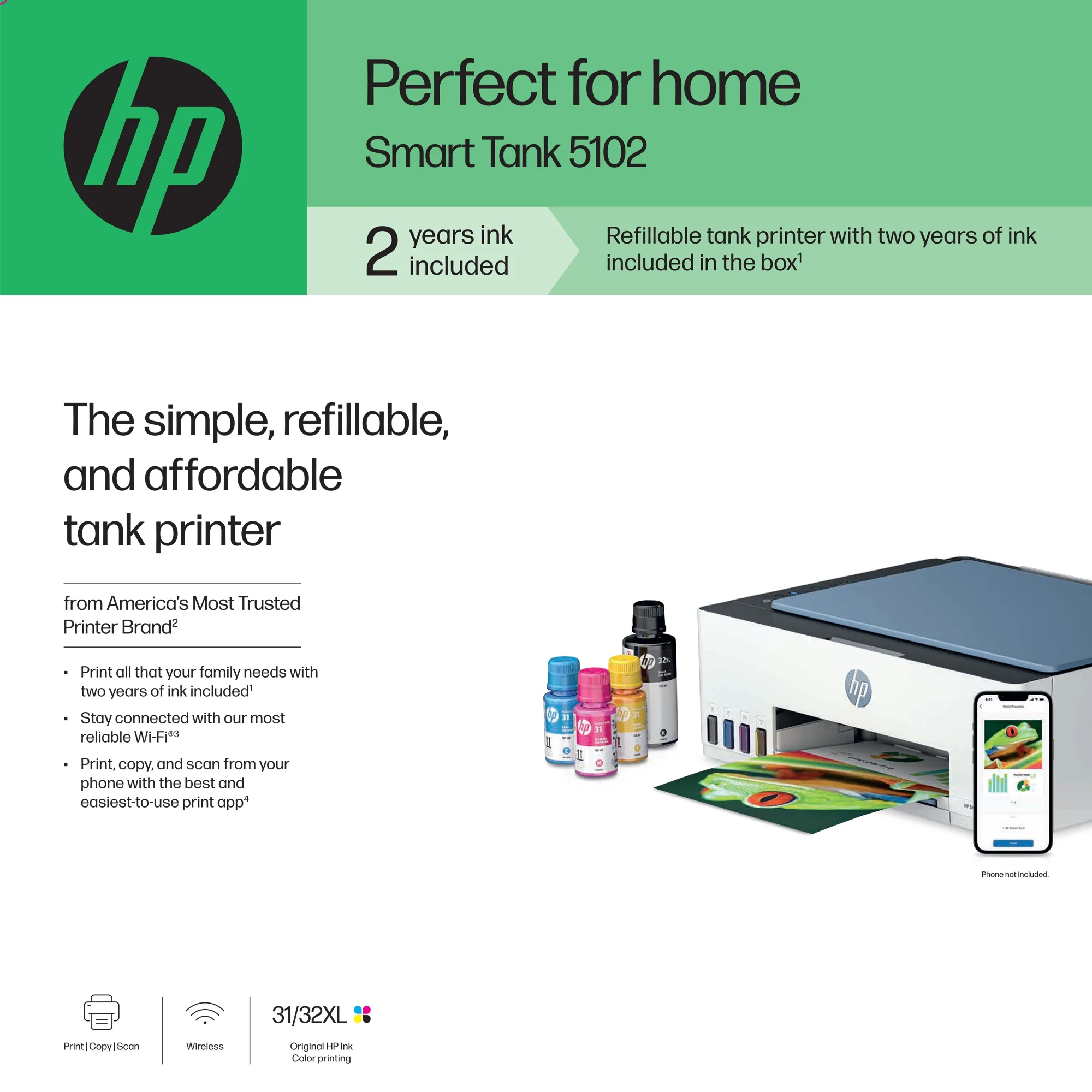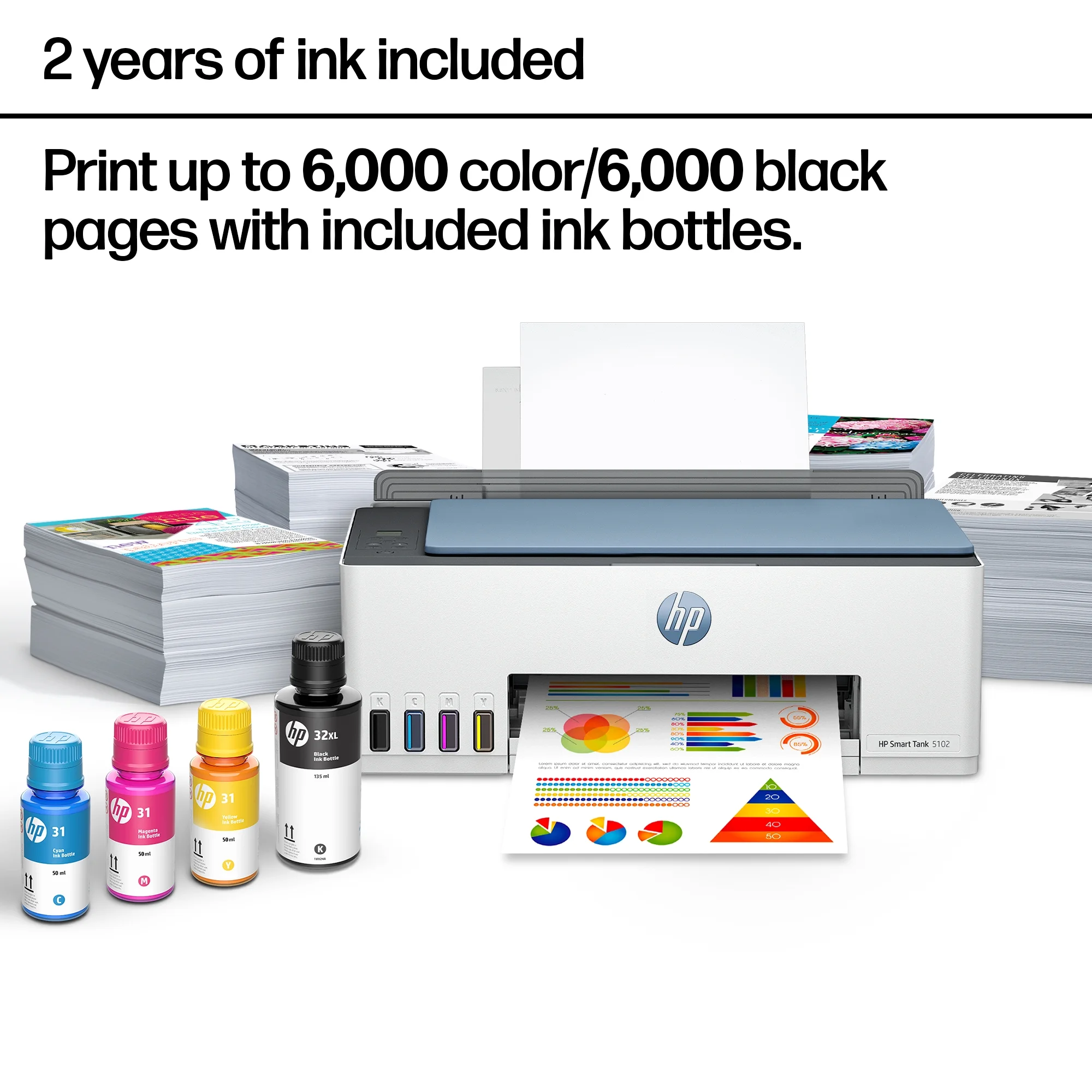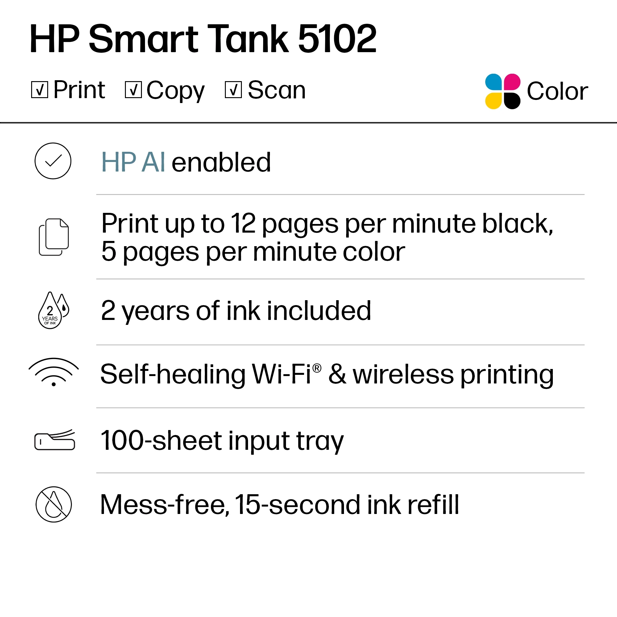 Best for families. Print a variety of color documents in high volumes. Key features: Print, copy and scan. Plus borderless, mobile and wireless capabilities. Print up to 12 pages per minute black and 5 pages per minute color. Fully loaded with savings. Best for low-cost, high-volume home printing—up to 2 years of Original HP Ink included; get up to 6,000 black pages or 6,000 color pages right out of the box. Exceptional HP quality. Delivers color graphics and crisp text for your everyday prints. Simple, spill-free refill. Replenish ink with HP’s easy-access, spill-free refill system. Simply plug the ink bottles into the ink tank and let them drain—no squeezing, no spilling. Easy to use. Smart-guided buttons illuminate to guide you through everyday printing, scanning and copying tasks. HP Wolf Essential security. Helps maintain privacy and protects from viruses and malware. Reliable connectivity. Self-healing Wi-Fi 802.11b/g/n that automatically detects and resolves connection issues. Hi-Speed USB2.0 (device); Wi-Fi Direct; USB 2.0. HP Smart app. Simple setup that guides you through each step, using the best-in-class HP Smart app. Print, scan and copy everyday documents from your phone from anywhere. What’s in the box: HP Smart Tank 5102 Wireless All-in-One Supertank Printer Up to 2 years of ink in bottles HP Original 32 XL Black Ink Bottle HP Original 31 Cyan Ink Bottle HP Original 31 Magenta Ink Bottle HP Original 31 Yellow Ink Bottle HP Black Printhead HP Tri-Color Printhead Ink caution flyer Reference guide Regulatory flyer Setup guide Power cord