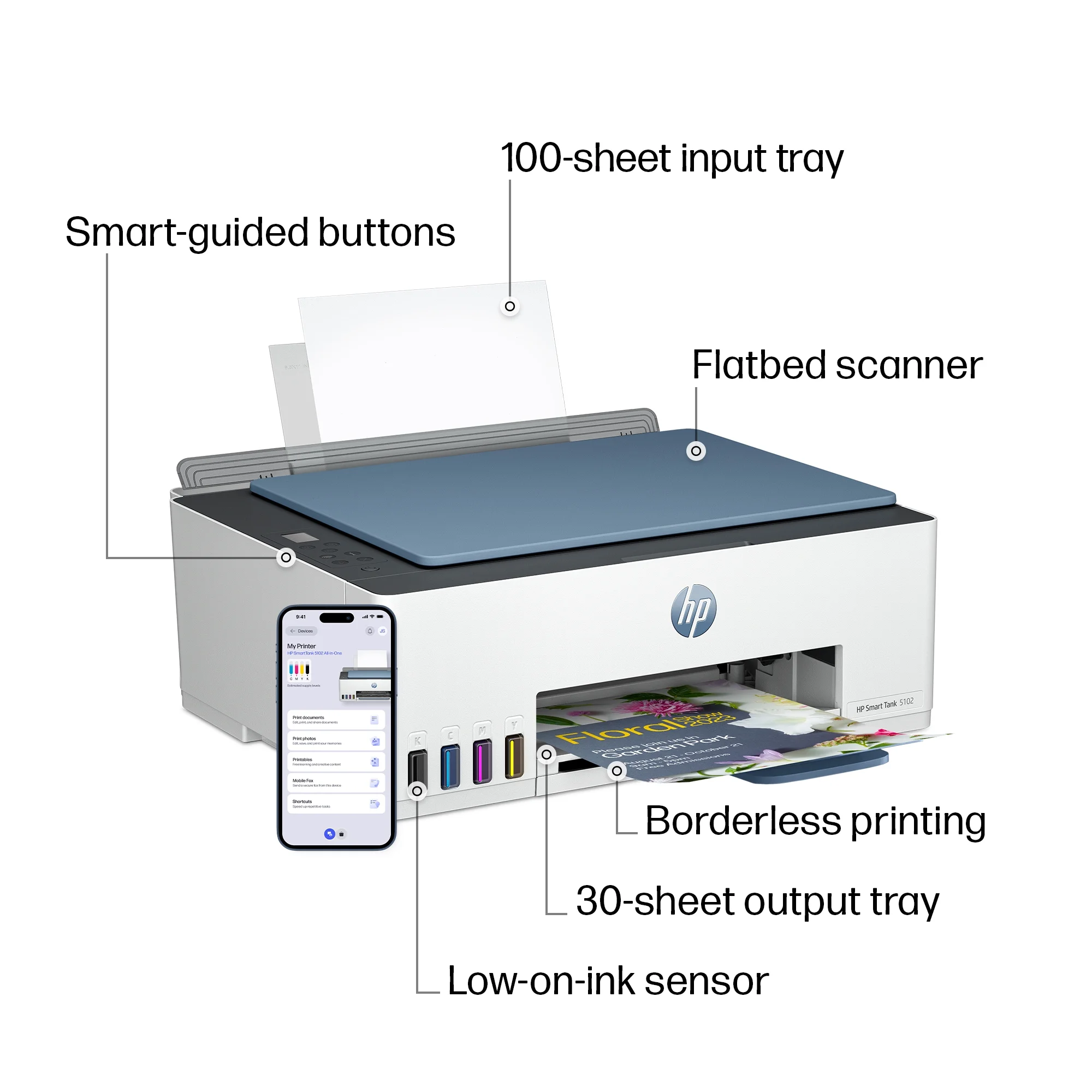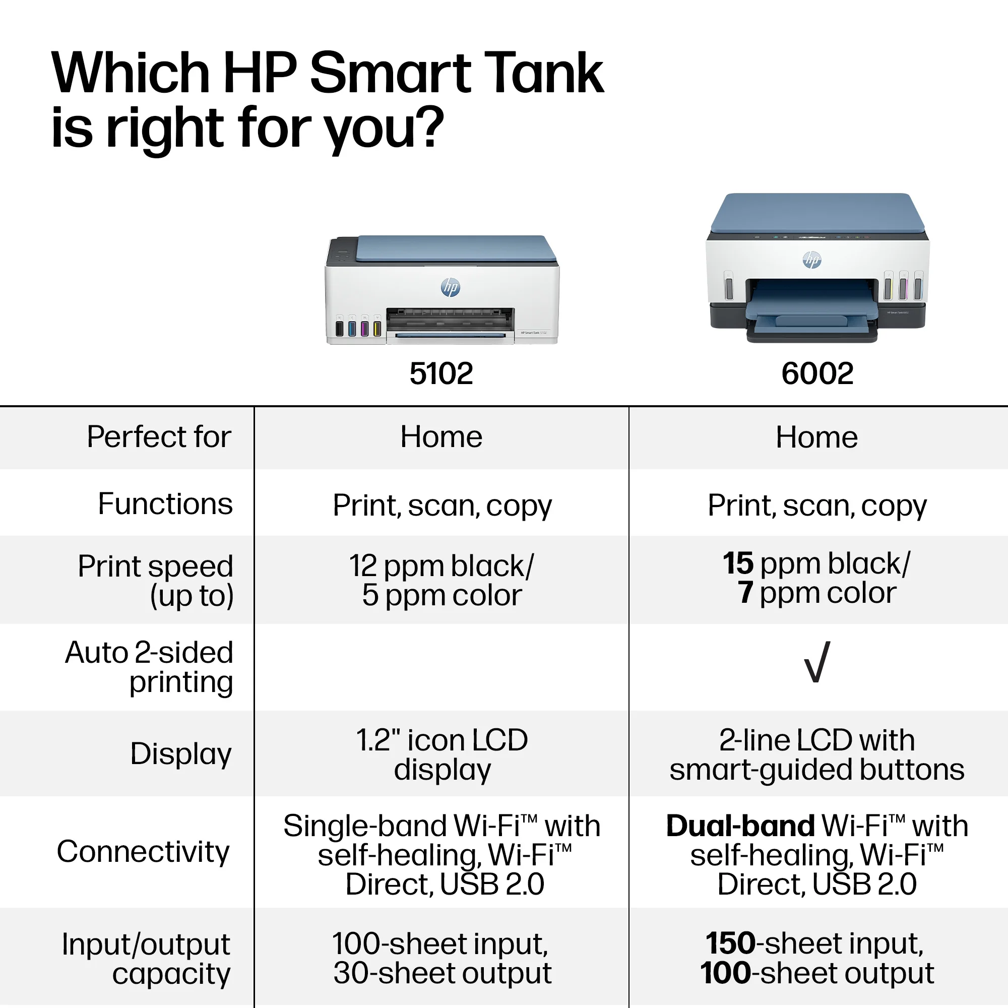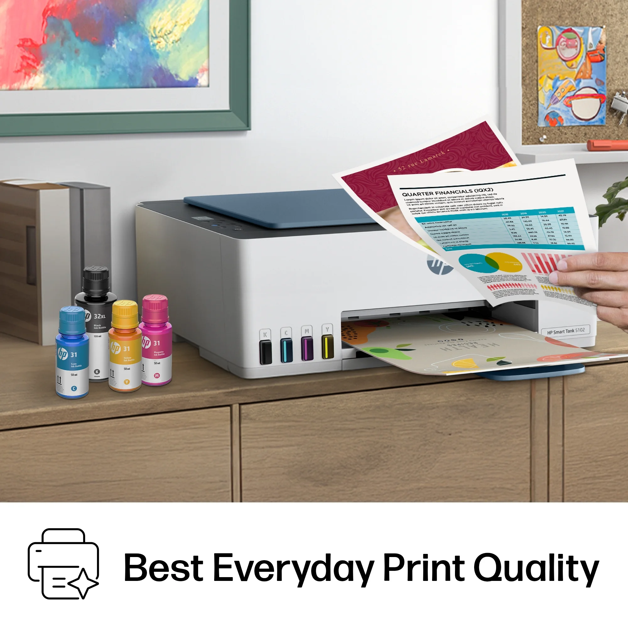 Best for families. Print a variety of color documents in high volumes. Key features: Print, copy and scan. Plus borderless, mobile and wireless capabilities. Print up to 12 pages per minute black and 5 pages per minute color. Fully loaded with savings. Best for low-cost, high-volume home printing—up to 2 years of Original HP Ink included; get up to 6,000 black pages or 6,000 color pages right out of the box. Exceptional HP quality. Delivers color graphics and crisp text for your everyday prints. Simple, spill-free refill. Replenish ink with HP’s easy-access, spill-free refill system. Simply plug the ink bottles into the ink tank and let them drain—no squeezing, no spilling. Easy to use. Smart-guided buttons illuminate to guide you through everyday printing, scanning and copying tasks. HP Wolf Essential security. Helps maintain privacy and protects from viruses and malware. Reliable connectivity. Self-healing Wi-Fi 802.11b/g/n that automatically detects and resolves connection issues. Hi-Speed USB2.0 (device); Wi-Fi Direct; USB 2.0. HP Smart app. Simple setup that guides you through each step, using the best-in-class HP Smart app. Print, scan and copy everyday documents from your phone from anywhere. What’s in the box: HP Smart Tank 5102 Wireless All-in-One Supertank Printer Up to 2 years of ink in bottles HP Original 32 XL Black Ink Bottle HP Original 31 Cyan Ink Bottle HP Original 31 Magenta Ink Bottle HP Original 31 Yellow Ink Bottle HP Black Printhead HP Tri-Color Printhead Ink caution flyer Reference guide Regulatory flyer Setup guide Power cord