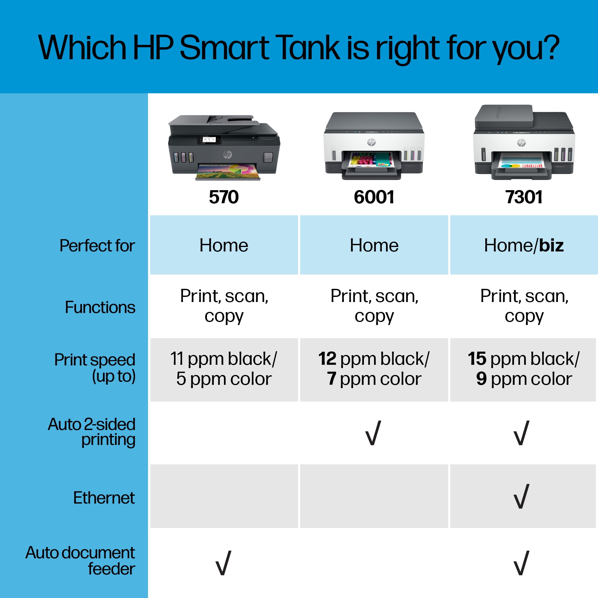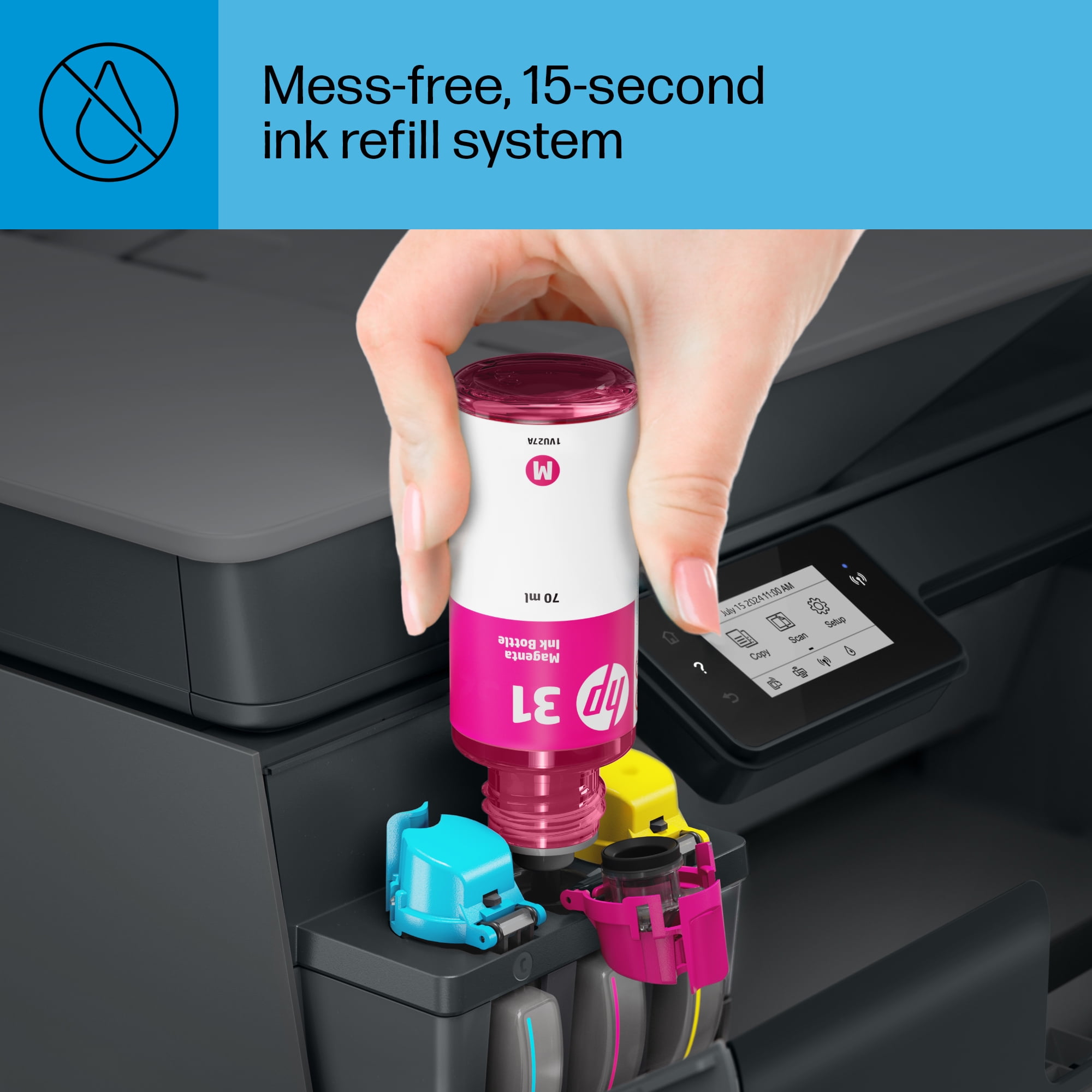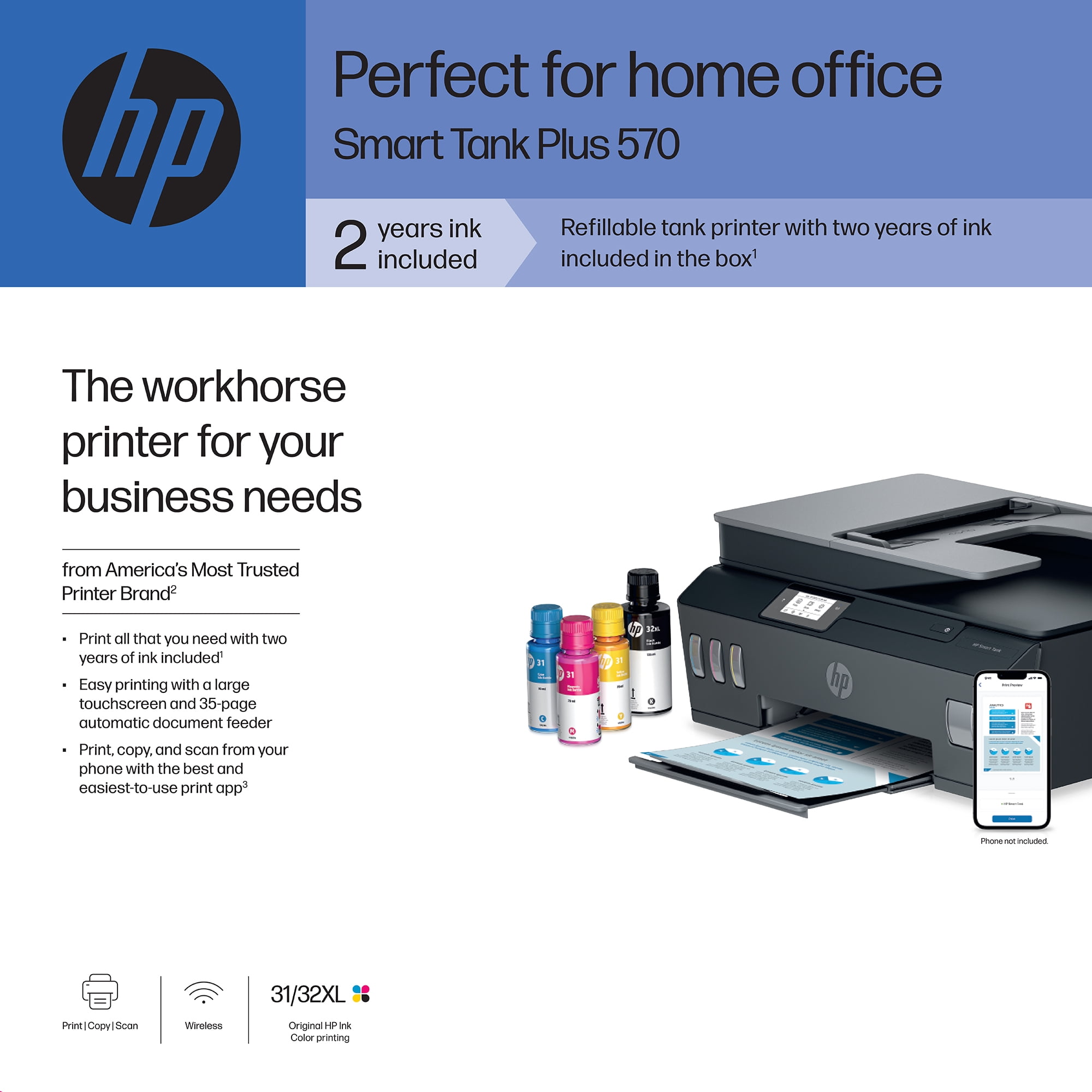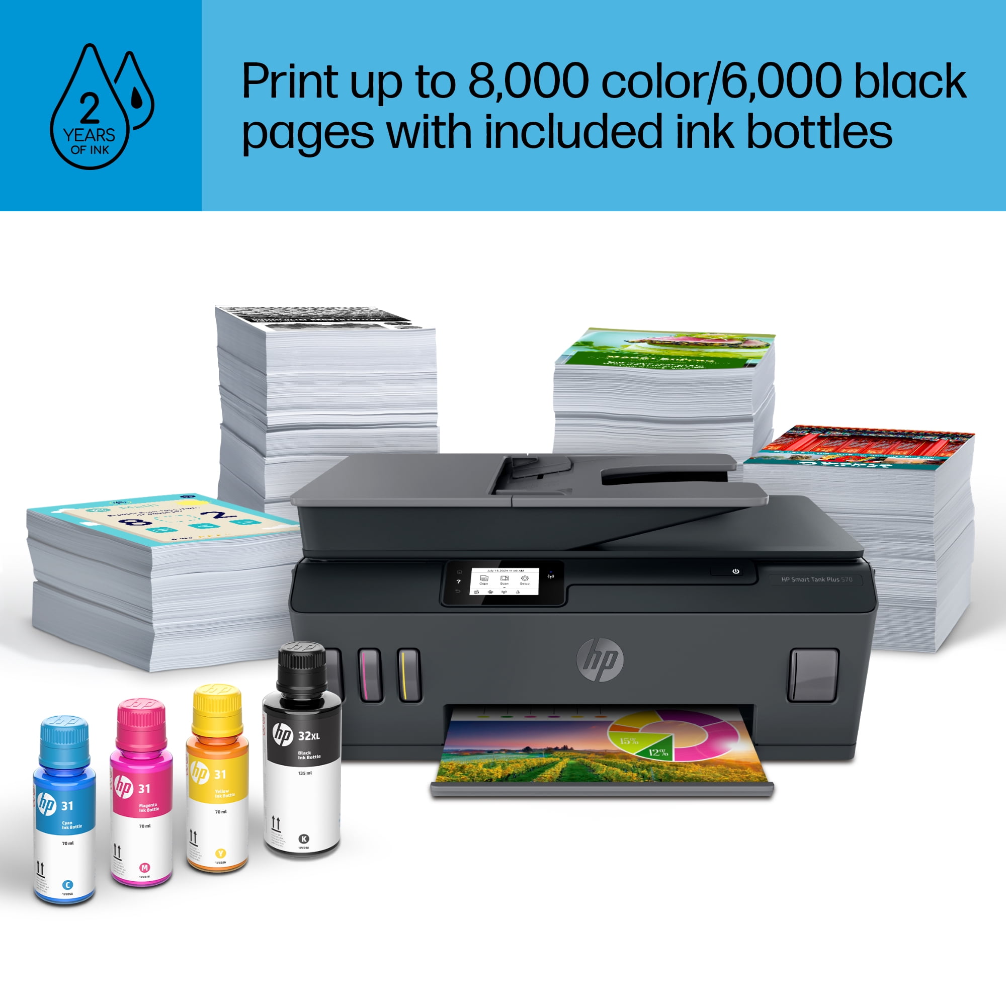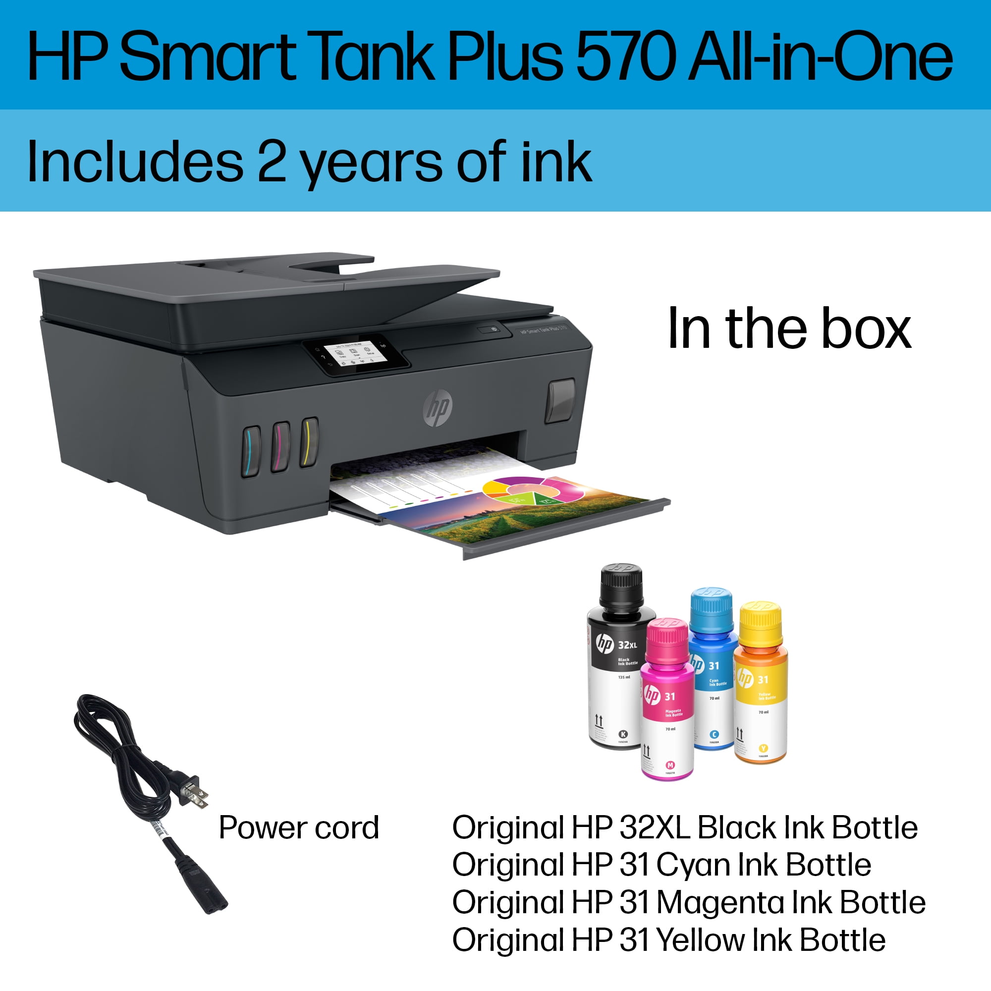 Perfect for home office – Print a variety of color documents in high volumes from America’s most trusted printer brand Fully loaded with savings – Best for low-cost, high-volume printing—up to 2 years of Original HP Ink included; get up to 8,000 color pages or 6,000 black pages right out of the box Key features – Print, copy and scan, plus a 35-page automatic document feeder, 2.2″ Mono Touchscreen, borderless prints, mobile and wireless printing. Print up to 11 pages per minute black and 5 pages per minute color Best print quality – HP Smart Tanks offer the best print quality in their class, delivering exceptional color graphics and sharp text on everyday paper HP Smart app – Print, scan and copy from your phone—whenever, wherever Connectivity – Dual-band Wi-Fi, Hi-Speed USB 2.0 Get faster, more reliable wireless connections Simple, spill-free refill – Replenish ink with HP’s easy-access, spill-free refill system. Simply plug the ink bottles into the ink tank and let them drain—no squeezing, no spilling. Touchscreen – Easily complete everyday print, scan and copy tasks with the 2.2″ mono touchscreen What’s in the box – HP Smart Tank Plus 570 All-in-One Printer Original HP 32XL Black Ink Bottle Original HP 31 Cyan Ink Bottle Original HP 31 Magenta Ink Bottle Original HP 31 Yellow Ink Bottle Ink caution flyer Setup guide Reference guide Regulatory flyer Power cord