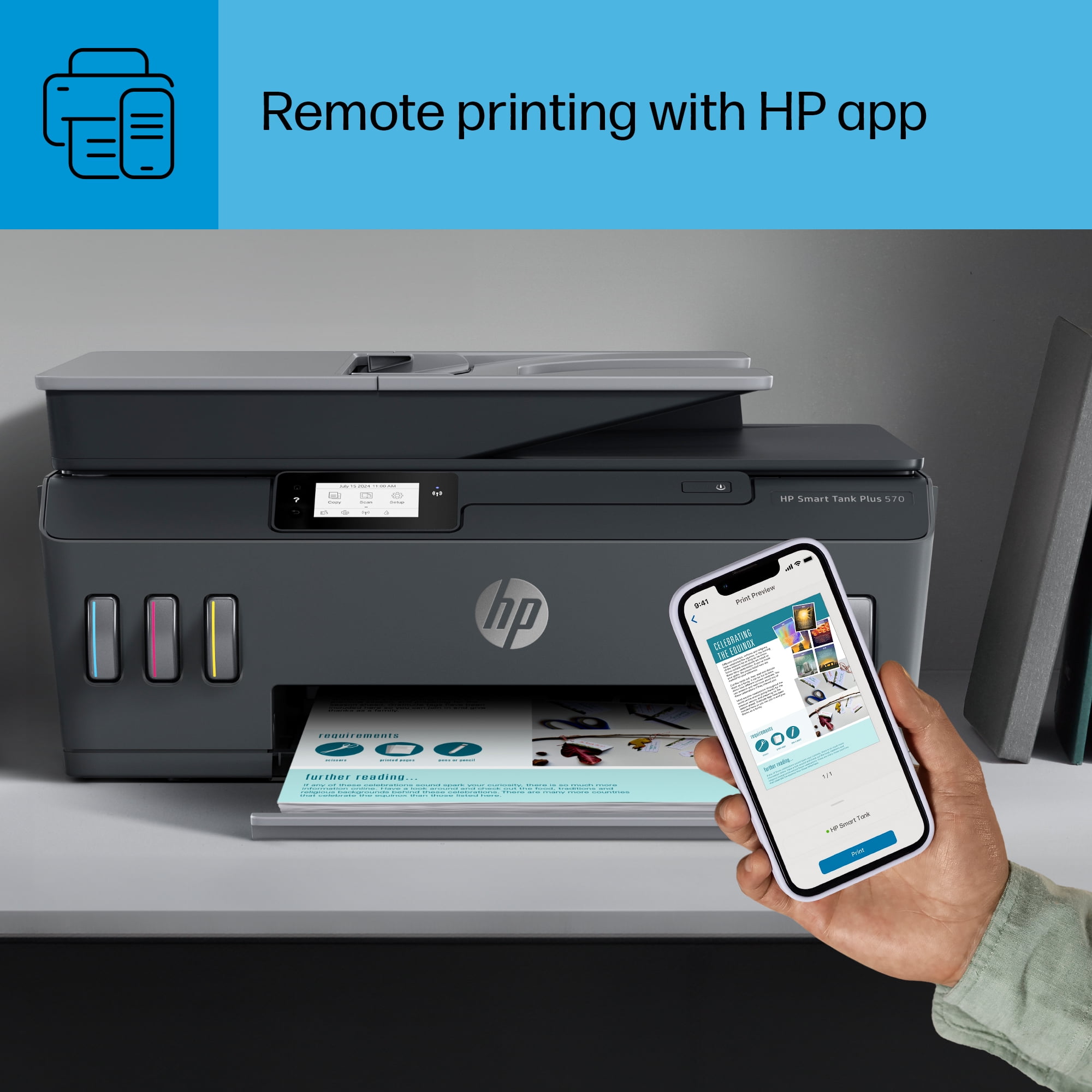 From America’s most trusted printer brand, the HP Smart Tank Plus 570 is a refillable tank printer that makes printing seamless for your home with its high capacity and wireless connectivity. Create everyday color documents at a low cost with up to 2 years of Original HP Ink included in the box.