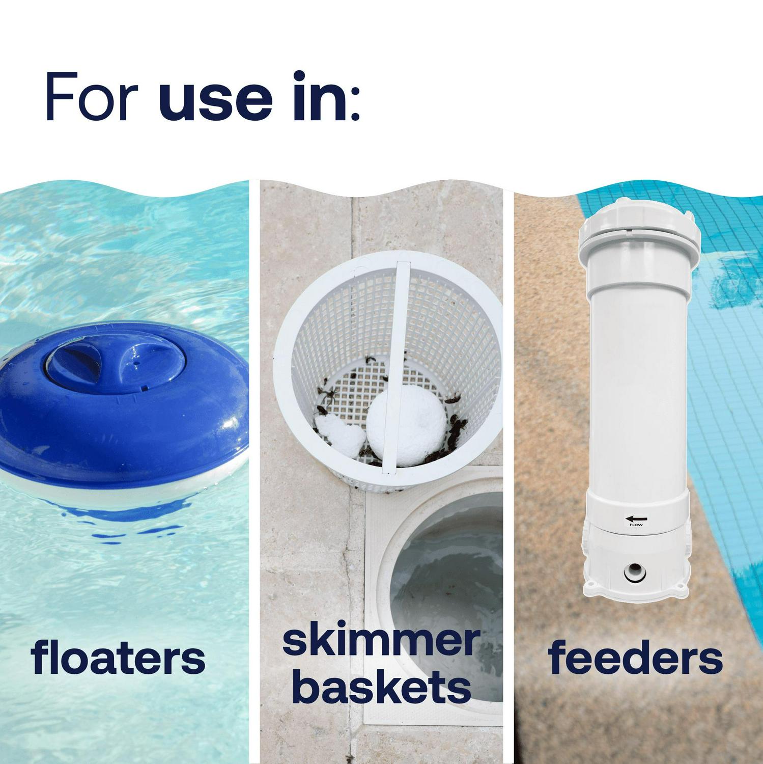 How To Use HTH Chlorine Tabs: Follow the on-pack instructions to place tab(s) in your swimming pool feeder, floater or skimmer. 3″ Chlorine Tabs work great with the HTH Skimmer Basket Insert. The amount of tabs you use depends on your pool size. Do not add tabs directly to the pool as this can cause damage to pool surfaces. Repeat every week or as often as needed to maintain a chlorine residual of 1-4 ppm.