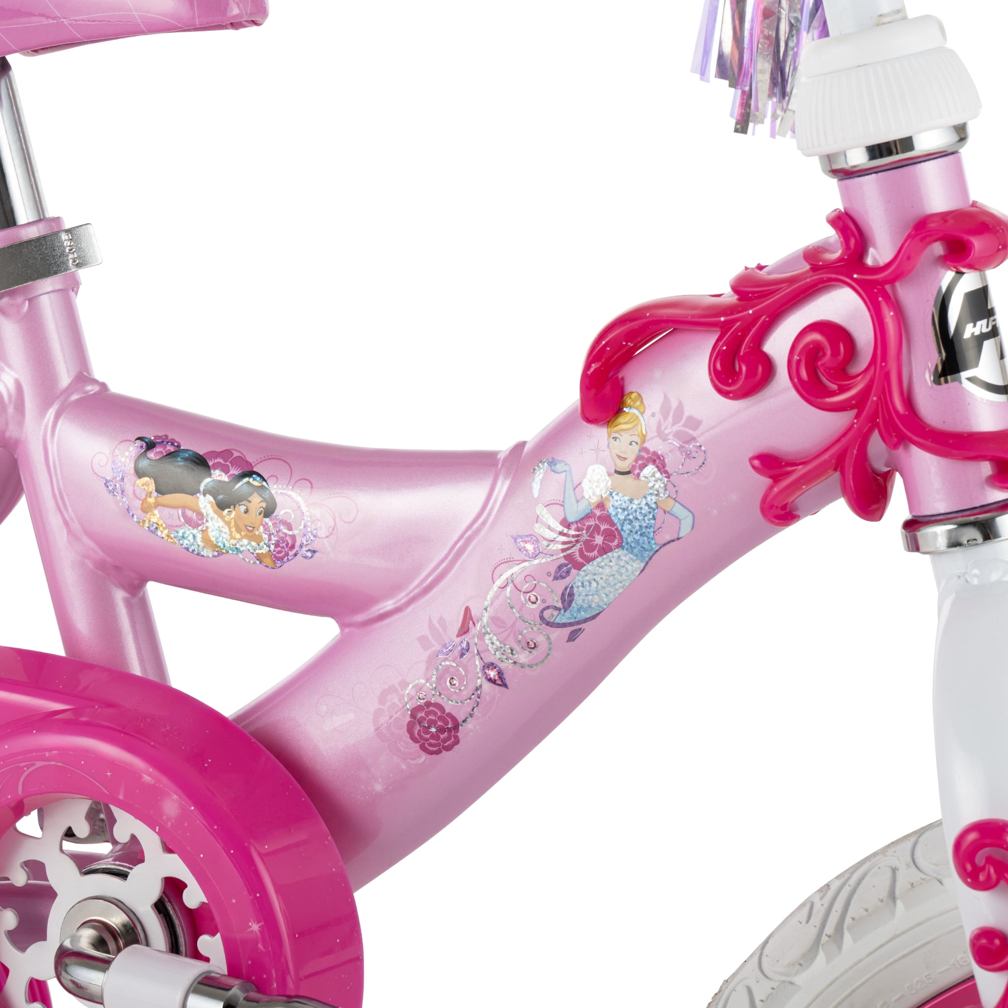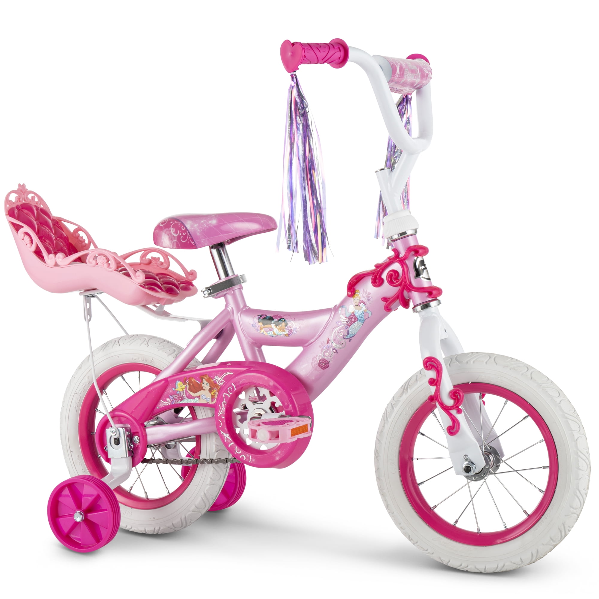 Enhance playtime fun with the Disney Princess 12″ Girls’ EZ-Build Pink Bike. It’s quick and easy to assemble and comes together in just four easy steps. Simply insert the training wheels, insert the handlebar and fork, fold down the pedals and insert the seat. Put on the finishing touches by connecting the carrier. Then, it’s ready for your child to enjoy riding around the neighborhood. This 12″ Disney princess bike with doll carrier flaunts sparkling pink and silver streamers with heart-shaped connectors. The grips and tires are embedded with a pretty heart pattern. This Huffy girls’ bike has a translucent chain guard and light pink frame that’s decorated with fan-favorite Disney princesses Ariel, Jasmine and Cinderella. It also includes wide training wheels and an easy-to-use coaster brake. From Huffy, We Make Fun!