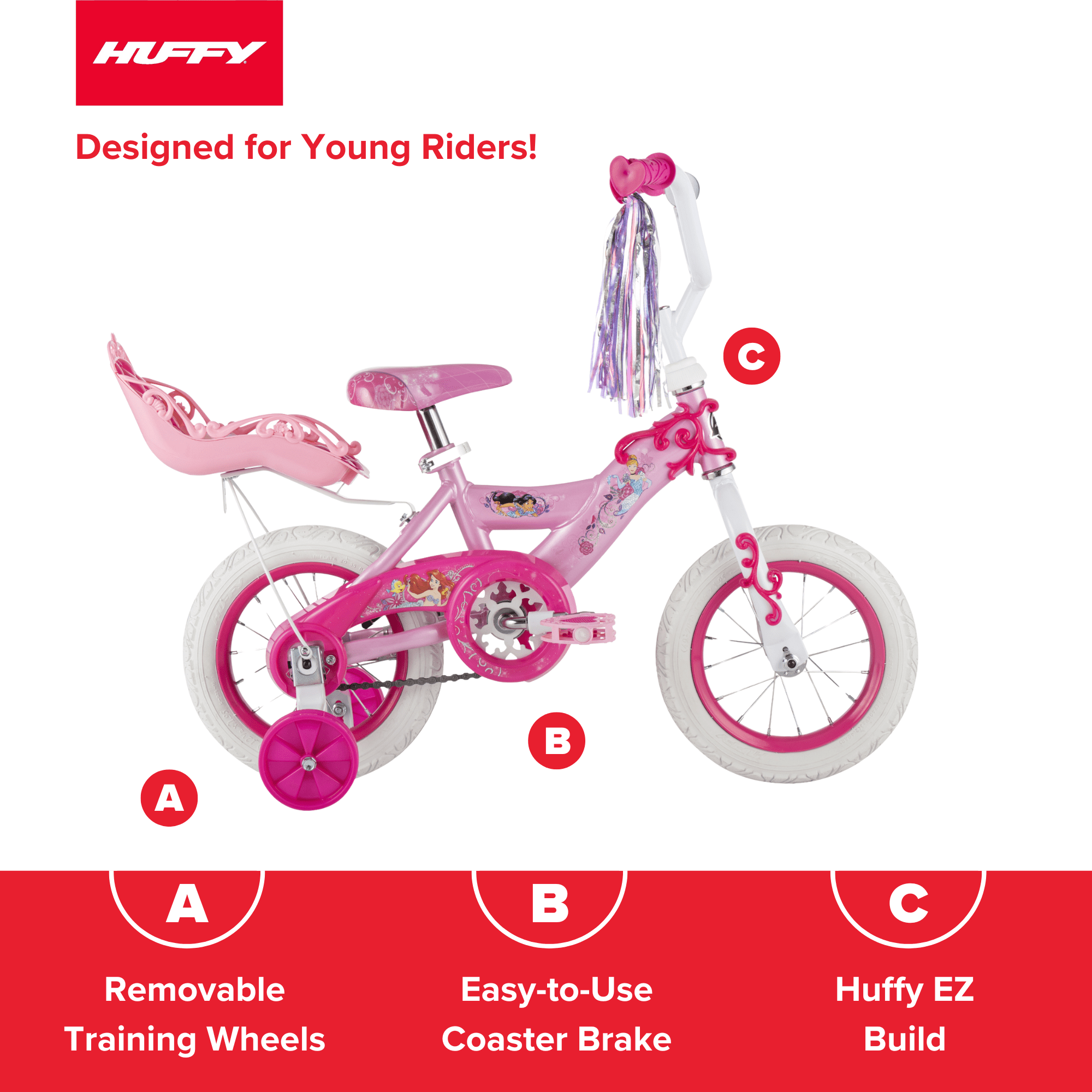 Huffy Disney Princess Kids Bike, 12″ Wheels, Ages 2-4 Years, Doll Carrier