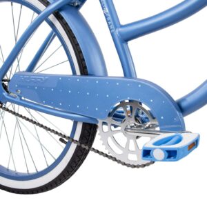 This 24″ cruiser bike in periwinkle blue has a stylish design and great features! This single-speed bike has an easy-to-use coaster brake. Dual density grips and pedals add to the comfort and style of this bike. Smooth-riding black cruiser tires with white sidewalls provide a great look with the blue wheel rims. Wide fenders redirect splashes from the ground to keep you dry.