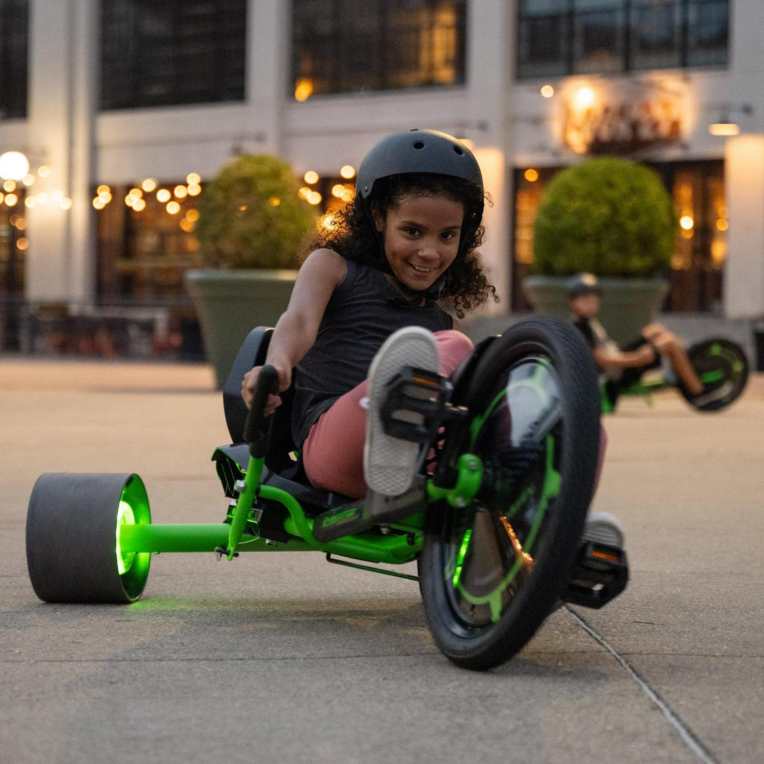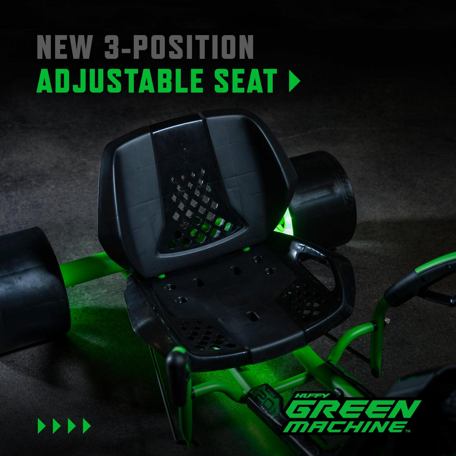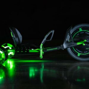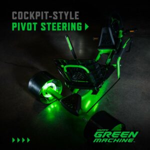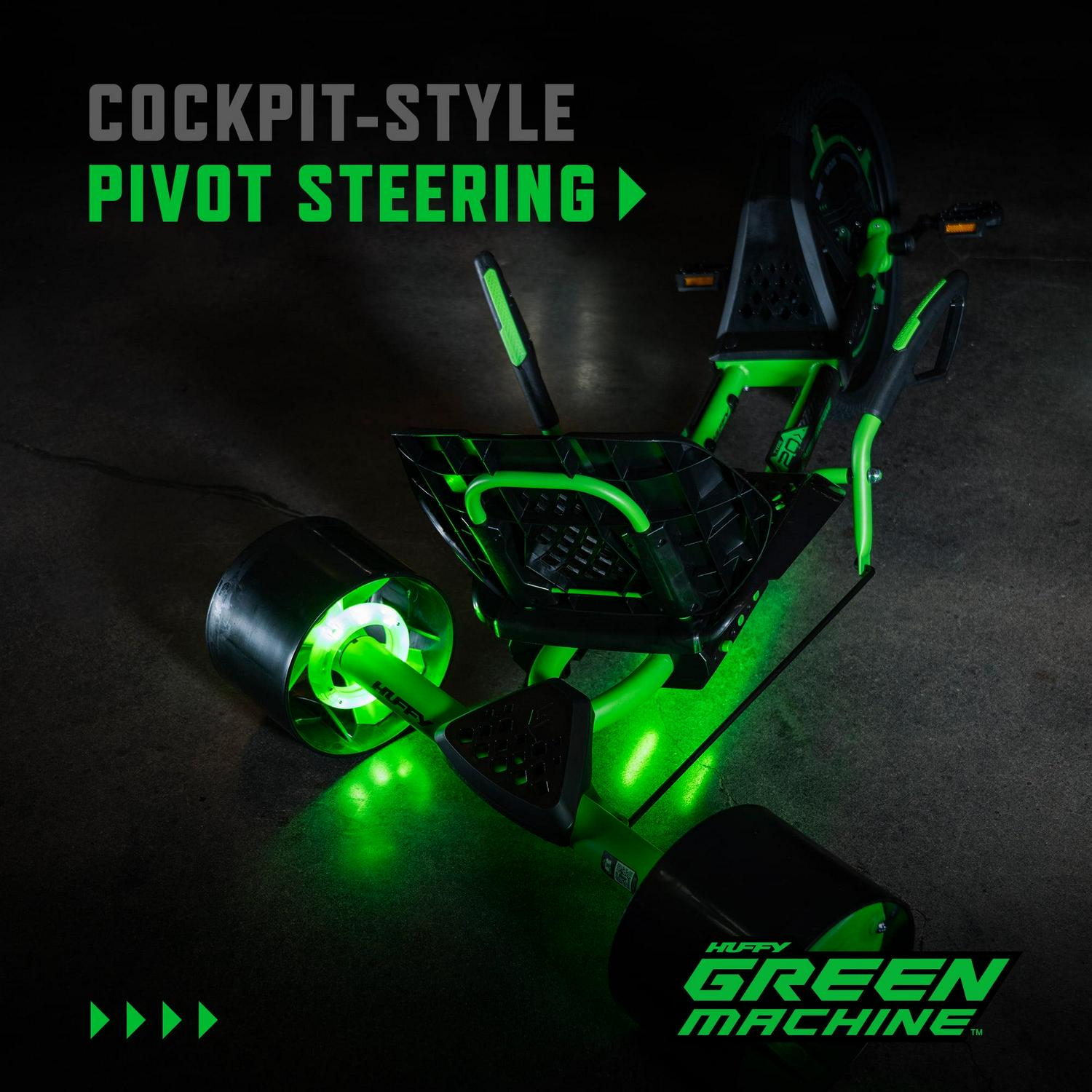 Calling all thrill seekers! Huffy has reimagined the classic 20-inch Green Machine for kids. The new Green Machine was designed to bring you a more thrilling ride whenever you get in the cockpit. The sleek green steel frame comes in features LED lights beneath the seat and in the rear wheels. Prepare to feel the thrills of 180-degree drifts, spins, and slides as you ride, engaging the dual steering levers and coaster brake for maximum fun. The redesigned saddle allows you to lean into the drifts as you steer but fear not you don t have to sacrifice comfort for thrill! From the hand grips to the seat, this Green Machine was designed with ergonomics in mind. The injection-molded rear wheels have longer life, better stability, and of course, better sliding power! The new 20-inch Huffy Green Machine is the classic 3-wheeler that parents know and love, reinvigorated and ready to give to the ones they love.