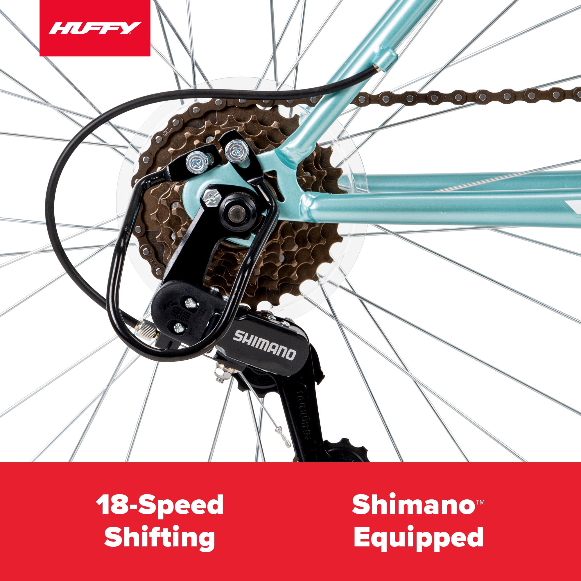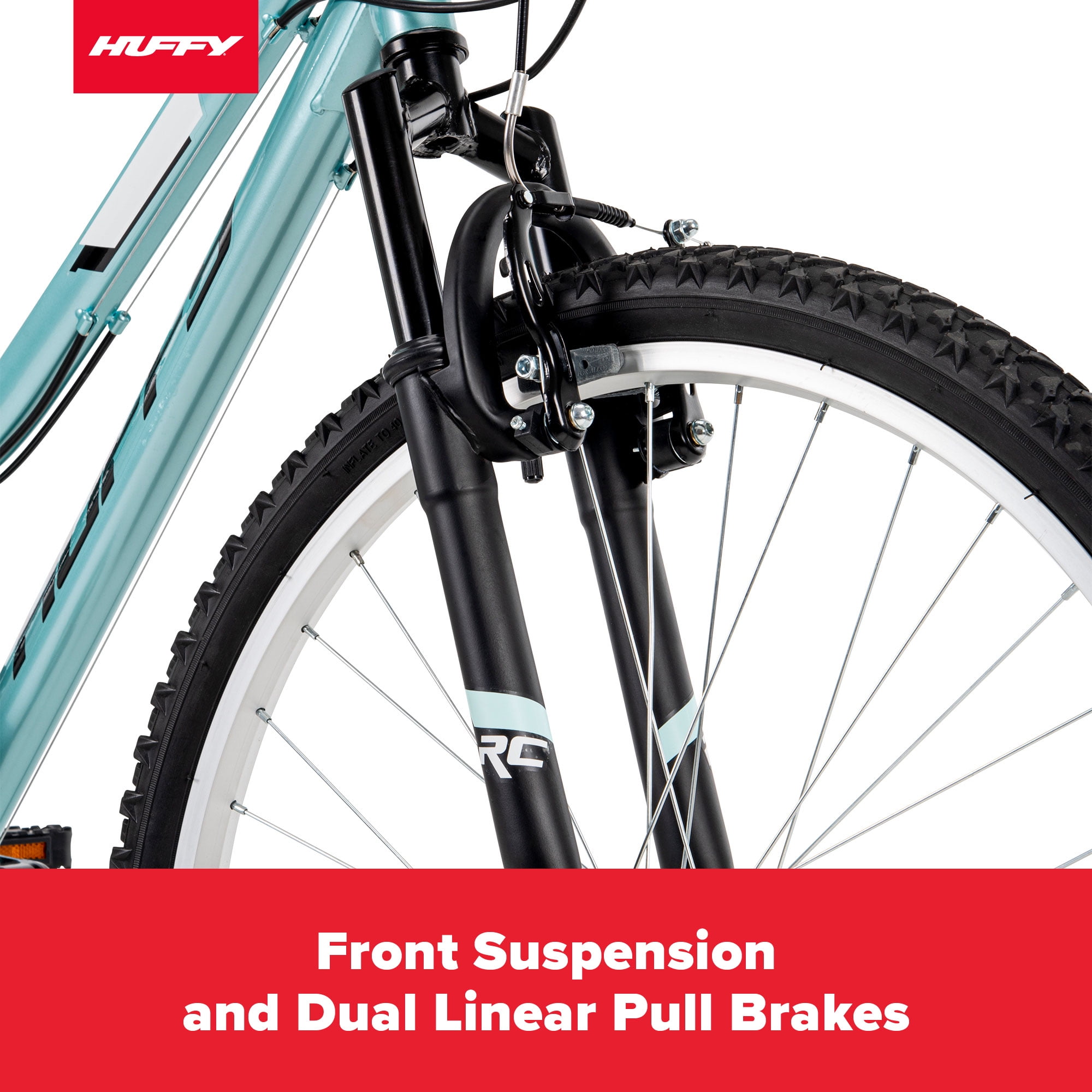 Huffy Rock Creek 18-Speed Mountain Bike, 26″ Wheels, Adults Ages 13+, Mint The Huffy Rock Creek 26-inch Mountain Bike in light sea crystal blue combines a hardtail frame, great style and the right specs to have a blast over bumps on paved trails or rides around the neighborhood. Smooth 18-speed index shifting system with a Shimano rear indexed derailleur consistently shifts between gears for quick adjustments venturing uphill or accelerating on level ground. Plus, the front suspension fork responds as you ride for better control over curbs, potholes, and branches. The slim ATB saddle includes an alloy quick-release seat binder for easy adjustments to the right height, or to simply remove when needed. Lightweight aluminum rims and 3-piece steel crank improve performance for a solid ride. Kraton MTB grips add comfort for a great hold while you enjoy the great ride of the Huffy Rock Creek. From Huffy, We Make Fun!
