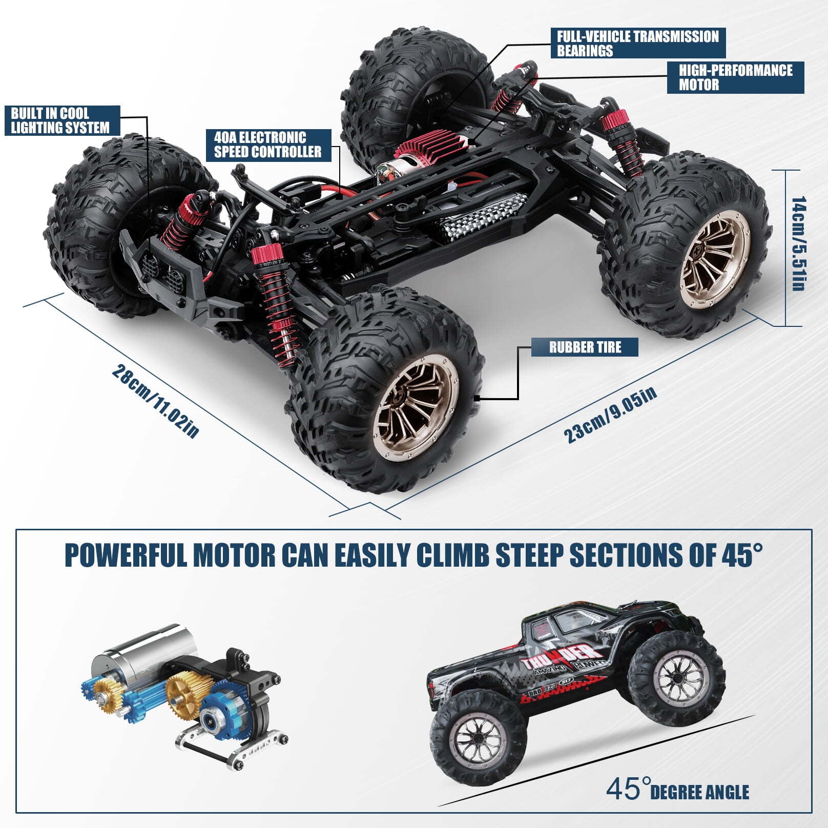 1:16 High Speed Remote Control Race Car: Powered by strong motor, this rugged radio controlled car can reach the speed of 40 km/h, which makes the rc crawler car race faster than others. Rechargeable and Long-lasting Batteries: Our RC car comes with two 7.4V/850mAh batteries, you can enjoy the fun of driving for about 30 mins (15 mins for each battery)after 2 hours full charged. It is the best choice for RC trucks enthusiast! 2.4Ghz Anti-interference Control: Adopted 2.4GHz technology, two or more radio controlled toy cars for kids can be racing at about 70 meters distance without signal interference. All-terrain Off Road Remote Control Truck: Designed with Anti-crash durable tires and mental shock absorbers, giving support to unexpected dropping and the unstable surface of the ground , the remote control truck for boys fits indoors and outdoors, running fast. Cool RC Car Gift for Kids: Our rc cars with remote control for kids respond to the control quickly and precisely, being the ideal toy gift for kids as their hobby RC cars. It is also a nice choice for any level monster RC trucks lovers.