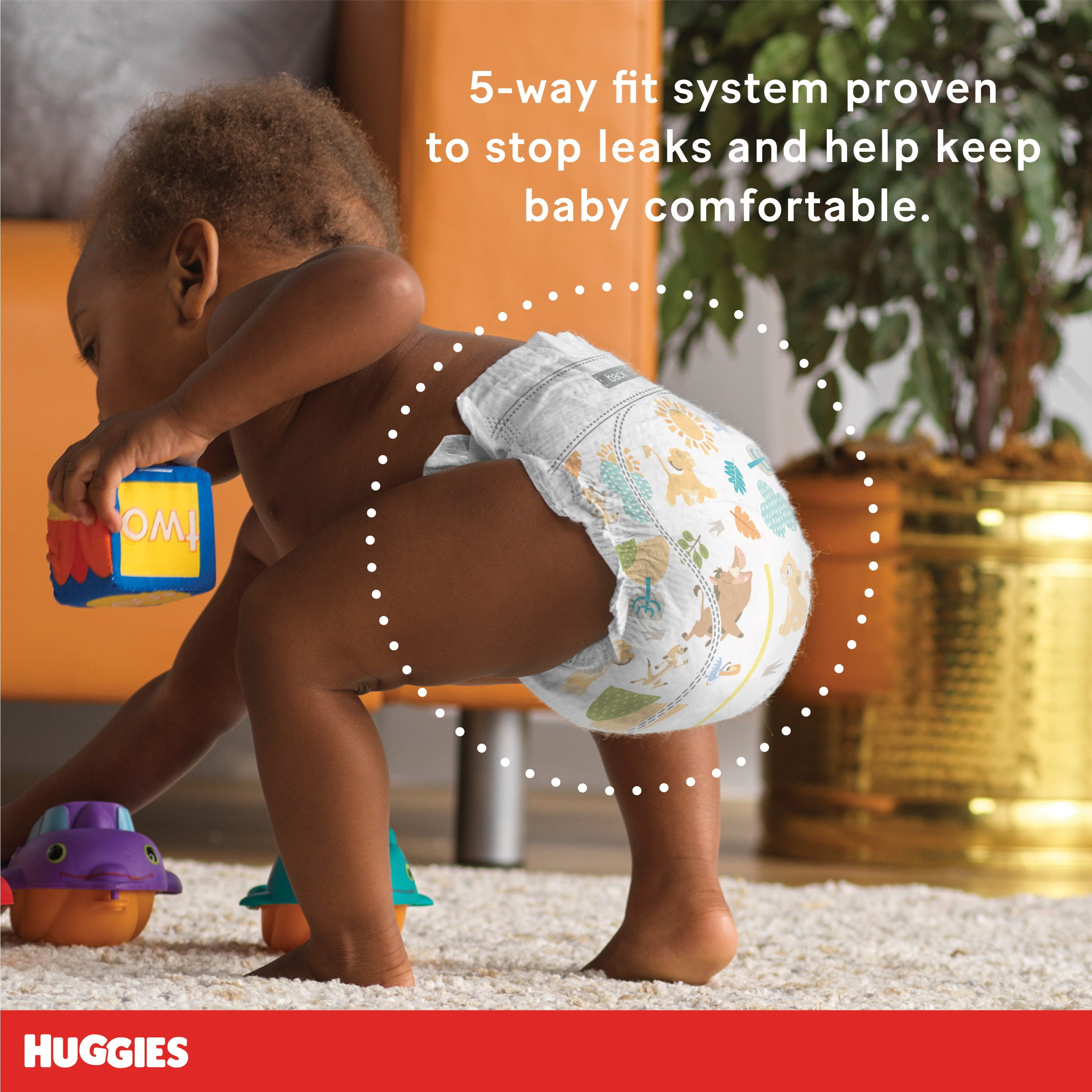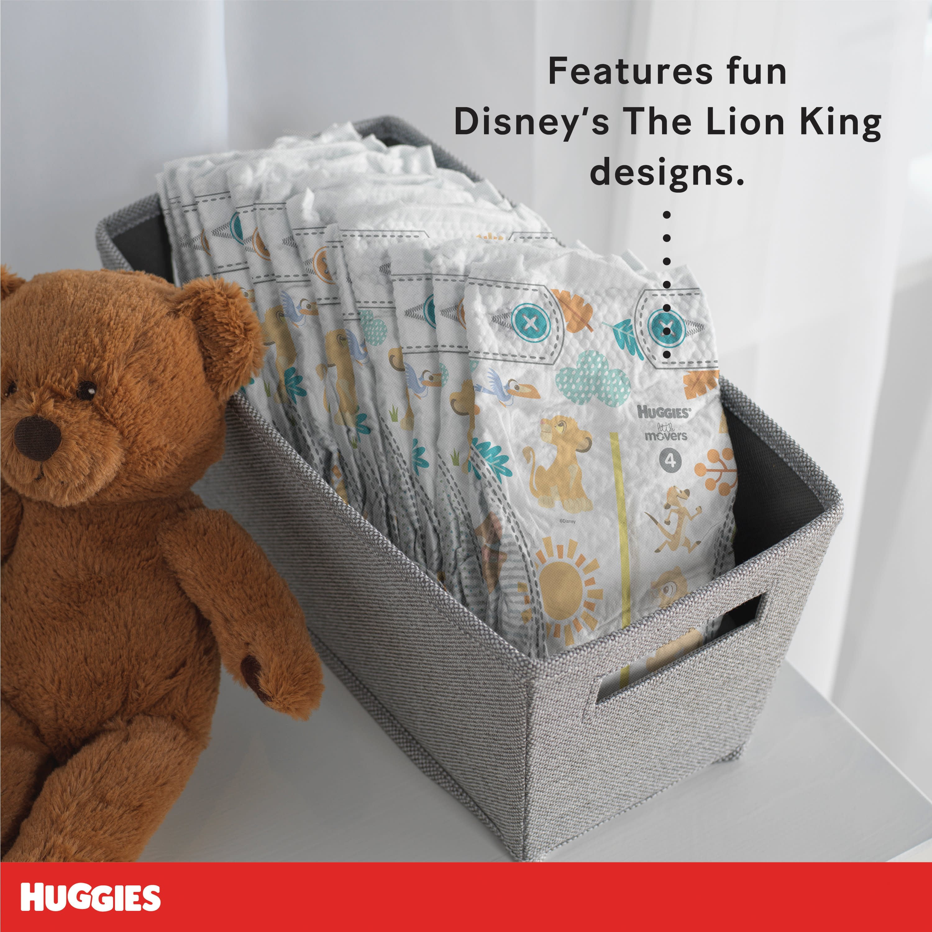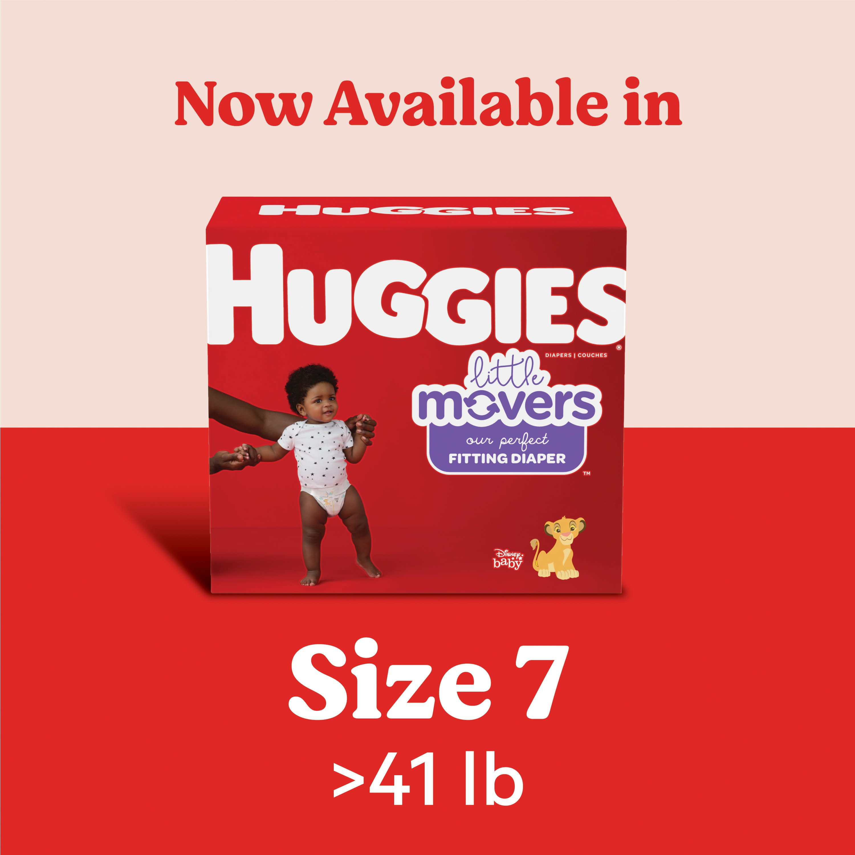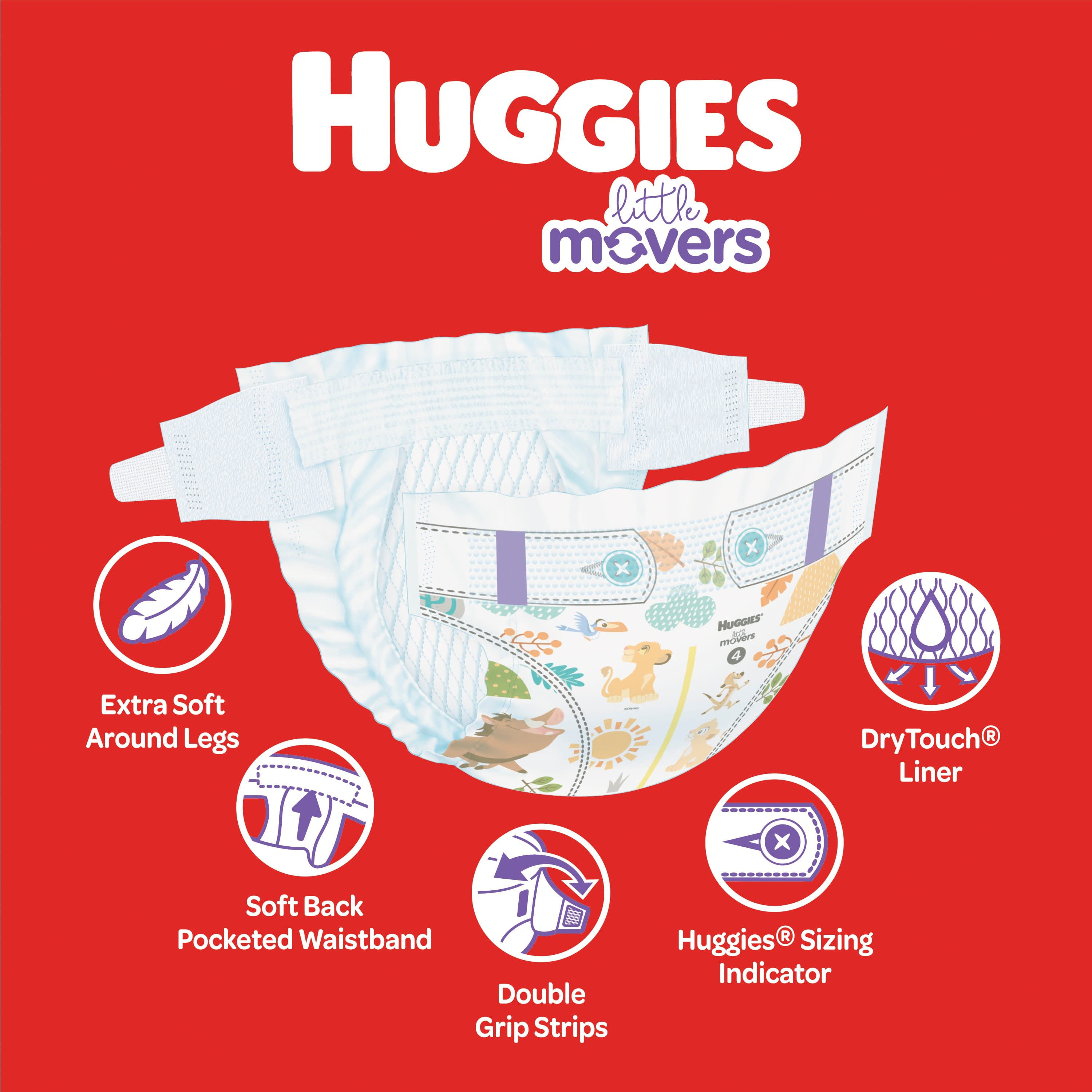 104 Huggies Little Movers Baby Diapers, size 5 (27+ lbs); packaging may vary The #1 Best Fitting Diaper*: Made with a contoured shape to move with your baby and virtually eliminate leaks for worry-free running, jumping and playing Designed for Comfort: SnugFit Waistband and Double Grip Strips keep the diaper in place while your baby is crawling, moving or walking DryTouch Liner: Baby diaper locks away 99% wetness and helps prevent leaks for up to 12 hours to help keep your baby’s skin dry and healthy Wetness Indicator: A yellow line changes to blue when wet, easily letting you know when it’s time for a diaper change Huggies’ SizeUp indicator lets you know when your baby needs to move to the next size diaper Safe for Sensitive Skin: Disposable baby diapers are fragrance free, lotion free, paraben free, and free of elemental chlorine and natural rubber latex The only diaper brand to feature Disney’s The Lion King designs