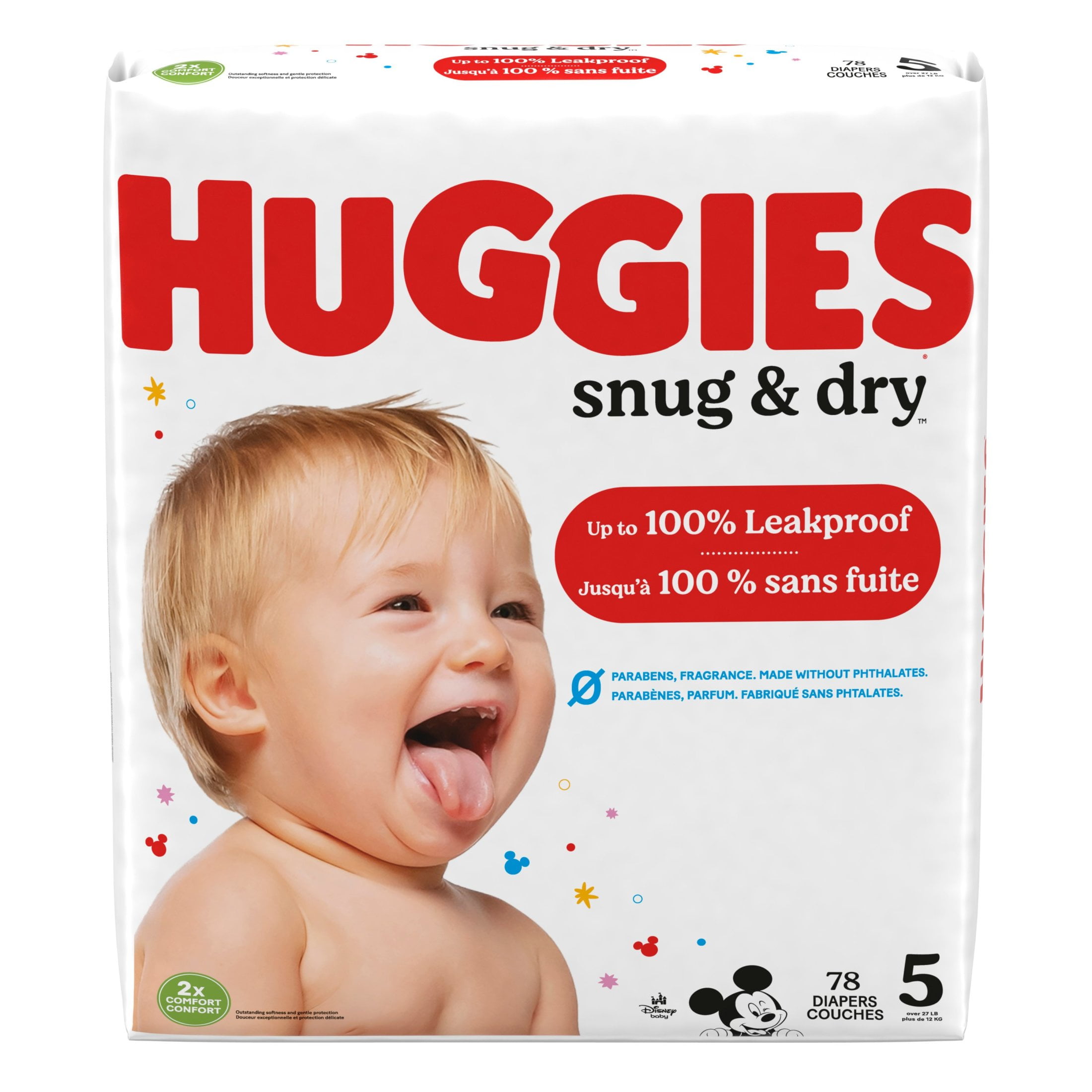Huggies Snug & Dry Diapers: 156 Snug & Dry Baby Diapers, size 5 (27+ lbs) New & Improved Snug & Dry disposable diapers are up to 100% leakproof – even from blowouts The only leading brand entirely fragrance free*: Snug & Dry baby diapers are made free of fragrances, added lotions, parabens and natural rubber latex (*among leading national diaper brands, across all offered variants) The only brand with a blowout blocker across all our offerings**(**among branded open diapers. Excludes preemie size.) Curved and stretchy fit: Huggies Snug & Dry disposable diapers have a curved fit for outstanding leakage protection 2X Comfort: Our diapers are designed to provide outstanding softness and gentle protection Wetness indicator: Added wetness indicator lets you know when it’s time to change Exclusive Disney designs Exclusive Disney designs