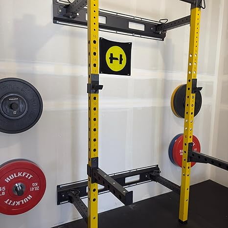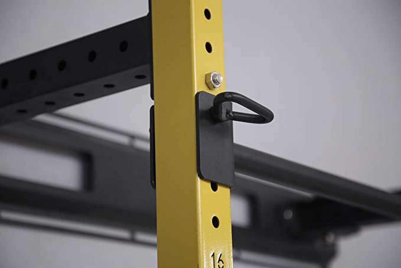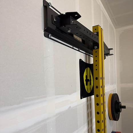 Add our space saving Wall Mounted Power Rack to your home gym fitness equipment collection. Designed to help you push your workouts toward your maximum potential with minimal space required. Requires mounting stringers onto drywall studs or concrete because it increases structural strength of the cage and will increase the weight capacity. This cage is painted yellow and black with a powder coated finish that reduces the risk of rusting. It folds away with a 4 way pin locking mechanism. The upright poles measure 2.35” x 2.35” x 86” and feature standard 2” hole to hole spacing. High density, rubberized feet help support the unit and reduce the risk of damage to your floor. Athletes and fitness enthusiasts can enjoy the benefits of body weight and strength training all in one package. Deadlifts, squats, lunges, and bench presses are a few weightlifting exercises you can do. Train for bodybuilding, , Powerlifting, Strongman, Strongwoman, Martial Arts, and more. We recommend adding Pro Series Spotter Arms, Y or U Dip Bars, Wall Mounted Barbell Storage, and more J Hooks to your rack for a more complete workout. The total weight capacity of this unit is 1,000 lbs.