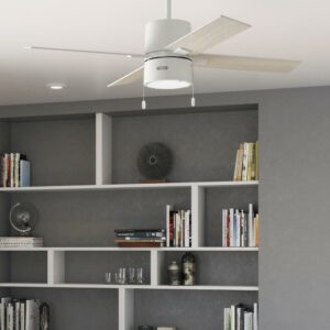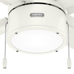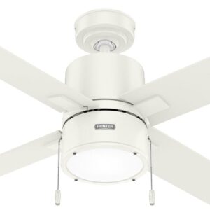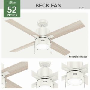 Hunter Fans-51744-Collection: Beck, Material: Glass, Finish Color: Fresh White, Blade Span: 52″, Blade Color: Light Oak, Number Of Blades: 4, Blade Pitch: 13 , Fan Motor Size: 172×20 mm, Fan Motor Type: AC, Hanging Method: Stem, Stem Rod Number And Lengths Included: 1-2, 1-4, Light Kit Type: Included, Lamping Type: LED, Cri: 80, Color Temperature: 3000 Kelvin, Control Type: Pull Chain, Wet Location: Dry Rated, Desc: The Beck modern ceiling fan with LED light has a simple design with clean finishes to freshen up your indoor spaces. Available in a variety of finishes, this large ceiling fan will complement your style from farmhouse bedrooms to modern home offices. Use the included pull chains to easily turn the light on and off as well as to adjust the fan speed. The Beck comes with our WhisperWind motor technology to deliver the powerful, efficient airflow you expect while maintaining whisper-quiet performance. Exclusive SureSpeed Guarantee Rated for indoor use only 2 bulbs included Pull chains included AIRFLOW YOU FEEL: Built with our SureSpeed Guarantee to deliver over 33% higher air velocity than leading competitors* while maintaining quiet, wobble-free performance. WHISPER-QUIET MOTOR: 3-speed, WhisperWind reversible motor for optimal performance in summer and winter. LARGE ROOM FAN: Ideal size for spaces like living rooms and bedrooms. STANDARD PROFILE MOUNTING: 2 inch and 4 inch downrods included. COMPATIBLE ACCESSORIES: Works with Hunter and Casablanca accessories, not including Hunter Original accessories WARRANTY: Limited Lifetime Motor Warranty backed by the only company with over 135 years in the fan business Assembly Required: Yes / Mounting Direction: Down / Canopy Included: Yes / Canopy Diameter: 6.49 / Sloped Ceiling Adaptable: Yes / Rod Length(s): 1-2, 1-4 / Dimable: Yes / Shade Included: Yes. ,-Beck – 4 Blade Ceiling Fan with Light Kit and Pull Chain In Modern Style-17.23 Inches Tall and 52 Inches Wide