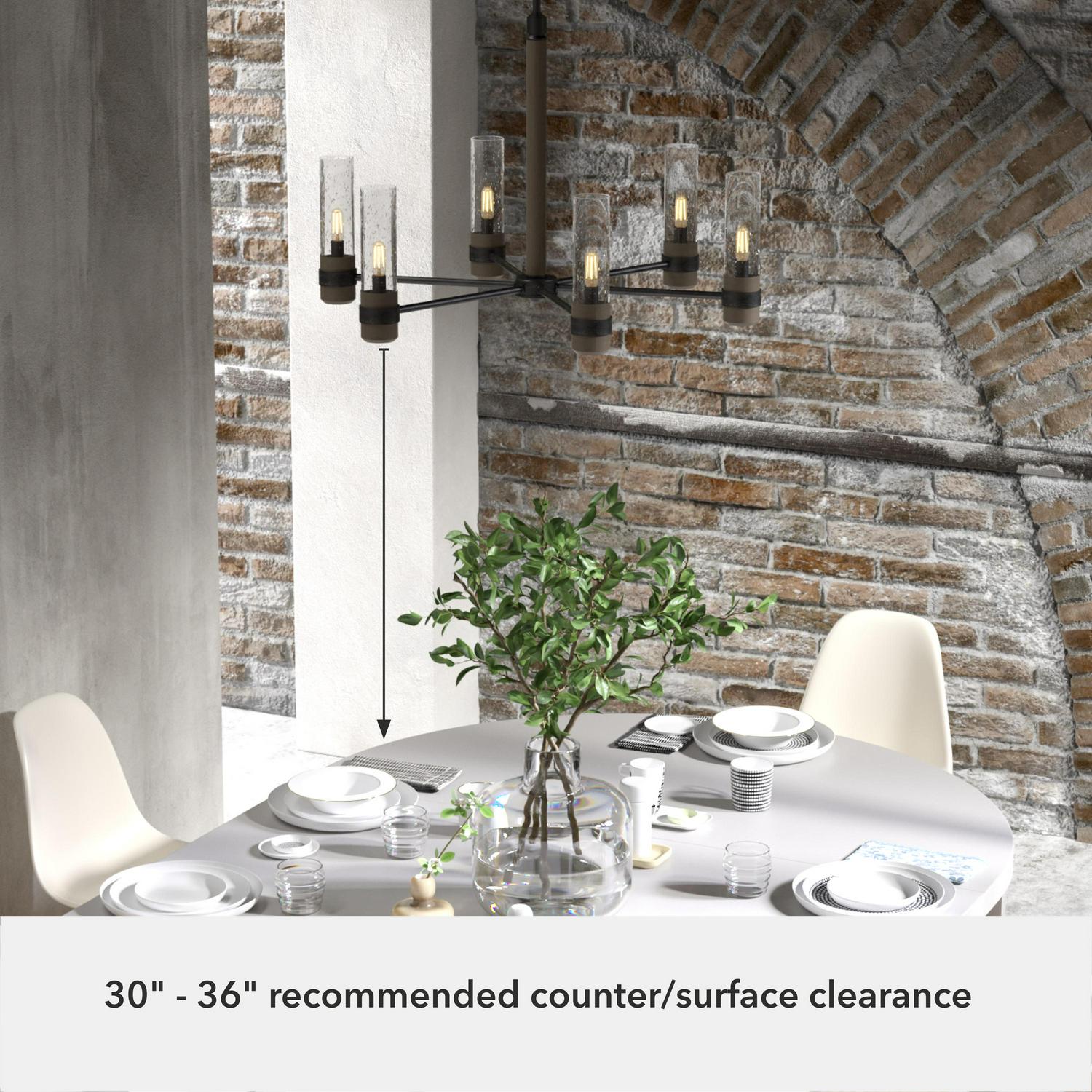 A classic is reimagined in the River Mill 6 light chandelier. With rustic charm and a modern edge, you will delight in the glow of this fixture. The balance of metal, seeded glass, and wood-inspired finishes harkens to a modern mountain lodge. Spread the charm throughout your home with other lights from the River Mill collection.