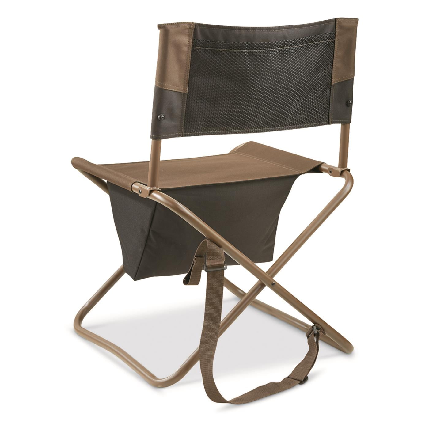 Powder-coated steel frame High back design Folds up flat for easy carrying 15″w. zippered storage bag 15″w. x 8″h. mesh storage pocket on back 250-lb. weight capacity Weighs just 7 lbs.
