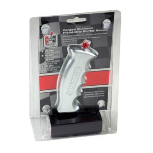CNC machined from solid billet aluminum and clear aluminum finish, the Hurst Billet/Plus Pistol Grip shift handle is designed to provide a firm comfortable natural grip when shifting, allowing less chance of your hand slipping and missing a shift. Now with snap action for instant activation, this handle is ideal for use with Hurst Roll/Control, trans brake, NOS systems or other 12 volt accessories.;