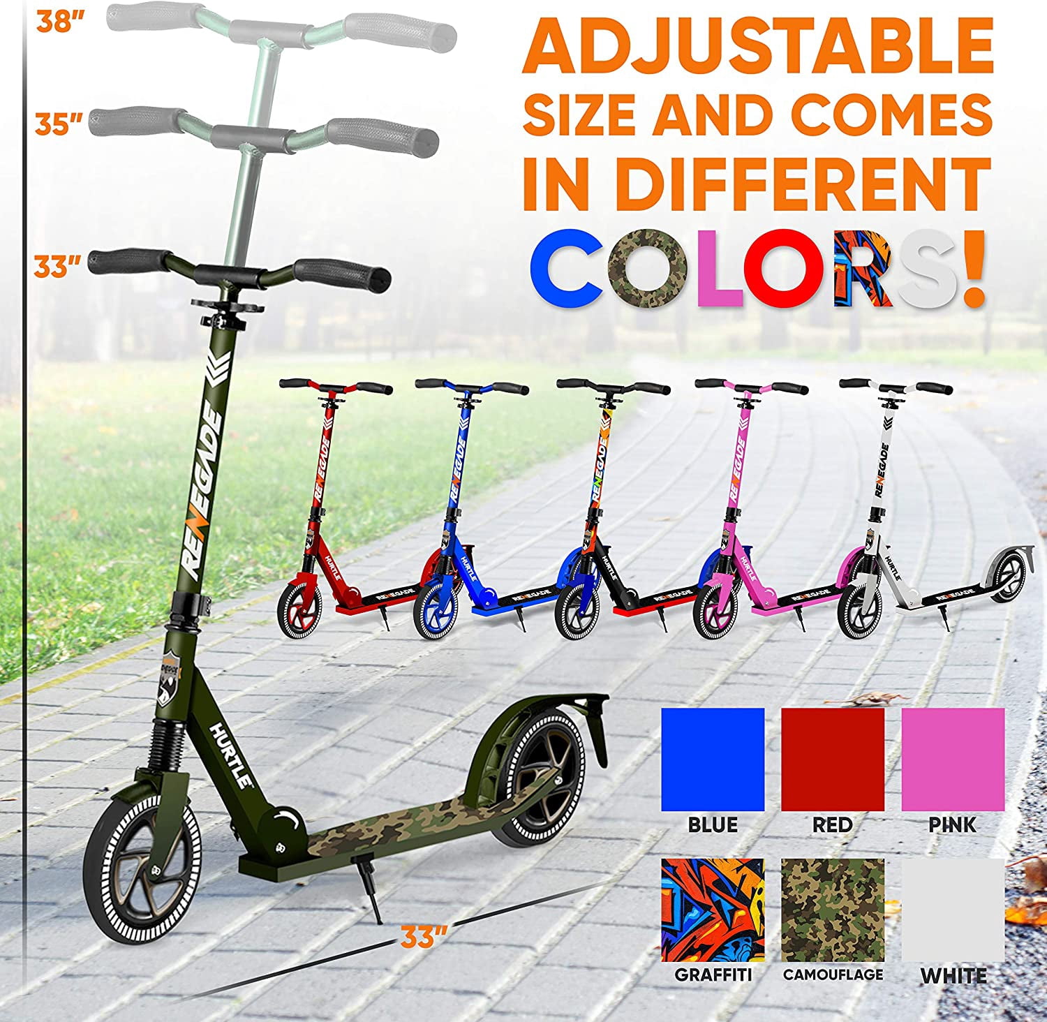 Hurtle Fitness HURTSCA Lightweight and Foldable Kick Scooter – Adjustable Scooter for Teens and Adult, Alloy Deck with High Impact Wheels (Camo)