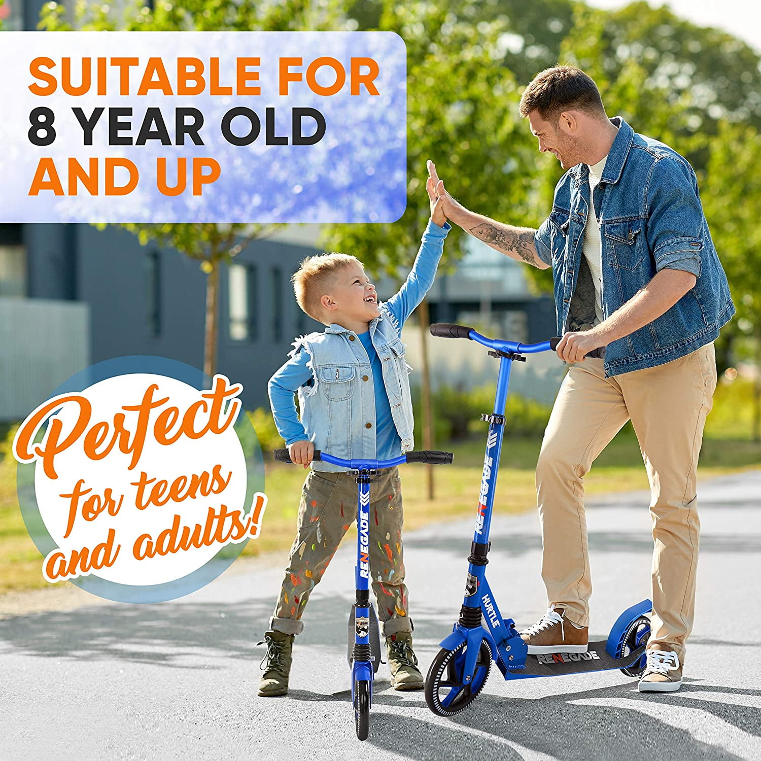 When you need to get from point A to point B, but don’t want to break the bank on gas, the Hurtle Renegade Kick Scooter will get you where you need to go. Designed for kids, teens, and adults, this commuter scooter is recommended for ages 8 years old and up. Built with a 2-wheel standard kick scooter design, this commuter is easy for all ages to ride. The comfortable T-bar handlebars feature 3 height adjustments that allow you to customize riding height and enhance comfort. The extended non-slip standing deck gives you plenty of room for both of your feet as you glide towards your destination. Once you’ve arrived, effortlessly fold the lightweight scooter for safe storage and transportation. For added stability and durability, the smooth, high-impact riding wheels are compatible with a variety of surfaces. Safe to ride inside or out, the Hurtle Renegade Kick Scooter for Teens and Adults is easy and fun to ride for all ages up to 220 pounds.