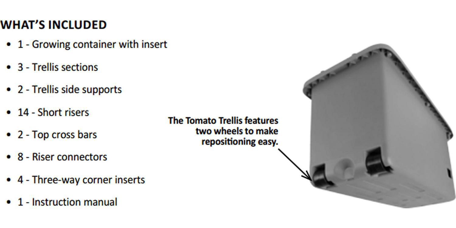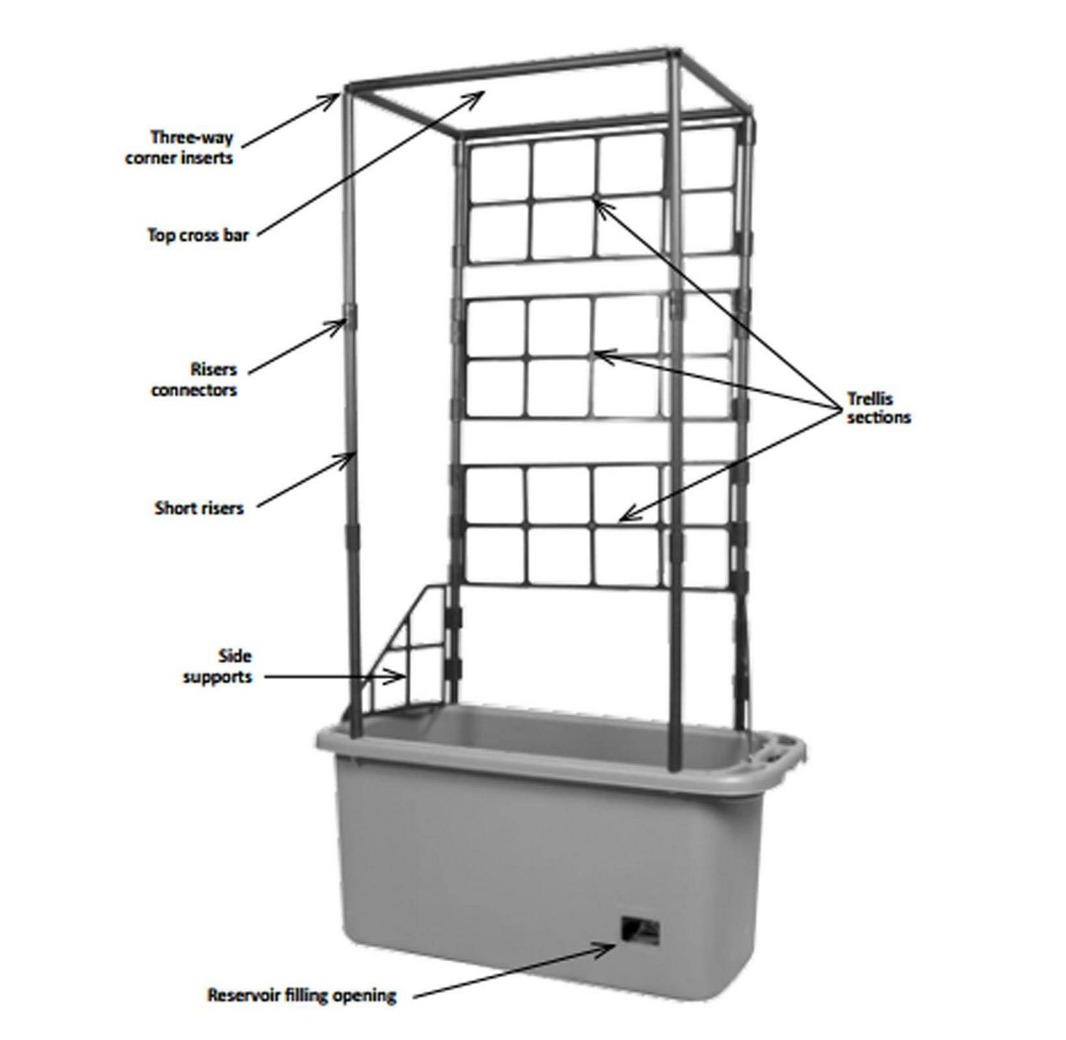 – Includes: Growing container with insert, 3 trellis sections, 2 trellis side supports, 14 short risers, 2 top cross bars, 8 riser connectors, 4 3-way corner inserts