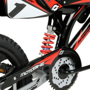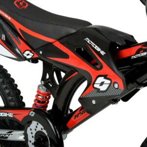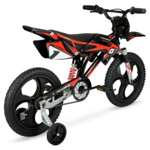 The Hyper Mag Wheel Motobike is the unforgettable children s unisex bicycle. With hi-impact mag wheels, authentic Hyper graphics, fenders, and a cool superbike-style saddle, this is the coolest kids’ bike to hit the streets. It’s built with a sturdy steel over-sized frame, steel handlebar, 16-inch rims, removable training wheels, and knobby tires. Standard size pedals and front brakes ensure an easy way to stop. Being a single speed bike, there are no complicated gears to maintain or untangle. It’s easy to assemble and has a max rider weight of 100 pounds. It s fully loaded with everything they ll need to get around safe and in style.