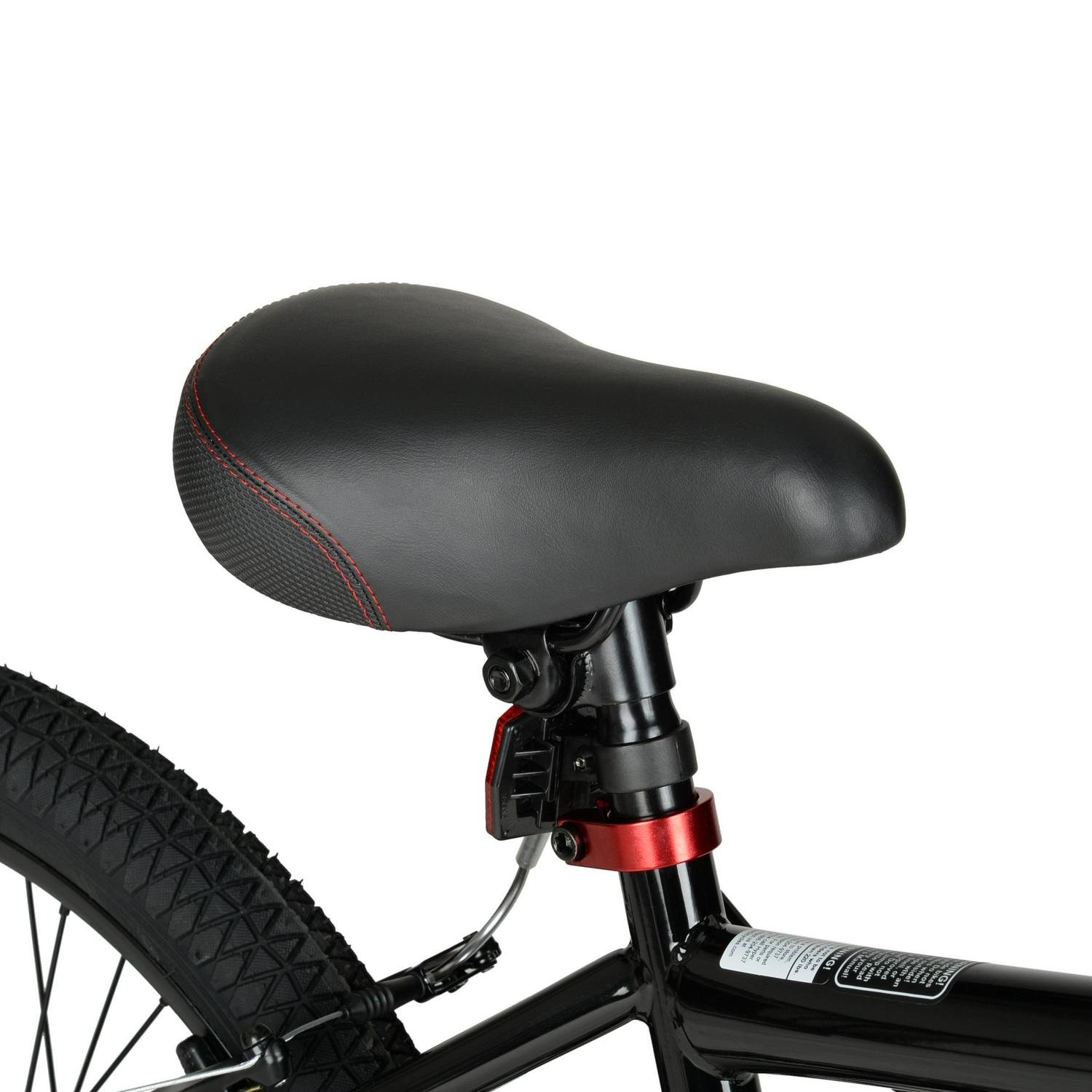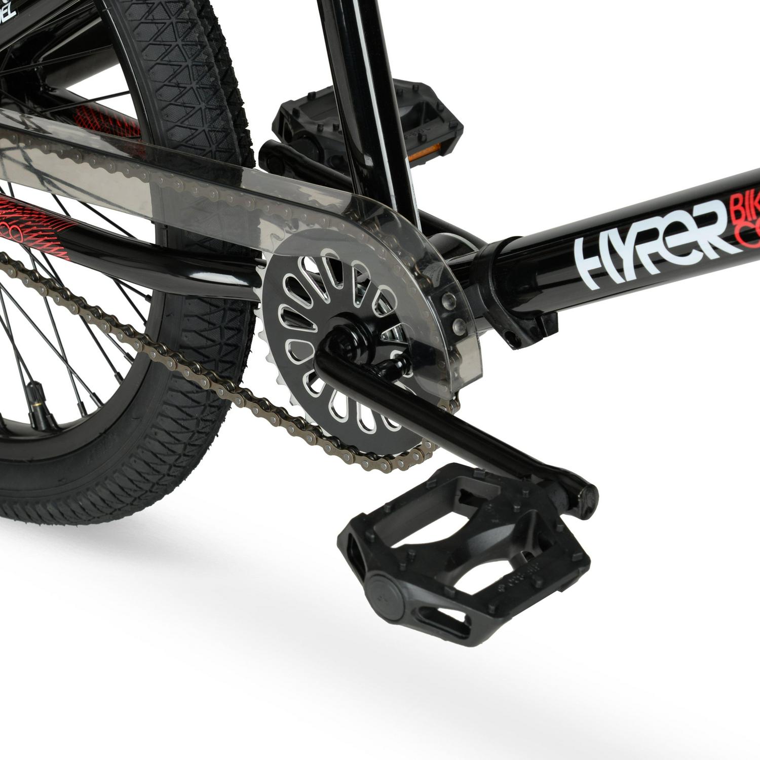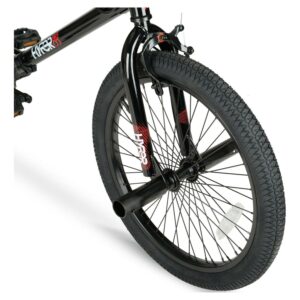 The coolest children ride in style with the Hyper Bicycles 20″ boy’s spinner BMX bike in black. This BMX bike features a heavy-duty steel frame that lets users ride harder for longer. The spinner includes both front caliper and v-brakes for a smooth ride on any surface and front and rear hand breaks for convenience and safety. With sturdy 48 spoked rims and front and rear pegs, this BMX bike has all the right accessories. Designed with your comfort in mind, it features a deluxe padded seat, gripped handlebars, and standard pedals. This BMX bike has a sleek, black design with red accents that provides a modern look. The bike can be ridden on a variety of surfaces, allowing for flexibility in where you go with it. Perfect for experimenting with tricks or weekend rides, the hyper spinner BMX bike will help make your rides more enjoyable.